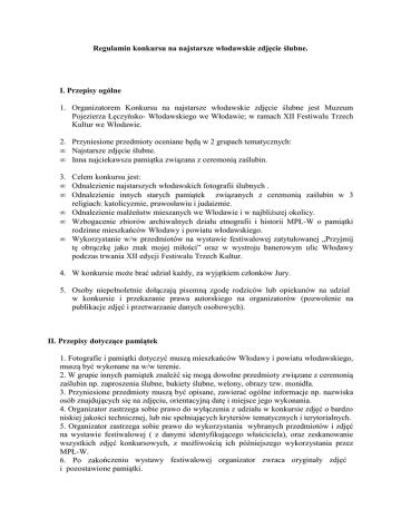 Regulamin konkursu na najstarsze włodawskie zdjęcie ślubne. I. Przepisy ogólne 1. Organizatorem Konkursu na najstarsze włodawskie zdjęcie ślubne jest Muzeum Pojezierza Łęczyńsko- Włodawskiego we Włodawie; w ramach XII Festiwalu Trzech Kultur we Włodawie. 2. Przyniesione przedmioty oceniane będą w 2 grupach tematycznych: • Najstarsze zdjęcie ślubne. • Inna najciekawsza pamiątka związana z ceremonią zaślubin. 3. Celem konkursu jest: • Odnalezienie najstarszych włodawskich fotografii ślubnych . • Odnalezienie innych starych pamiątek związanych z ceremonią zaślubin w 3 religiach: katolicyzmie, prawosławiu i judaizmie. • Odnalezienie małżeństw mieszanych we Włodawie i w najbliższej okolicy. • Wzbogacenie zbiorów archiwalnych działu etnografii i historii MPŁ-W o pamiątki rodzinne mieszkańców Włodawy i powiatu włodawskiego. • Wykorzystanie w/w przedmiotów na wystawie festiwalowej zatytułowanej „Przyjmij tę obrączkę jako znak mojej miłości” oraz w wystroju banerowym ulic Włodawy podczas trwania XII edycji Festiwalu Trzech Kultur. 4. W konkursie może brać udział każdy, za wyjątkiem członków Jury. 5. Osoby niepełnoletnie dołączają pisemną zgodę rodziców lub opiekunów na udział w konkursie i przekazanie prawa autorskiego na organizatorów (pozwolenie na publikacje zdjęć i przetwarzanie danych osobowych). II. Przepisy dotyczące pamiątek 1. Fotografie i pamiątki dotyczyć muszą mieszkańców Włodawy i powiatu włodawskiego, muszą być wykonane na w/w terenie. 2. W grupie innych pamiątek znaleźć się mogą dowolne przedmioty związane z ceremonią zaślubin np. zaproszenia ślubne, bukiety ślubne, welony, obrazy tzw. monidła. 3. Przyniesione przedmioty muszą być opisane, zawierać ogólne informacje np. nazwiska osób znajdujących się na zdjęciu, orientacyjną datę i miejsce jego wykonania. 4. Organizator zastrzega sobie prawo do wyłączenia z udziału w konkursie zdjęć o bardzo niskiej jakości technicznej, lub nie spełniających kryteriów tematycznych i terytorialnych. 5. Organizator zastrzega sobie prawo do wykorzystania wybranych przedmiotów i zdjęć na wystawie festiwalowej ( z danymi identyfikującego właściciela), oraz zeskanowanie wszystkich zdjęć konkursowych, z możliwością ich późniejszego wykorzystania przez MPŁ-W. 6. Po zakończeniu wystawy festiwalowej organizator zwraca oryginały zdjęć i pozostawione pamiątki. 7. Udział w konkursie jest jednoznaczny z nieodpłatnym udzieleniem prawa do nieodpłatnego wykorzystania zdjęć i pamiątek na wydawanych przez muzeum materiałach (katalog wystawy, informacje o wystawie i konkursie w prasie czy na stronie internetowej, wydruk zdjęć na banerach.). 8. Udział w konkursie jest jednoznaczny z wyrażeniem przez osoby uczestniczące zgody na przetwarzanie przez organizatora ich danych osobowych na potrzeby konkursu oraz w celach marketingowych organizatora (ustawa o ochronie danych osobowych z dn.29.08.1997r.Dz. U.Nr 133 poz.833 z póz. zm). III. Terminarz 1. Termin przynoszenia zdjęć i pamiątek mija 30 czerwca 2011r. 2. Zwycięzców konkursu wyłoni Jury , powołane przez organizatora. 3. Rozstrzygnięcie konkursu odbędzie się 4 lipca 2011r. 4. Organizatorzy przewidują dwie główne nagrody pieniężne po 500zł oraz nagrody specjalne. Podział nagród może ulec zmianie. 5. Zwycięzcy konkursu zostaną powiadomieni przez organizatorów telefonicznie. 6. Uroczyste wręczenie nagród nastąpi 9 września 2011 r. w pierwszym dniu Festiwalu Trzech Kultur; na otwarciu wystawy festiwalowej „Przyjmij tę obrączkę, jako znak mojej miłości”. Organizator zastrzega sobie prawo do przerwania lub odwołania konkursu. Kontakt: Muzeum Pojezierza Łęczyńsko- Włodawskiego we Włodawie 22-200 Wlodawa, ul. Czerwonego krzyża 7 tel. (82) 5722-178 www.muzeumwlodawa.pl [email protected] Małgorzata Podlewska- Bem kom. 506 148 880