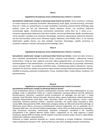 Klasa I Zagadnienia do poprawy oceny niedostatecznej z historii ( I semestr) Sprawdzenie wiadomości nastąpi na pierwszej lekcji historii po feriach. Uczeo wymienia i wskazuje na mapie najstarsze cywilizacje wschodnie: Mezopotamię, Izrael, Egipt, starożytną Grecję, starożytny Rzym ok. I wieku ne. podział Rzymu na częśd wschodnią i zachodnią, paostwo Karola Wielkiego, jego podział, uczeo wie kim był Hammurabi, Dawid, Salomon, faraon, zna strukturę społeczną starożytnego Egiptu, charakteryzuje wychowanie spartaoskie, ustrój Aten ok. V wieku p.n.e. , wymienia najważniejsze dokonania kulturalne Greków, wie kim był Aleksander Wielki, charakteryzuje ustrój republiki rzymskiej oraz Cesarstwa Rzymskiego, wymienia najważniejsze dokonania Rzymian, wie kim byli Hannibal, Juliusz Cezar, Oktawian August, Mahomet, Karol Wielki, Otto I, II i III, omawia okoliczności upadku Rzymu, zna daty podziału Cesarstwa Rzymskiego, upadku cesarstwa na zachodzie, traktatu w Verdun, koronacji Karola Wielkiego, Otto I. Klasa II Zagadnienia do poprawy oceny niedostatecznej z historii ( I semestr) Sprawdzenie wiadomości nastąpi na pierwszej lekcji historii po feriach. Uczeo wie jakie zmiany w życiu człowieka spowodowało wynalezienie druku, wskazuje trasy podróży i odkrywców nowych kontynentów i drogi do Indii, wyjaśnia znaczenie odkryd geograficznych, zna przyczyny reformacji, wymienia główne nurty protestanckie i ich twórców, wie, jak kształtowały się przywileje szlacheckie, ocenia sytuację Polski na przełomie XVII/XVIII wieku, charakteryzuje kulturę odrodzenia i baroku, wymienia ich twórców i dzieła, przy pomocy mapy omawia sytuację Polski pod panowaniem Wazówkonflikty ze Szwecją, paostwem moskiewskim, Turcją , Kozakami (daty i miejsca bitew, rozejmów i ich postanowienia). Klasa III Zagadnienia na poprawę oceny niedostatecznej z historii (I semestr) Sprawdzenie wiadomości nastąpi na pierwszej lekcji po feriach Uczeo przedstawia różnice w poziomie cywilizacyjnym terenów II RP( 1918-1939),wyjaśnia na czym polegały trudy w odbudowie Polski po I wojnie światowej, wymienia główne kierunki polityczne (konserwatyzm, liberalizm, socjalizm)i potrafi przedstawid ich ideologię, wie kim byli i z czego zasłynęli: Józef Piłsudski, Roman Dmowski, Wincenty Witos, Ignacy Paderewski, Gabriel Narutowicz, Stanisław Wojciechowski, Józef Beck, Hitler, Mussolini, Stalin; zna datę wybuchu i kooca I wojny światowej; wymienia paostwa ententy i paostwa centralne; zna wynik wojny domowej w Rosji, nazwę ZSRR, datę powstania ZSRR, okoliczności przejęcia władzy we Włoszech przez Mussoliniego, w Niemczech przez Hitlera, przyczyny prześladowania ludności żydowskiej, wie co wydarzyło się 11 listopada 1818 roku, zna warunki traktatu pokojowego z marca 1921,zna datę przewrotu majowego, , datę konstytucji marcowej, kwietniowej, wymienia mniejszości narodowe II RP, nazwiska prezydentów II RP, żądania Niemiec wobec Polski i odpowiedź na nie, datę wybuchu II wojny światowej, agresji ZSRR na Polskę, potrafi wyjaśnid znaczenie prostych pojęd: faszyzm, hiperinflacja, totalitaryzm, plebiscyt, eksterytorialny. Wskazuje na mapie: paostwa powstałe po I wojnie światowej w Europie Środkowo- Wschodniej, etapu kształtowania się granic II RP, granicę Polski po roku 1922, przebieg kampanii wrześniowej.
