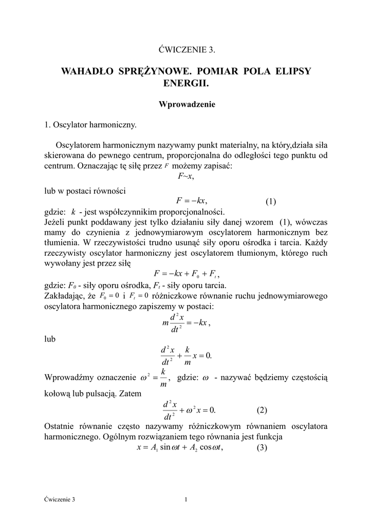 ĆWICZENIE 3. WAHADŁO SPRĘŻYNOWE. POMIAR POLA ELIPSY ENERGII. Wprowadzenie 1. Oscylator harmoniczny. Oscylatorem harmonicznym nazywamy punkt materialny, na który,działa siła skierowana do pewnego centrum, proporcjonalna do odległości tego punktu od centrum. Oznaczając tę siłę przez F możemy zapisać: F~x, lub w postaci równości F = − kx , (1) gdzie: k - jest współczynnikim proporcjonalności. Jeżeli punkt poddawany jest tylko działaniu siły danej wzorem (1), wówczas mamy do czynienia z jednowymiarowym oscylatorem harmonicznym bez tłumienia. W rzeczywistości trudno usunąć siły oporu ośrodka i tarcia. Każdy rzeczywisty oscylator harmoniczny jest oscylatorem tłumionym, którego ruch wywołany jest przez siłę F = − kx + F0 + Ft , gdzie: F0 - siły oporu ośrodka, Ft - siły oporu tarcia. Zakładając, że F0 = 0 i Ft = 0 różniczkowe równanie ruchu jednowymiarowego oscylatora harmonicznego zapiszemy w postaci: d2x m 2 = − kx , dt lub d2x k + x = 0. dt 2 m k Wprowadźmy oznaczenie ω 2 = , gdzie: ω - nazywać będziemy częstością m kołową lub pulsacją. Zatem d2x (2) + ω 2 x = 0. 2 dt Ostatnie równanie często nazywamy różniczkowym równaniem oscylatora harmonicznego. Ogólnym rozwiązaniem tego równania jest funkcja x = A1 sin ωt + A2 cos ωt , (3) Ćwiczenie 3 1 gdzie: A1 i A2 są dowolnymi stałymi. Wyznaczamy je z warunków początkowych. W tym celu założymy, że w chwili t = 0 punkt znajdował się w położeniu x = x0 i poruszał się z prędkością V = V0 . Różniczkując (3) względem czasu dostajemy dx V= = A1ω cos ωt − A2 ω sin ωt . (4) dt Nakładając warunki początkowe w wyrażeniu (3) i (4) otrzymujemy układ równań agebraicznych: x 0 = A2 V0 = A1ω . Stąd łatwo obliczyć stałe A1 i A2. Po podstawieniu do wzoru otrzymujemy odpowiednio: V x = 0 sin ωt + x 0 cos ωt , (5) ω V = V0 cos ωt − x 0ω sin ωt . Wprowadźmy stałe A i φ określone równaniami: A sin φ = x 0 , (6) V A cos φ = 0 . ω W takim przypadku równania (5) przybierają postać: x = A( cos φ sin ωt + sin φ cos ωt ) , (3) i (4) V = Aω ( cos φ cos ωt − sin φ sin ωt ) , albo x = A sin( ωt + φ ) , V = Aω cos( ωt + φ ) , (7) A - oznacza amplitudę ruchu, φ - fazę początkową. Łatwo zauważyć, że przyspieszenie dV a= = − Aω 2 sin( ωt + φ ) = −ω 2 x (8) dt proporcjonalne do wychylenia - jest cechą charakterystyczną dla ruchu harmonicznego prostego. Punkt materialny, który doznaje takiego przyspieszenia jest oscylatorem harmonicznym prostym. Torem opisywanego ruchu jest odcinek prostoliniowy zawarty między amplitudami - A i + A a ruch jest okresowy o okresie Ćwiczenie 3 2 m . k T = 2π (9) Okres zależy od masy punktu ( m ) oraz od siły centralnej (scharakteryzowanej współczynnikiem k), nie zależy natomiast od wychylenia i fazy. Drgania posiadające taką własność są izochroniczne. Zatem oscylator harmoniczny prosty jest oscylatorem izochronicznym. Z warunku (6) wynika zależność amplitudy i fazy początkowej od warunków początkowych. Po prostych przekształceniach w (6) otrzymujemy wzory: V02 2 (10) A = x0 + 2 , ω oraz ωx tgφ = 0 . V0 Jeżeli drgania zachodzą tylko po wpływem siły proporcjonalnej do wychylenia od położenia równowagi, wówczas mamy do czynienia z drganiami własnymi lub swobodnymi. Praca jaką należy wykonać wychylając punkt od położenia równowagi na odległość x w polu sił centralnych (1) jest miarą energii potencjalnej oscylatora x 1 E p = ∫ kxdx = kx 2 (11) 2 0 (siłę wzięto ze znakiem plus, ponieważ pracę wykonujemy przeciwko sile centralnej 1). Potencjał oscylatora harmonicznego Vn = Energia kinetyczna lub Ep m = 1k 2 1 2 2 x = ω x . 2m 2 (12) mV 2 m 2 2 Ek = = A ω cos 2 ( ωt + φ ) , 2 2 m 2 2 ω ( A − x2 ). (13) 2 Z (11) i (13) łatwo zauważyć, że energia całkowita mA 2 ω 2 2πA 2 m (14) E= = 2 T2 jest wielkością stała, gdzie m, A i ω są stałe dla danego oscylatora. Energię kinetyczną można wyrazić za pomocą pędu p = m V, wówczas Ek = Ćwiczenie 3 3 Wtedy energia całkowita mV 2 p 2 . Ek = = 2 2m 1 2 p2 . E = kx + 2 2m (15) p2 x2 + =1 . 2 E 2mE k (16) Stąd Jak wiadać równanie (16) jest równaniem elipsy. Pole powierzchni takiej elipsy w przestrzeni (konfiguracyjnej) położenia i pędu (x, p) obliczamy ze wzoru: S=πab, (17) Rys 3.1 gdzie: a= 2E ; k b = 2mE . (18) Po podstawieniu (18) do wzoru (17) otrzymujemy m S = 2πE = TE , k gdzie: T - jest okresem drgań, lub uwzględniając (14) i odpowiednio przekształcając ostatni wzór dostajemy: 2π 2 A 2 m . (19) S= T W przypadku oscylatora kwantowego energia całkowita zmienia się w sposób nieciągły i pole elipsy może przyjmować sciśle określone wartości, prowadzi to w prosty sposób do kwantowania orbit w modelach atomu wodoru Bohra - Sommerfelda. Przykładem oscylatora harmonicznego,w pewnym Ćwiczenie 3 4 przybliżeniu, może być sprężyna zawieszona jednym końcem, z drugiej strony obciążona obciążnikiem o masie m i wprawiona w ruch drgający. Drgania odbywają się wokół punktu równowagi, którego położenie uzależnione jest od wielkości siły ciężkości działającej na sprężynę i zaczepioną masę m. Drgania sprężyny odbywają się pod wpływem siły sprężystej -proporcjonalnej do wychylenia. Okres drgań jest wyrażony wzorem (9) , gdzie: m - jest masą obciążającą sprężynę, a k - wielkością charakterystyczną dla danej sprężyny. Wzór ten został wyprowadzony przy założeniu, że w drganiach uczestniczy jedynie masa m . W drganiach jednak bierze również udział masa sprężyny. Okres drgań z uwzględnieniem masy sprężyny ms obliczymy ze wzoru 1 m + ms . (20) 3 T = 2π k Opis przyrządu Przyrząd, który służy do przeprowadzania pomiarów składa się ze statywu sztywno zespolonego ze stołem, sprężyny zawieszonej na statywie na tle skali milimetrowej oraz obciążników. Rys. 2 Ćwiczenie 3 5 Przebieg pomiarów A. Badanie 