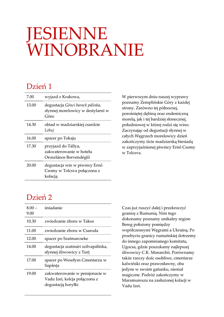 JESIENNE WINOBRANIE Dzień 1 7.00 wyjazd z Krakowa, 13.00 degustacja Gönci barack pálinka, słynnej morelowicy w destylarni w Gönc 14.30 obiad w madziarskiej csardzie Lebuj 16.00 spacer po Tokaju 17.30 przyjazd do Tállya, zakwaterowanie w hotelu Oroszlános Borvendéglő 20.00 degustacja win w piwnicy Ernő Csomy w Tolcsva połączona z kolacją W pierwszym dniu naszej wyprawy poznamy Zemplińskie Góry z każdej strony. Zarówno tej północnej, porośniętej dębiną oraz endemiczną morelą, jak i tej bardziej słonecznej, południowej w której rodzi się wino. Zaczynając od degustacji słynnej w całych Węgrzech morelowicy dzień zakończymy iście madziarską biesiadą w zaprzyjaźnionej piwnicy Ernő Csomy w Tolcsva. Dzień 2 8.00 – 9.00 śniadanie 10.30 zwiedzanie zboru w Takos 11.00 zwiedzanie zboru w Csaroda 12.00 spacer po Szatmarcseke 14.00 degustacja szatmári szilvapálinka, słynnej śliwowicy z Turţ 17.00 spacer po Wesołym Cmentarzu w Sapânţa 19.00 zakwaterowanie w pensjonacie w Vadu Izei, kolcja połączona z degustacją horyłki Czas już ruszyć dalej i przekroczyć granicę z Rumunią. Nim tego dokonamy poznamy unikalny region Bereg położony pomiędzy współczesnymi Węgrami a Ukrainą. Po przebyciu granicy rumuńskiej dotrzemy do innego zapomnianego komitatu, Ugocsa, gdzie poszukamy najlepszej śliwowicy C.K. Monarchii. Porównamy także rzeczy dośc osobliwe, cmentarze kalwiński oraz prawosławny, oba jedyne w swoim gatunku, niemal magiczne. Podróż zakończymy w Maramureszu na zasłużonej kolacji w Vadu Izei. Dzień 3 8.00 – 9.30 Śniadanie 10.00 zwiedzanie drewnianej cerkwi w Deşeşti 13.00 zwiedzanie drewnianej cerkwi w Racâş 14.00 zwiedzanie drewnianej cerkwi w Fildu de Sus 15.00 degustacja śliwowicy z regionu Sǎlaj w miejscowości Lazuri 16.30 zwiedzanie zboru kalwińskiego w Vǎleni 17.30 wizyta na targu w Izvoru Crişului 19.00 zakwaterowanie w pensjonatach w Torocko, kolacja połączona z degustacją torockói bányász palinka, górniczej, seklerskiej śliwowicy. W dniu tym poznamy zapomniane regiony Środkowej Europy. Zaczniemy od Maramureszu aby podążając na południe poznać Sǎlaj oraz Kalotaszég. Porównamy architekturę drewnianych cerkwi tych regionów, poznamy magiczne góry, poszukamy okazji na wielkim targu w Izvoru Crişului. Dzień zakończymy ucztą u Seklerów. Dzień 4 8.00 – 9.00 Śniadanie 12.00 degustacja win w piwnicy Nachbil w Beltiug 16.00 obiad w gospodzie Vendéglő Panzió w Sárospatak 22.00 przyjazd do Krakowa Na koniec naszej wyprawy poznamy świat Szwabów zamieszkujących region Szatmar (Satu Mare), gdzie przy lampce przedniego wina będziemy snuć plany kolejnych wojaży.