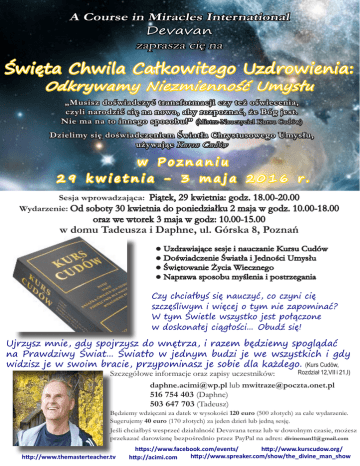 A Course in Miracles International Devavan zaprasza cię na Święta Chwila Całkowitego Uzdrowienia: Odkrywamy Niezmienność Umysłu „Musisz doświadczyć transformacji czy też oświecenia, czyli narodzić się na nowo, aby rozpoznać, że Bóg jest. Nie ma na to innego sposobu!” (Mistrz-Nauczyciel Kursu Cudów) Dzielimy się doświadczeniem Światła Chrystusowego Umysłu, używając Kursu Cudów w Poznaniu 29 kwietnia - 3 maja 2016 r. Sesja wprowadzająca: Piątek, 29 kwietnia: godz. 18.00-20.00 Wydarzenie: Od soboty 30 kwietnia do poniedziałku 2 maja w godz. 10.00-18.00 oraz we wtorek 3 maja w godz: 10.00-15.00 w domu Tadeusza i Daphne, ul. Górska 8, Poznań ● Uzdrawiające sesje i nauczanie Kursu Cudów ● Doświadczenie Światła i Jedności Umysłu ● Świętowanie Życia Wiecznego ● Naprawa sposobu myślenia i postrzegania Czy chciałbyś się nauczyć, co czyni cię szczęśliwym i więcej o tym nie zapominać? W tym Świetle wszystko jest połączone w doskonałej ciągłości... Obudź się! Ujrzysz mnie, gdy spojrzysz do wnętrza, i razem będziemy spoglądać na Prawdziwy Świat... Światło w jednym budzi je we wszystkich i gdy widzisz je w swoim bracie, przypominasz je sobie dla każdego. (Kurs Cudów, Szczegółowe informacje oraz zapisy uczestników: Rozdział 12,VII i 21,I) [email protected] lub [email protected] 516 754 403 (Daphne) 503 647 703 (Tadeusz) Będziemy wdzięczni za datek w wysokości 120 euro (500 złotych) za całe wydarzenie. Sugerujemy 40 euro (170 złotych) za jeden dzień lub jedną sesję. Jeśli chciałbyś wesprzeć działalność Devavana teraz lub w dowolnym czasie, możesz przekazać darowiznę bezpośrednio przez PayPal na adres: [email protected] http://www.themasterteacher.tv https://www.facebook.com/events/ http://www.kurscudow.org/ http://www.spreaker.com/show/the_divine_man_show http://acimi.com