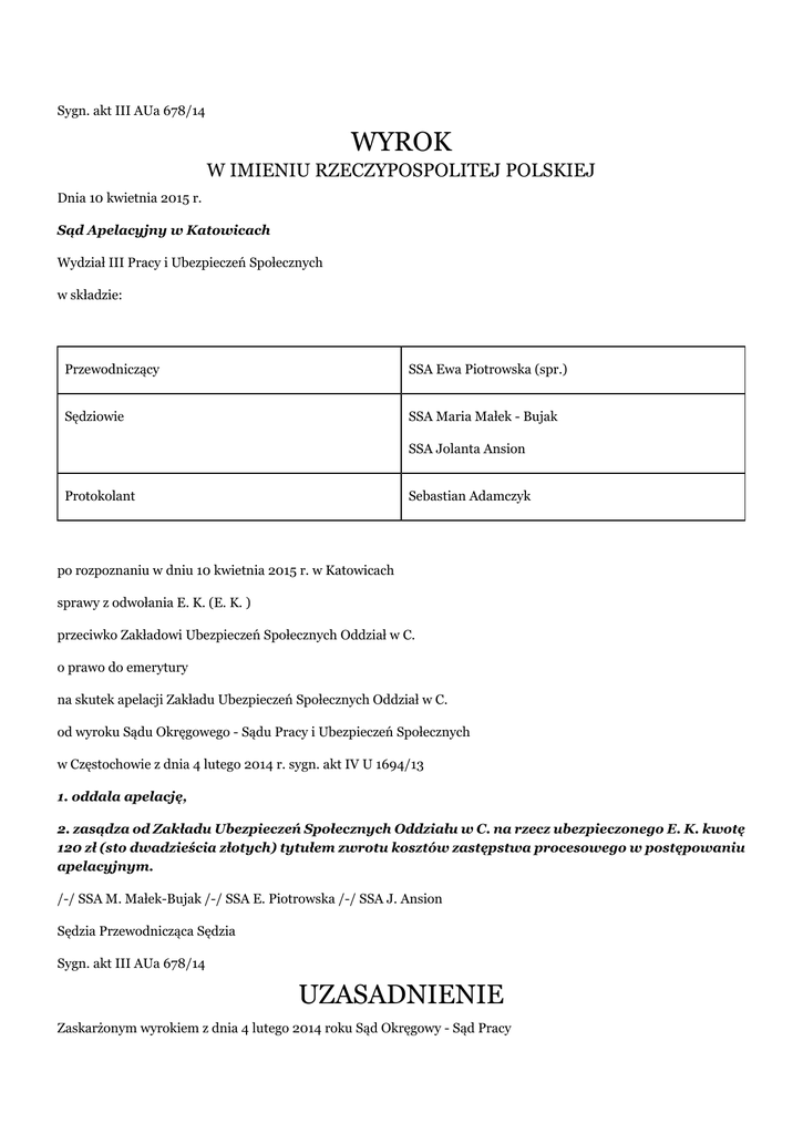 Sygn. akt III AUa 678/14 WYROK W IMIENIU RZECZYPOSPOLITEJ POLSKIEJ Dnia 10 kwietnia 2015 r. Sąd Apelacyjny w Katowicach Wydział III Pracy i Ubezpieczeń Społecznych w składzie: Przewodniczący SSA Ewa Piotrowska (spr.) Sędziowie SSA Maria Małek - Bujak SSA Jolanta Ansion Protokolant Sebastian Adamczyk po rozpoznaniu w dniu 10 kwietnia 2015 r. w Katowicach sprawy z odwołania E. K. (E. K. ) przeciwko Zakładowi Ubezpieczeń Społecznych Oddział w C. o prawo do emerytury na skutek apelacji Zakładu Ubezpieczeń Społecznych Oddział w C. od wyroku Sądu Okręgowego - Sądu Pracy i Ubezpieczeń Społecznych w Częstochowie z dnia 4 lutego 2014 r. sygn. akt IV U 1694/13 1. oddala apelację, 2. zasądza od Zakładu Ubezpieczeń Społecznych Oddziału w C. na rzecz ubezpieczonego E. K. kwotę 120 zł (sto dwadzieścia złotych) tytułem zwrotu kosztów zastępstwa procesowego w postępowaniu apelacyjnym. /-/ SSA M. Małek-Bujak /-/ SSA E. Piotrowska /-/ SSA J. Ansion Sędzia Przewodnicząca Sędzia Sygn. akt III AUa 678/14 UZASADNIENIE Zaskarżonym wyrokiem z dnia 4 lutego 2014 roku Sąd Okręgowy - Sąd Pracy i Ubezpieczeń Społecznych w Częstochowie zmienił zaskarżoną decyzję Zakładu Ubezpieczeń Społecznych Oddziału w C. z dnia 18 lipca 2013 roku i przyznał ubezpieczonemu E. K. emeryturę od 1 lipca 2013 roku. Zaskarżoną decyzją organ rentowy odmówił ubezpieczonemu przyznania emerytury podnosząc, że ubezpieczony nie wykazał wymaganego 25-letniego okresu składkowego i nieskładkowego, a do stażu pracy nie uwzględniono jego pracy w gospodarstwie rolnym rodziców w okresie od 1 września 1968 roku do 30 kwietnia 1974 roku, ponieważ nauka w szkole średniej oddalonej o 28 km od miejsca zamieszkania wyklucza możliwość stałej pracy w gospodarstwie rolnym. Odwołanie od decyzji wniósł ubezpieczony i podniósł, że pomimo nauki w szkole stale pracował w gospodarstwie rolnym rodziców. Wskazał, że nauka w szkole składała się z dwóch etapów, tj. nauki w Zasadniczej Szkole Górniczej w D. oraz w Technikum Górniczym w S. oraz, że w spornym okresie połączenia kolejowe między D. a Z. były bardzo dobre, albowiem dojazd do szkoły zajmował mu około 25 minut. Sąd Okręgowy ustalił, że E. K. urodził się (...), w dniu 3 maja 2013 roku ubezpieczony złożył wniosek o przyznanie emerytury, co załatwione zostało odmownie decyzją z dnia 10 czerwca 2013 roku. W dniu 15 lipca 2013 roku ubezpieczony uzupełnił powyższy wniosek załączając dokumenty potwierdzające jego pracę w gospodarstwie rolnym. Organ rentowy uznał ubezpieczonemu staż emerytalny w wymiarze 24 lat, 2 miesięcy i 29 dni okresów składkowych oraz 3 miesięcy okresów nieskładkowych. Z uwagi na to, że ubezpieczony wykazał 9 lat i 29 dni okresów pracy pod ziemią uprawniony jest on do przejścia na emeryturę w wieku 60 lat i 6 miesięcy (wiek emerytalny 65 lat ulega obniżeniu o 4 lata i 6 miesięcy). W latach 1968-1975 w ewidencji gruntów prowadzonej dla miasta Z., obręb M. jako właściciele gospodarstwa rolnego o powierzchni 1,0745 ha (0,7810 ha użytków rolnych) figurowali rodzice ubezpieczonego. Dodatkowo dzierżawili oni jeszcze około 1 ha gruntów. W okresie od 1 września 1968 roku do czerwca 1971 roku E. K. uczęszczał do Zasadniczej Szkoły Górniczej w D., a następnie kontynuował naukę w Technikum Górniczym Ministerstwa Górnictwa i Energetyki im. XXV-lecia PRL w S., gdzie uczył się w zawodzie elektryka o specjalności eksploatacji maszyn i urządzeń elektrycznych górnictwa podziemnego, którą ukończył z dniem 30 kwietnia 1974 roku. Ubezpieczony codziennie dojeżdżał do szkoły, co zajmowało mu około 25-30 minut w jedną stronę. W gospodarstwie rolnym rodziców odwołujący, pomimo nauki w szkole, pracował codziennie, zasadniczo po zajęciach szkolnych łącznie przez co najmniej 4 godziny dziennie. Ubezpieczony wykonywał typowe prace rolnicze w polu, przy żniwach, sianokosach oraz hodowli zwierząt (bydła, trzody chlewnej, drobiu). W niniejszej sprawie niespornym jest, że ubezpieczony z dniem (...) roku ukończył wiek uprawniający go do przejścia na emeryturę (w związku z wykazaniem przez niego 9-letniego okresu pracy pod ziemią przysługuje mu prawo obniżenia powszechnego wieku emerytalnego o 6 miesięcy za każdy rok takiej pracy, nie więcej jednak niż o 15 lat, tj. w przypadku ubezpieczonego o 4,5 roku). Spornym natomiast jest, czy ubezpieczony wykazał się stażem emerytalnym w wymiarze 25 lat. Organ rentowy odmówił ubezpieczonemu zaliczenia do stażu emerytalnego okresu pracy w gospodarstwie rolnym rodziców po ukończeniu 16-go roku życia przypadającego w okresie od 1 września 1968 roku do 30 kwietnia 1974 roku, z uwagi na pobieranie w tym czasie nauki w szkole ponadpodstawowej oddalonej od miejsca zamieszkania o 25 km, co zdaniem Zakładu wyklucza możliwość stałej pracy w gospodarstwie rolnym. Odwołując się do art. 27, art. 39, art. 184 ust. 1 ustawy z dnia 17 grudnia 1998 roku o emeryturach i rentach z Funduszu Ubezpieczeń Społecznych w zakresie przesłanek dotyczących wieku i stażu pracy ubezpieczonego niezbędnych do przyznania mu emerytury w określonym wyżej stanie faktycznym oraz do art. 10 ust. 1 w/w ustawy i orzecznictwa Sądu Najwyższego w poprzednim stanie prawnym wskazać należało na ugruntowany pogląd, iż okresy pracy domownika w gospodarstwie rolnym przed dniem 1 stycznia 1983 roku uwzględnia się przy ustalaniu uprawnień emerytalno-rentowych, gdy była wykonywana w wymiarze nie niższym niż połowa ustawowego czasu pracy (por. wyrok Sądu Najwyższego: z dnia 28 lutego 1997 roku, II UKN 96/96, OSNAP 1997/23/473, z dnia 18 marca 1999 roku, II UKN 528/98 OSNAP 2000/10/399, z dnia 7 listopada 1997 roku II UKN 318/97 OSNAPiUS 1998r. nr 16, poz. 491, z dnia 13 listopada 1998 roku, II UKN 299/98 OSNAPiUS 1999r. nr 24, poz. 799). W ocenie Sądu Okręgowego ubezpieczony, pomimo uczęszczania w 