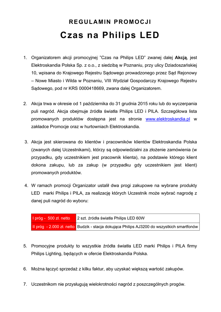 REGULAMIN PROMOCJI Czas na Philips LED 1. Organizatorem akcji promocyjnej ”Czas na Philips LED” zwanej dalej Akcją, jest Elektroskandia Polska Sp. z o.o., z siedzibą w Poznaniu, przy ulicy Dziadoszańskiej 10, wpisana do Krajowego Rejestru Sądowego prowadzonego przez Sąd Rejonowy – Nowe Miasto i Wilda w Poznaniu, VIII Wydział Gospodarczy Krajowego Rejestru Sądowego, pod nr KRS 0000418669, zwana dalej Organizatorem. 2. Akcja trwa w okresie od 1 października do 31 grudnia 2015 roku lub do wyczerpania puli nagród. Akcja obejmuje źródła światła Philips LED i PILA. Szczegółowa lista promowanych produktów dostępna jest na stronie www.elektroskandia.pl w zakładce Promocje oraz w hurtowniach Elektroskandia. 3. Akcja jest skierowana do klientów i pracowników klientów Elektroskandia Polska (zwanych dalej Uczestnikami), którzy są odpowiedzialni za złożenie zamówienia (w przypadku, gdy uczestnikiem jest pracownik klienta), na podstawie którego klient dokona zakupu, lub za zakup (w przypadku gdy uczestnikiem jest klient) promowanych produktów. 4. W ramach promocji Organizator ustalił dwa progi zakupowe na wybrane produkty LED marki Philips i PILA, za realizację których Uczestnik może wybrać nagrodę z danej puli nagród do wyboru: I próg - 500 zł. netto 2 szt. źródła światła Philips LED 60W II próg - 2.000 zł. netto Budzik - stacja dokująca Philips AJ3200 do wszystkich smartfonów 5. Promocyjne produkty to wszystkie źródła światła LED marki Philips i PILA firmy Philips Lighting, będących w ofercie Elektroskandia Polska. 6. Można łączyć sprzedaż z kilku faktur, aby uzyskać większą wartość zakupów. 7. Uczestnikom nie przysługują wielokrotności nagród z poszczególnych progów. 8. Aby zamówić nagrodę, Uczestnik zobowiązany jest do wypełnienia formularza, znajdującego się na www.elektroskandia.pl i przesłania go na adres e-mail: [email protected]. Decyduje kolejność zgłoszeń. 9. Towary zakupione w ramach promocji nie podlegają zwrotowi. 10. Warunkiem wydania nagrody jest brak przeterminowanych zobowiązań płatniczych Uczestnika w stosunku do Organizatora, na dzień wydania nagrody. Jeśli należności będą utrzymywać się w okresie 2 tygodni od dnia wydania nagrody, nagroda przepada. 11. Uczestnicy, po otrzymaniu nagrody podlegają obowiązkowi podatkowemu na zasadach ogólnych, stosownie do postanowień ustawy o podatku dochodowym od osób prawnych (CIT), a także ustawy o podatku dochodowym od osób fizycznych (PIT), z zastosowaniem zwolnienia do 200 zł brutto wartości. Zwolnienie to nie dotyczy osób prowadzących działalność gospodarczą, które otrzymały nagrodę w wyniku jej prowadzenia. Wówczas otrzymana nagroda stanowi przychód z tej działalności i podlega opodatkowaniu na zasadach ogólnych. 12. Nagrody nie podlegają wymianie na gotówkę i nie mogą być wymienione na inne. 13. Nagrody zostaną przekazane w terminie do 21 dni od daty zakończenia akcji promocyjnej. 14. Przystępując do akcji Uczestnik akceptuje postanowienia niniejszego regulaminu.