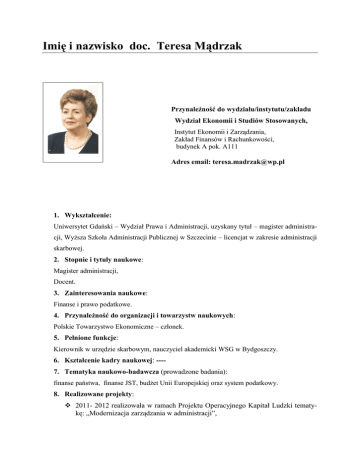Imię i nazwisko doc. Teresa Mądrzak Przynależność do wydziału/instytutu/zakładu Wydział Ekonomii i Studiów Stosowanych, Instytut Ekonomii i Zarządzania, Zakład Finansów i Rachunkowości, budynek A pok. A111 Adres email: [email protected] fotografia 1. Wykształcenie: Uniwersytet Gdański – Wydział Prawa i Administracji, uzyskany tytuł – magister administracji, Wyższa Szkoła Administracji Publicznej w Szczecinie – licencjat w zakresie administracji skarbowej. 2. Stopnie i tytuły naukowe: Magister administracji, Docent. 3. Zainteresowania naukowe: Finanse i prawo podatkowe. 4. Przynależność do organizacji i towarzystw naukowych: Polskie Towarzystwo Ekonomiczne – członek. 5. Pełnione funkcje: Kierownik w urzędzie skarbowym, nauczyciel akademicki WSG w Bydgoszczy. 6. Kształcenie kadry naukowej: ---7. Tematyka naukowo-badawcza (prowadzone badania): finanse państwa, finanse JST, budżet Unii Europejskiej oraz system podatkowy. 8. Realizowane projekty: 2011- 2012 realizowała w ramach Projektu Operacyjnego Kapitał Ludzki tematykę: „Modernizacja zarządzania w administracji”, 2011 - 2012 – realizowała projekt we współpracy z WSG w Bydgoszczy ”Starter młodzi w biznesie” jako wsparcie eksperckie, 2010 – 2012 – realizowała nauczanie przedmiotu „Podstawy ekonomii” w ramach funduszy unijnych dla studentów uczelni, 2010 – 2012 - realizowała własne autorskie szkolenia w ramach projektów współfinansowanych ze środków Unii Europejskiej w ramach Europejskiego Funduszu Społecznego. 9. Dorobek naukowy (wykaz publikacji): - na tematy podatkowe w Kalendarzach Skarbowca wydawanych przez Fundację Pracowników Skarbowych na lata 2003-2004, - publikacja „Budżet Unii Europejskiej” cykl wydawniczy „Studia i Analizy Europejskie” Europe Direct przy WSG w Bydgoszczy w 2008 roku Nr 2, przedruk w/w artykułu w czasopiśmie Skarbnik Finanse Publiczne, Nr 48 marzec-kwiecień 2009, - artykuł ”Dochody budżetu jednostek samorządu terytorialnego” czasopismo Skarbnik i Finanse Publiczne, Nr 49 maj-czerwiec 2009, - artykuł „Nieprawidłowości ujawnione w trakcie kontroli finansowych” czasopismo Skarbnik i Finanse Publiczne, Nr 50 lipiec -sierpień 2009, - artykuł „Budżet zadaniowy” czasopismo Skarbnik i Finanse Publiczne, Nr 51 wrzesień – październik 2009, - artykuł „Nowa ustawa o finansach publicznych” czasopismo Skarbnik i Finanse Publiczne, Nr 51 wrzesień-październik 2009, - artykuł „Krajowa Ewidencja Podatników” czasopismo Skarbnik i Finanse Publiczne, Nr 52 listopad –grudzień 2009, - artykuł „Dochody budżetów gminnych” czasopismo Skarbnik i Finanse Publiczne, Nr 53 styczeń-luty 2010, - artykuł „Europa na arenie międzynarodowej” dla Europe Direct przy WSG w Bydgoszczy, Numer 4, - artykuł „Nietypowe formy zatrudnienia” dla Europe Direct przy WSG w Bydgoszczy, - artykuł „Krajowa Ewidencja Podatkowa” opublikowany w tomie 8 Zeszytów Naukowych Wyższej Szkoły Gospodarki w Bydgoszczy, - artykuł „Ordynacja podatkowa w systemie prawa podatkowego” czasopismo Skarbnik i Finanse Publiczne, Nr 54 marzec-kwiecień 2010. - artykuł „Ordynacja podatkowa w systemie prawa podatkowego” część 2, czasopismo Skarbnik i Finanse Publiczne, Nr 55 maj-czerwiec 2010, -artykuł „Ordynacja podatkowa w systemie prawa podatkowego część 3” czasopismo Skarbnik i Finanse Publiczne, Nr 56 lipiec-sierpień 2010, -artykuł „Postępowanie podatkowe” czasopismo Skarbnik i Finanse Publiczne, Nr 57 wrzesień-październik 2010, -artykuł „Kontrola Funduszu Pracy” Skarbnik i Finanse Publiczne, Nr 58 listopad-grudzień 2010, -artykuł „Zmiany w podatkach dochodowych w 2011” czasopismo Skarbnik i Finanse Publiczne, Nr 59 styczeń-luty 2011, -artykuł „Wolne środki przekazywane w depozyt lub zarządzanie Ministrowi Finansów zysk czy strata?” czasopismo Skarbnik i Finanse Publiczne, Nr 62 lipiec-sierpień 2011 -artykuł „Wierzytelności: przedawnione, umorzone, nieściągalne” czasopismo Skarbnik i Finanse Publiczne, Nr 63 wrzesień-październik 2011r. -artykuł „Optymalizacja Podatkowa” publikacja „Indywidualna działalność gospodarcza (samo zatrudnienie) praca zbiorowa pod redakcją Prof. dr hab. Piotra Szczypy”, wydawnictwo CeDeWu.pl 2014r, publikacja recenzowana, -artykuł „Podatki, opłaty i parapodarki w systemie rachunkowości” autorzy Teresa Mądrzak i Przemysław Pietrzak, praca zbiorowa pod redakcją Prof. dr hab. Piotra Szczypy” wydawnictwo CeDeWu.pl 2015r, publikacja recenzowana, aktualizacja publikacji w 2016r, -artykuł „Zobowiązania - szczególne sytuacje” autorzy Maria Jankowska i Teresa Mądrzak, praca zbiorowa pod redakcją Prof. dr hab. Piotra Szczypy”, wydawnictwo CeDeWu.pl 2016r, publikacja recenzowana. 10. Uzyskane patenty (jeżeli są): nie dotyczy. 11. Zajęcia dydaktyczne (tytuły przedmiotów i rodzaj zajęć – wykłady, konwersatoria, seminaria): - prawo podatkowe i podatki wykład i ćwiczenia, - rachunkowość podatkowa wykład i ćwiczenia, - rachunkowość finansowa ćwiczenia, - rachunkowość budżetowa ćwiczenia, - analiza ekonomiczna ćwiczenia, - ekonomia ćwiczenia, - podstawy mikroekonomii ćwiczenia, - podstawy makroekonomii ćwiczenia, - podstawy ekonomii ćwiczenia, - postępowanie karno-skarbowe wykład i ćwiczenia, - finanse MŚP wykład i ćwiczenia.