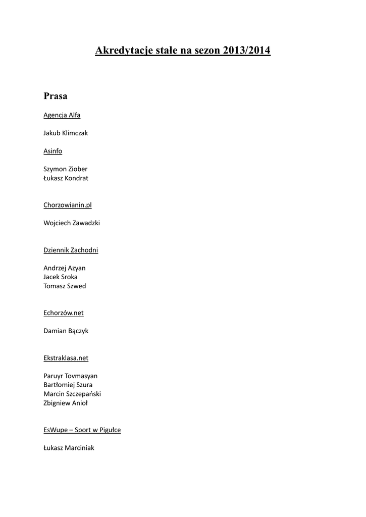 Akredytacje stałe na sezon 2013/2014 Prasa Agencja Alfa Jakub Klimczak Asinfo Szymon Ziober Łukasz Kondrat Chorzowianin.pl Wojciech Zawadzki Dziennik Zachodni Andrzej Azyan Jacek Sroka Tomasz Szwed Echorzów.net Damian Bączyk Ekstraklasa.net Paruyr Tovmasyan Bartłomiej Szura Marcin Szczepański Zbigniew Anioł EsWupe – Sport w Pigułce Łukasz Marciniak Fakt Krzysztof Brommer Michał Zichlarz Fuji Futball Encyklopedia Bożena Szmel Gazeta Wyborcza Wojciech Tudor Paweł Czado IGol.pl Łukasz Pawlik Lovefootball.pl Joanna Jeż Niebiescy.pl Łukasz Dycha Robert Kwap Polska Agencja Prasowa Piotr Girczys Przegląd Sportowy Leszek Błażyński Regionalna Piłka.pl Andrzej Kajser Marcin Griner Sport Marcin Polak Zbigniew Cieńciała Dariusz Leśnikowski Sport Śląski Jacek Tarasiewicz Krzysztof Kubicki Sport Data AG Tomasz Kłodos Sportowe Fakty Michał Piegza Transfer.info Szymon Podstufka Tylko Piłka Ryszard Czaban Waszapiłka.pl Patrycjusz Jankowski Krzysztof Jankowski Wydawnictwo Gia Andrzej Gowarzewski Życie Bytomskie Piotr Gajdzik Radio Radio Fest Jacek Maczuch Polskie Radio Katowice Tadeusz Musioł Andrzej Zowada Tomasz Gancarek Jerzy Góra Krzysztof Klepczyński Radio Piekary Janusz Oster Radio Puls Śląsk Piotr Grela Foto/Prasa Agencja Fotograficzna Edytor Jarosław Rudnicki Piotr Charchula Fakt Dawid Markysz Tomasz Wantuła Niebiescy.pl Mateusz Wójcik Paweł Smolin Teresa Faltin Rtssportcast Krzysztof Andrzejewski Foto Agencja Fotograficzna EastNews Łukasz Kalinowski Agencja Fotograficzna Edytor Michał Chwieduk Dziennik Zachodni Mikołaj Suchan Arkadiusz Gola Lucyna Nenow Ekstraklasa.net Damian Jędrusiński Fanatycy Widzewa Karolina Nowak Maciej Wojciechowski Forum PAF Ireneusz Dorożański Gazeta Wyborcza Grzegorz Celejewski Dawid Chalimoniuk Ekstraklasa.net Jakub Kowalski Lifesport Jacek Gaim Joanna Kurzal Lovefootball.pl Wojciech Marczyk Niebiescy.pl Aneta Knabe Pressfocus Norbert Barczyk Łukasz Laskowski Rafał Rusek Piłka Nożna Maciej Przygoda Polska Agencja Prasowa Andrzej Grygiel Preview Photo Agency Michał Nowak Przegląd Sportowy Tomasz Markowski Reporter AF Adrian Ślązok Sport24.pl Dominik Modrzyk Sport - Foto Dariusz Hermiesz Sportowe Fakty Adam Pilarczyk Super Express Marcin Tomalka TV Comtv.pl Michał Rutkowski Paweł Kłoda Konrad Grzybowski Chorzowianin.tv Michał Fabian Mariusz Baubuch Paweł Mikołajczyk Niebiescy tv Dawid Bentkowski Michał Bebko Orange Sport Wojciech Kania Rafał Kędzior Jakub Rejmoniak Silesia Adam Szaja Krzysztof Trzosek Marcin Kozyra TVP Katowice Robert Walczak