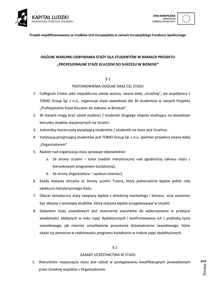 Projekt współfinansowany ze środków Unii Europejskiej w ramach Europejskiego Funduszu Społecznego OGÓLNE WARUNKI ODBYWANIA STAŻY DLA STUDENTÓW W RAMACH PROJEKTU „PROFESJONALNE STAŻE KLUCZEM DO SUKCESU W BIZNESIE” §1 POSTANOWIENIA OGÓLNE ORAZ CEL STAŻU 1. Collegium Civitas jako niepubliczna szkoła wyższa, zwana dalej „Uczelnią”, we współpracy z TOMO Group Sp. z o.o., organizuje staże zawodowe dla 30 studentów w ramach Projektu „Profesjonalne Staże Kluczem do Sukcesu w Biznesie”. 2. W stażach mogą brać udział studenci / studentki drugiego stopnia studiujący na dowolnym kierunku studiów stacjonarnych na Uczelni. 3. Jednostką macierzystą wysyłającą studentów / studentki na staże jest Uczelnia. 4. Instytucją przyjmującą studentów jest TOMO Group Sp. z o.o. (partner projektu) zwana dalej „Organizatorem”. 5. Nadzór nad organizacją stażu sprawuje odpowiednio: a. Ze strony Uczelni – tutor (nadzór merytoryczny nad zgodnością zakresu stażu z kierunkowym programem kształcenia), b. Ze strony Organizatora – opiekun (mentor). 6. Każdy stażysta otrzyma ze Strony uczelni Tutora, który jednocześnie będzie pełnić rolę opiekuna merytorycznego stażu. 7. Obszar tematyczny staży związany będzie z dziedziną marketingu i biznesu oraz powinien być zbieżny z tematyką studiów, którą stażysta będzie przygotowywał w Uczelni. 8. Zadaniem staży zawodowych jest stworzenie warunków do wykorzystania w praktyce wiadomości zdobytych w toku zajęć dydaktycznych i konfrontowania ich z praktyką życia zawodowego, jak również umożliwienie pozyskania doświadczenia zawodowego, które okaże się pomocne w realizowaniu programu kształcenia w trakcie zajęć dydaktycznych. §2 przez Uczelnię wspólnie z Organizatorem. Strona 1. Warunkiem rozpoczęcia stażu jest udział w postępowaniu kwalifikacyjnym prowadzonym 1 ZASADY UCZESTNICTWA W STAŻU Projekt współfinansowany ze środków Unii Europejskiej w ramach Europejskiego Funduszu Społecznego 2. Szczegółowe zasady i warunki kwalifikacji zawarte są w Regulaminie kwalifikacji na staże i przyznawania stypendiów stażowych w projekcie pn. „Profesjonalne staże kluczem do sukcesu w biznesie” dostępnym na stronie internetowej Uczelni. 3. Każdy stażysta musi odbyć łącznie 80 godzin stażowych miesięcznie realizowanych przez trzy kolejne miesiące (średnia liczba godzin tygodniowo – 20). 4. Czas pracy Stażysty odbywającego staż nie może przekraczać 8 godzin na dobę i 40 godzin tygodniowo, a w przypadku Stażysty będącego osobą niepełnosprawną zaliczoną do znacznego lub umiarkowanego stopnia niepełnosprawności - 7 godzi na dobę i 35 godzin tygodniowo. 5. Stażysta nie może odbywać stażu w niedziele i święta oraz w porze nocnej lub w systemie innym niż jednozmianowy lub w godzinach nadliczbowych. 6. Udział w stażu nie może powodować nieobecności na zajęciach. 7. Szczegółowy tryb i program odbywania stażu ustalany jest indywidualnie pomiędzy stażystą a Organizatorem w porozumieniu z Uczelnią. 8. Osoba zakwalifikowana do odbycia stażu podpisuje z Organizatorem umowę na odbywanie stażu. 9. Stażysta zobowiązany jest do: a. przestrzegania ustalonego przez Organizatora porządku i trybu obywania stażu, b. osobistego stawiennictwa w godzinach oraz miejscu wyznaczonym przez Organizatora w celu odbycia stażu, c. przestrzegania wewnętrznych regulaminów i zasad BHP obowiązujących w instytucji Organizatora. Organizator udostępni stażyście przedmiotowe regulaminy przed rozpoczęciem stażu oraz przeszkoli stażystę w zakresie BHP, p. poż. oraz innych szkoleń niezbędnych w miejscu odbywania stażu. d. zachowania tajemnicy informacji udostępnianych przez instytucję Organizatora, e. prowadzenia dzienniczka stażu, f. dostarczenia do Uczelni w terminie 7 dni roboczych od dnia zakończenia stażu: dzienniczka stażu zawierającego ewidencję odbytych godzin oraz raportu Jest to całkowita stawka stypendium za godzinę. Strona 10. Za każdą godzinę stażu przysługuje Stażyście stypendium stażowe w wysokości 18 zł/h brutto. 2 zawierającego zakres obowiązków i wykonanych prac. Projekt współfinansowany ze środków Unii Europejskiej w ramach Europejskiego Funduszu Społecznego 11. W przypadku zwolnień lekarskich staż ulega przedłużeniu o czas usprawiedliwionej nieobecności. 12. Student / studentka może zostać skreślony/ na z listy stażystów w przypadku: a. nieusprawiedliwionej nieobecności na stażu, b. naruszenia podstawowych obowiązków wynikających z Ogólnych Warunków Odbywania Stażu, Regulaminu Studiów lub Umowy o organizację i odbycie stażu studenckiego po uprzednim wezwaniu do złożenia wyjaśnień, c. skreślenia z listy studentów Collegium Civitas. 13. Stażyści zostaną ubezpieczeni przez Organizatora od NNW w czasie odbywania stażu. §3 WARUNKI ZALICZENIA STAŻU 1. Warunkiem zaliczenia stażu jest : a. odbycie łącznie 240 godzin stażowych miesięcznie realizowanych przez trzy kolejne miesiące (średnia liczba godzin tygodniowo – 20 godzin), b. Wykonywanie zadań zleconych przez opiekuna stażu (mentora). §4 POSTANOWIENIA KOŃCOWE 1. We wszystkich nieuregulowanych sprawach w niniejszym Regulaminie zastosowanie mają przepisy kodeksu cywilnego. (Data, miejscowość) 3 (Imię i nazwisko, podpis) _________________________ Strona _________________________