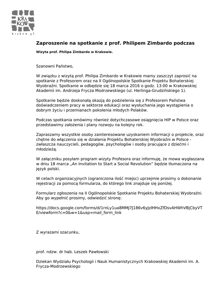 Zaproszenie na spotkanie z prof. Philipem Zimbardo podczas Wizyta prof. Philipa Zimbardo w Krakowie. Szanowni Państwo, W związku z wizytą prof. Philipa Zimbardo w Krakowie mamy zaszczyt zaprosić na spotkanie z Profesorem oraz na II Ogólnopolskie Spotkanie Projektu Bohaterskiej Wyobraźni. Spotkanie w odbędzie się 18 marca 2016 o godz. 13:00 w Krakowskiej Akademii im. Andrzeja Frycza Modrzewskiego (ul. Herlinga-Grudzińskiego 1). Spotkanie będzie doskonałą okazją do podzielenia się z Profesorem Państwa doświadczeniem pracy w sektorze edukacji oraz wysłuchania jego wystąpienia o dobrym życiu i przemianach pokolenia młodych Polaków. Podczas spotkania omówimy również dotychczasowe osiągnięcia HIP w Polsce oraz przedstawimy założenia i plany rozwoju na kolejny rok. Zapraszamy wszystkie osoby zainteresowane uzyskaniem informacji o projekcie, oraz chętne do włączenia się w działania Projektu Bohaterskiej Wyobraźni w Polsce zwłaszcza nauczycieli, pedagogów, psychologów i osoby pracujące z dziećmi i młodzieżą. W załączniku posyłam program wizyty Profesora oraz informuję, że mowa wygłaszana w dniu 18 marca „An Invitation to Start a Social Revolution” będzie tłumaczona na język polski. W celach organizacyjnych (ograniczona ilość miejsc) uprzejmie prosimy o dokonanie rejestracji za pomocą formularza, do którego link znajduje się poniżej. Formularz zgłoszenia na II Ogólnopolskie Spotkanie Projektu Bohaterskiej Wyobraźni. Aby go wypełnić prosimy, odwiedzić stronę: https://docs.google.com/forms/d/1rnLy1ua8MMJ7J186v6yJzIHHxZfDsvAHWhVBjCbyVT E/viewform?c=0&w=1&usp=mail_form_link Z wyrazami szacunku, prof. ndzw. dr hab. Leszek Pawłowski Dziekan Wydziału Psychologii i Nauk Humanistycznych Krakowskiej Akademii im. A. Frycza-Modrzewskiego dr Agnieszka Wilczyńska, Krakowska Akademia im. A. Frycza Modrzewskiego Lider Projektu Bohaterskiej Wyobraźni mgr Agnieszka Konik, Z-ca Lidera, Trener HIP Krakowska Akademia im. A. Frycza Modrzewskiego Powered by TCPDF (www.tcpdf.org)