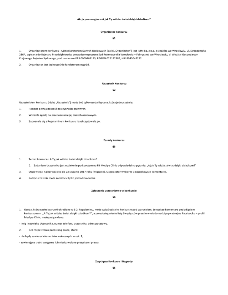 Akcja promocyjna – A jak Ty widzisz świat dzięki dziadkom? Organizator konkursu §1 1. Organizatorem Konkursu i Administratorem Danych Osobowych (dalej „Organizator”) jest MM Sp. z o.o. z siedzibą we Wrocławiu, ul. Strzegomska 236A, wpisana do Rejestru Przedsiębiorców prowadzonego przez Sąd Rejonowy dla Wrocławia – Fabrycznej we Wrocławiu, VI Wydział Gospodarczy Krajowego Rejestru Sądowego, pod numerem KRS 0000468193, REGON 022182389, NIP 8943047232. 2. Organizator jest jednocześnie fundatorem nagród. Uczestnik Konkursu §2 Uczestnikiem konkursu ( dalej „Uczestnik”) może być tylko osoba fizyczna, która jednocześnie: 1. Posiada pełną zdolność do czynności prawnych. 2. Wyraziła zgodę na przetwarzanie jej danych osobowych. 3. Zapoznała się z Regulaminem konkursu i zaakceptowała go. Zasady Konkursu §3 1. Temat konkursu: A Ty jak widzisz świat dzięki dziadkom? 2. Zadaniem Uczestnika jest udzielenie pod postem na FB Medipe Clinic odpowiedzi na pytanie: „A jak Ty widzisz świat dzięki dziadkom?” 3. Odpowiedzi należy udzielić do 23 stycznia 2017 roku (włącznie). Organizator wybierze 3 najciekawsze komentarze. 4. Każdy Uczestnik może zamieścić tylko jeden komentarz. Zgłoszenie uczestnictwa w konkursie §4 1. Osoba, która spełni warunki określone w § 2 Regulaminu, może wziąć udział w konkursie pod warunkiem, że wpisze komentarz pod zdjęciem konkursowym „A Ty jak widzisz świat dzięki dziadkom?”, a po udostępnieniu listy Zwycięzców prześle w wiadomości prywatnej na Facebooku – profil Medipe Clinic, następujące dane: - Imię i nazwisko Uczestnika, numer telefonu uczestnika, adres pocztowy. 2. Bez rozpatrzenia pozostaną prace, które: - nie będą zawierać elementów wskazanych w ust. 1, - zawierające treści wulgarne lub niedozwolone przepisami prawa. Zwycięzcy Konkursu i Nagrody §5 1. Wybór Zwycięzców nastąpi w dniu 24.01.2017 r. do godziny 14:00. W tym dniu Zwycięzcy zostaną poinformowani przez Organizatora o przyznaniu nagrody poprzez udostępnienie komentarza na fanpage Medipe Clinic (https://www.facebook.com/medipeclinic/?fref=ts) wymienieniem nazwisk i imion Zwycięzców. 2. Zwycięzcy otrzymają nagrody: a) Pakiet gadżetów od MEDIPE CLINIC 3. Lista zwycięzców zostanie opublikowana na stronie internetowej: 4. Nagrody nie podlegają zamianie na środki pieniężne. 5. Uczestnictwa w konkursie, jak i praw i obowiązków z nim związanych, w tym prawa do nagrody, nie można przenosić na inne osoby. 6. Nagrody zostaną przekazane Zwycięzcom za pośrednictwem kuriera lub poczty polskiej w terminie 30 dni od zakończenia konkursu, na adres pocztowy wskazany w odpowiedzi na wiadomość prywatną na Facebooku. Zwycięzca może również zgłosić chęć samodzielnego odbioru nagrody z miejsca wskazanego przez Organizatora. 7. Z chwilą wydania nagrody przewoźnikowi lub operatorowi pocztowemu ryzyko utraty lub uszkodzenia przechodzi na nich. Utrata Prawa do Nagrody §6 1. Zwycięzca traci prawo do otrzymania nagrody w przypadku, gdy: - organizator konkursu nie może nawiązać kontaktu z Uczestnikiem poprzez wiadomość prywatną na FB, - Uczestnik nie odbierze prawidłowo zaadresowanej przesyłki z nagrodą i zostanie ona zwrócona do Organizatora, - nie można doręczyć mu przesyłki z nagrodą z powodu podania przez Uczestnika błędnych lub niepełnych danych, - Uczestnik zażądał usunięcia danych osobowych przez Organizatora. 2. W przypadku utraty prawa do otrzymania nagrody przez Uczestnika nagroda zostanie przyznana innemu Uczestnikowi wybranemu przez Organizatora. Postępowanie reklamacyjne §7 1. W przypadku zastrzeżeń co do sposobu prowadzenia konkursu, przyznania nagród i przesyłania zgłoszeń Uczestnikowi przysługuje prawo do złożenia pisemnej skargi ( dalej „Reklamacja”) w trakcie trwania konkursu jak w terminie 30 dni po jego zakończeniu. 2. Reklamacja powinna być złożona na piśmie i przesłana na adres : MM Sp. z o. o., ul. Strzegomska 236A, 54-432 Wrocław. 3. Reklamacja musi spełniać następujące wymogi formalne: - imię, nazwisko oraz adres Skarżącego, - opis przedmiotu reklamacji - musi być sporządzona w formie pisemnej i własnoręcznie podpisana przez Skarżącego - musi zawierać następujące oświadczenie: Wyrażam zgodę na przetwarzanie danych osobowych zgodnie z ustawą z dnia 29 sierpnia 1997 r. o ochronie danych osobowych (Dz. U. z 2002 nr 101, poz. 926 ze zm.) przez Administratora danych osobowych MM Spółka z Ograniczoną Odpowiedzialnością, z siedzibą we Wrocławiu, przy ul. Strzegomska 236a, 54-432 Wrocław w celach związanych z rozpatrzeniem przesłanej reklamacji. Oświadczam, że zostałem/-am poinformowany/-a o tym, że podanie danych osobowych jest dobrowolne, jak również o przysługujących prawach do: dostępu do danych, możliwości ich poprawiania, żądania zaprzestania ich przetwarzania lub sprzeciwu wobec ich przetwarzania. 4. Reklamacje rozpatruje Organizator w terminie 14 dni od jej otrzymania. Dane Osobowe §8 1. Wysłanie zgłoszenia konkursowego jest równoznaczne ze złożeniem oświadczenia o treści: Wyrażam zgodę na przetwarzanie danych osobowych zgodnie z ustawą z dnia 29 sierpnia 1997 r. o ochronie danych osobowych (Dz. U. z 2002 nr 101, poz. 926 ze zm.) przez Administratora danych osobowych MM Spółka z Ograniczoną Odpowiedzialnością, z siedzibą we Wrocławiu, w celach związanych z przeprowadzeniem konkursu pt. ” A jak Ty widzisz świat dzięki dziadkom?”, oraz w celach związanych ze sprawozdawczością finansową związaną z konkursem oraz w celu zamieszczenia mojego imienia i miejscowości zamieszkania na liście zwycięzców konkursu, która zostanie opublikowana na stronie internetowej: www.medipe.com. Oświadczam, że zostałem/-am poinformowany/-a o tym, że podanie danych osobowych jest dobrowolne, jak również o przysługujących prawach do: dostępu do danych, możliwości ich poprawiania, 