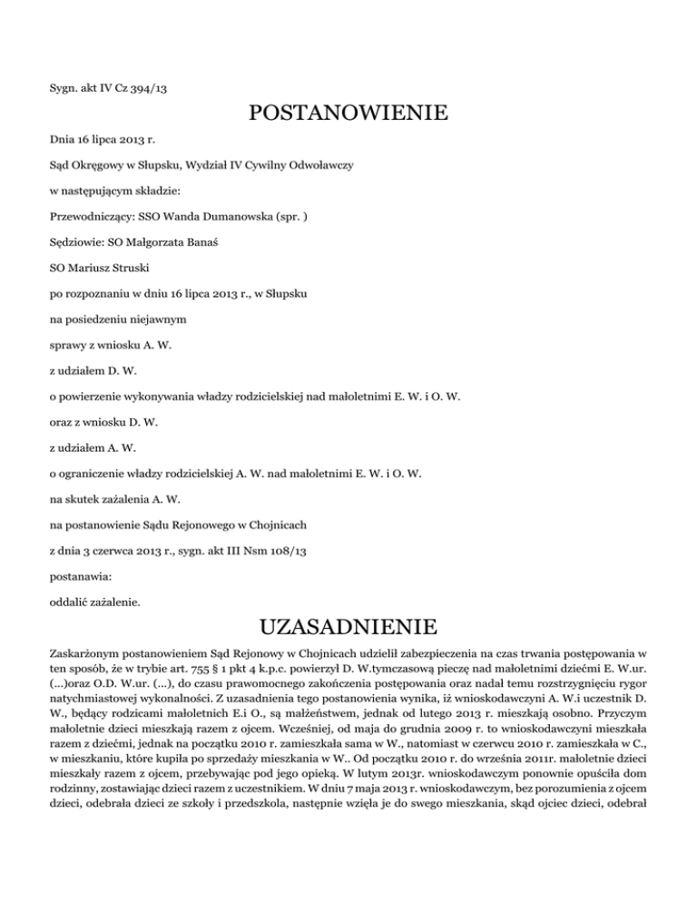 Sygn. akt IV Cz 394/13 POSTANOWIENIE Dnia 16 lipca 2013 r. Sąd Okręgowy w Słupsku, Wydział IV Cywilny Odwoławczy w następującym składzie: Przewodniczący: SSO Wanda Dumanowska (spr. ) Sędziowie: SO Małgorzata Banaś SO Mariusz Struski po rozpoznaniu w dniu 16 lipca 2013 r., w Słupsku na posiedzeniu niejawnym sprawy z wniosku A. W. z udziałem D. W. o powierzenie wykonywania władzy rodzicielskiej nad małoletnimi E. W. i O. W. oraz z wniosku D. W. z udziałem A. W. o ograniczenie władzy rodzicielskiej A. W. nad małoletnimi E. W. i O. W. na skutek zażalenia A. W. na postanowienie Sądu Rejonowego w Chojnicach z dnia 3 czerwca 2013 r., sygn. akt III Nsm 108/13 postanawia: oddalić zażalenie. UZASADNIENIE Zaskarżonym postanowieniem Sąd Rejonowy w Chojnicach udzielił zabezpieczenia na czas trwania postępowania w ten sposób, że w trybie art. 755 § 1 pkt 4 k.p.c. powierzył D. W.tymczasową pieczę nad małoletnimi dziećmi E. W.ur. (...)oraz O.D. W.ur. (...), do czasu prawomocnego zakończenia postępowania oraz nadał temu rozstrzygnięciu rygor natychmiastowej wykonalności. Z uzasadnienia tego postanowienia wynika, iż wnioskodawczyni A. W.i uczestnik D. W., będący rodzicami małoletnich E.i O., są małżeństwem, jednak od lutego 2013 r. mieszkają osobno. Przyczym małoletnie dzieci mieszkają razem z ojcem. Wcześniej, od maja do grudnia 2009 r. to wnioskodawczyni mieszkała razem z dziećmi, jednak na początku 2010 r. zamieszkała sama w W., natomiast w czerwcu 2010 r. zamieszkała w C., w mieszkaniu, które kupiła po sprzedaży mieszkania w W.. Od początku 2010 r. do września 2011r. małoletnie dzieci mieszkały razem z ojcem, przebywając pod jego opieką. W lutym 2013r. wnioskodawczym ponownie opuściła dom rodzinny, zostawiając dzieci razem z uczestnikiem. W dniu 7 maja 2013 r. wnioskodawczym, bez porozumienia z ojcem dzieci, odebrała dzieci ze szkoły i przedszkola, następnie wzięła je do swego mieszkania, skąd ojciec dzieci, odebrał je dopiero 11 maja 2013 r., po uprzednich rozmowach z wnioskodawczynią. Wniosek o udzielenie zabezpieczenia złożony przez uczestnika D. W.Sąd Rejonowy uznał za słuszny, wskazując, że podstawą jego uwzględnienia nie były tylko i wyłącznie opisane w nim okoliczności, jakie miały miejsce po dniu 6 maja 2013r. Sąd wskazał, że jakkolwiek na obecnym etapie postępowania nie może zweryfikować twierdzeń i uczestnika, iż jego żona A. W.cierpi na chorobę psychiczną lub psychozę z urojeniami o treści religijnej, to należy zauważyć, że obecne jej postępowanie zagraża dobru małoletnich dzieci. Po zabraniu dzieci, co nastąpiło 7 maja 2013 r. bez wiedzy ojca, dzieci były pozbawione kontaktu z ojcem, sprawującym nad nimi bezpośrednią opiekę nieprzerwanie od grudnia 2009 r., nadto dzieci zostały pozbawione możliwości realizacji obowiązku szkolnego (w przypadku małoletniej E.) oraz możliwości dalszego uczęszczania do przedszkola (w przypadku małoletniego O.). Nadto Sąd stwierdził, że matka dzieci, pozostająca w silnym konflikcie z ojcem dzieci, która przejmuje bez porozumienia z uczestnikiem bezpośrednią pieczę nad dziećmi, nie liczy się z uczuciami i emocjami swoich dzieci i próbuje metodą faktów dokonanych uprzedzić, czy wręcz wymusić korzystne dla siebie rozstrzygnięcie sądu opiekuńczego o władzy rodzicielskiej nad dziećmi. Z postanowieniem tym nie zgodziła się A. W. i zaskarżyła je w całości, zarzucając że jest ono krzywdzące dla niej i dla dzieci. Wniosła o pilne przeprowadzenie badań psychiatrycznych obojga uczestników postepowania. W odpowiedzi na zażalenie wnioskodawca wniósł o jego oddalenie. Sąd II-ej instancji zważył, co następuje: Zażalenie uczestniczki nie zasługuje na uwzględnienie. Przesłanki udzielenia zabezpieczenia reguluje przepis art. 7301 § 1 i 2 kpc, zgodnie z treścią, którego udzielenia zabezpieczenia może żądać każda strona lub uczestnik postępowania, jeżeli uprawdopodobni roszczenie oraz interes prawny w udzieleniu zabezpieczenia. Zasadniczym warunkiem dopuszczalności zabezpieczenia jest wiarygodność roszczenia. Nie wystarczy, bowiem samo stwierdzenie, że roszczenie istnieje. Wnioskodawca musi jeszcze uprawdopodobnić, że ono mu przysługuje. Drugim z kolei warunkiem zabezpieczenia jest istnienie obawy, że brak zabezpieczenia mógłby pozbawić wierzyciela zaspokojenia. Niebezpieczeństwo to musi istnieć już w chwili żądania zabezpieczenia. Obie wymienione powyżej przesłanki zabezpieczenia muszą zostać spełnione kumulatywnie. Mając na względzie powyższe regulacje należy stwierdzić, iż argumenty przytoczone na uzasadnienie wniosku przez wnioskodawcę D. W. oraz ustalone w trakcie postepowania w szczególności sytuacji gdy uczestniczka postepowania zabrała w dniu 7 maja 2013r. dzieci ze szkoły i z przedszkola bez powiadomienia ojca, z którym zamieszkiwały, pozwalają na przyjęcie, iż istnieje po jego stronie przesłanka do żądania zabezpieczenia roszczenia na czas trwania postepowania. Drugą przesłanką, która musi współistnieć, jest interes prawny w udzieleniu zabezpieczenia. Ustawodawca wskazał w art. 7301 § 2 kpc kryteria istnienia takiego interesu stanowiąc, iż istnieje on wtedy, gdy brak zabezpieczenia uniemożliwi lub poważnie utrudni wykonanie zapadłego orzeczenia lub w inny sposób uniemożliwi lub poważnie utrudni osiągnięcie celu postępowania w sprawie. Nadto nie każde utrudnienie uzasadnia istnienie interesu prawnego, ale tylko takie, które ma charakter poważny, a więc trudny do usunięcia. Mając na uwadze ustalony przez Sąd Rejonowy stan faktyczny oraz stan skonfliktowania stron, należy przyjąć również, iż powyższa przesłanka jest spełniona. Nadto uwzględniając fakt, iż zabezpieczenie roszczenia jest rozstrzygnięciem wyłącznie na czas trwania postepowania, należy uznać, iż argumenty podniesione przez wnioskodawcę w uzasadnien