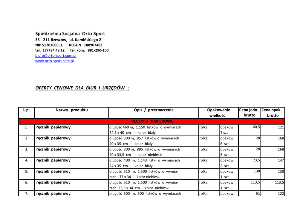 Spółdzielnia Socjalna Orto-Sport 35 - 211 Rzeszów, ul. Kamińskiego 2 NIP 5170360651, REGON 180907482 tel. 17/784 48 12 , tel. kom. 881-290-100 [email protected] www.orto-sport.com.pl OFERTY CENOWE DLA BIUR I URZĘDÓW : L.p. Nazwa produktu Opis / przeznaczenie Opakowanie wielkość Cena jedn. Cena opak. brutto brutto RĘCZNIKI PAPIEROWE 1. ręcznik papierowy 2. ręcznik papierowy 3. ręcznik papierowy 4. ręcznik papierowy 5. ręcznik papierowy 6. ręcznik papierowy 7. ręcznik papierowy długość 460 m, 1.150 listków o wymiarach 24,5 x 40 cm - kolor biały długość 300 m, 857 listków o wymiarach 20 x 35 cm - kolor biały długość 300 m, 895 listków o wymiarach 20 x 33,5 cm - kolor niebieski długość 400 m, 1.143 listki o wymiarach 24 x 35 cm - kolor biały długość 510 m, 1.500 listków o wymiarach 37 x 34 - kolor niebieski długość 510 m, 1.500 listków o wymiarach 23,5 x 34 cm - kolor niebieski długość 500 m, 500 listków o wymiarach rolka rolka rolka rolka rolka rolka rolka opakow. 2 szt opakow. 6 szt opakow. 6 szt opakow. 2 szt opakow. 1 szt opakow. 1 szt opakow. 60,5 121 28 168 28 168 73,5 147 138 138 113,5 113,5 61 122 8. do trudnych zabrudzeń Tork Wiping Paper Plus 23,5 x 34 - kolor niebieski i biały ręcznik papierowy 368 listków, 125 m długości rolka 2 szt opakow. 4 szt. 21 84 PREPARATY DO CZYSZCZENIA PODŁÓG I POMIESZCZEŃ 9. Taski Sprint Degerm 10. Taski Sprint Degerm 11. Taski Jontec 300 N.C. conc Db 12. Suma Disinfection Wipes 13. 14. 15. Taski Jontec 300 Taski Jontec 300 Taski Jontec 300 J-Flex 16. Taski Jontec 300 J-Flex 17. Taski Jontec 300 Pur-Eco SD 18. Taski Jontec Forward 19. Taski Jontec Forward J-Flex 20. Taski Jontec Tensol 21. Taski Jontec Tensol conc Db 22. DI Actival 23. Good Sense Vert J-Flex preparat dezynfekcyjny do mycia i dezynfekcji wodoodpornych powierzchni i podłóg preparat dezynfekcyjny do mycia i dezynfekcji wodoodpornych powierzchni i podłóg preparat do codziennego mycia podłóg konc., zawiera technologię O.N.T. chusteczki do dezynfekcji powierzchni na bazie alkoholu preparat do codziennego mycia podłóg preparat do codziennego mycia podłóg niskopieniący, neutralny preparat do mycia podłóg zabezpieczonych powłokami niskopieniący, neutralny preparat do mycia podłóg zabezpieczonych powłokami skoncentrowany, neutralny preparat do mycia podłóg alkaliczny, niskopieniący preparat do mycia podłóg alkaliczny, niskopieniący preparat do mycia podłóg preparat na bazie związków powierzchniowo czynnych do mycia i konserwacji podłóg preparat na bazie związków powierzchniowo czynnych do mycia i konserwacji podłóg preparat do usuwania zanieczyszczeń tłuszczowych uniwersalny preparat myjący, silnie butelka 6 x 1,0 l 47,5 285 kanister 2 x 5,0 l 221,5 443 6 x 1,0 l butelka 70 420 karton 93,5 1.122 butelka kanister butelka 12 x 150 szt 6 x 1,0 l 2 x 5,0 l 1 x 1,5 l 24 86 289 144 172 289 kanister 1 x 5,0 l 745,5 745,5 butelka 1 x 1,4 l 153,5 153,5 kanister 2 x 5,0 l 170 340 butelka 1 x 1,5 l 289 289 kanister 2 x 5,0 l 170 340 butelka 6 x 1,0 l 130,5 783 kanister 2 x 5,0 l 184,5 369 butelka 1 x 1,5 l 422 422 perfumowany PREPARATY DO CZYSZCZENIA ŁAZIENEK I TOALET 24. 25. 26. Taski Sani 100 Taski Sani 100 J-Fleks 1,5 l Taski Sani Cid conc Refill 27. Taski Sani Cid conc Cb 28. Taski Sani Cid conc Db 29. 30. 31. Taski Sani WC Premium Room Care R6 DI Divodes FG 32. Taski Sani Calc 33. Taski Sani Calc 34. Room Care R9-plus Pur-Eco 35. Room Care R10-plus Pur-Eco 36. DI Divodes FG preparat do codziennego mycia toalet preparat do codziennego mycia toalet kwasowy preparat do codziennego mycia toalet - koncentrat kwasowy preparat do codziennego mycia toalet - koncentrat kwasowy preparat do codziennego mycia toalet - koncentrat silny preparat do czyszczenia sanitariatów preparat do gruntownego mycia toalet preparat dezynfekcyjny na bazie alkoholu, nie wymaga płukania preparat do usuwania osadów kamienia wapiennego preparat do usuwania osadów kamienia wapiennego skoncentrowany preparat do mycia łazienek skoncentrowany preparat do codziennego mycia twardych, wodoodpornych podłóg preparat dezynfekcyjny na bazie alkoholu, nie wymaga płukania butelka kanister butelka 1 x 1,5 l 2 x 5,0 l 6 x 1,0 l 178 115,5 54 178 231 324 kanister 1 x 5,0 l 259,5 259,5 6 x 1,0 l butelka 82,5 495 kanister butelka butelka 2 x 5,0 l 6 x 750 ml 6 x 750 ml 413,5 37 51 827 222 306 6 x 1,0 l butelka 44,5 267 2 x 5,0 l kanister 141 282 2 x 1,5 l saszetka 161 322 2 x 1,5 l saszetka 202 404 6 x 750 ml litr 51 306 6 x 600 ml saszetka 54 324 PIELĘGNACJA I OCHRONA RĄK 37. Soft Care Sensisept 38. Soft Care Sensisept 39. 40. Soft Care Fresh Soft Care Foam Soap antybakteryjny preparat 3 w 1 do higienicznego mycia rąk antybakteryjny preparat 3 w 1 do higienicznego mycia rąk mydło do rąk o świeżym zapachu mydło do rąk w pianie 2 x 5,0 l kanister 270,5 541 6 x 800 ml 6 x 700 ml saszetka saszetka 48 48 288 288 41. 42. 43. 44. 45. 46. 47. Sofr Care Plus Pure Soft Care Med. Soft Care Med. Soft Care Med. Soft Care Alcoplus Soft Care Dermasoft Soft Care Tex Wipes antybakteryjne mydło do rąk preparat do dezynfekcji rąk preparat do dezynfekcji rąk / z pompką / preparat do dezynfekcji rąk preparat do dezynfekcji rąk krem pielęgnacyjno-ochronny do rąk chusteczki do mycia rąk 2 x 5,0 l 6 x 800 ml 6 x 500 ml 2 x 5,0 l 2 x 5,0 l 6 x 800 ml 2 x 560 szt. litr saszetka butelka kanister litr saszetka pojemnik 33 94,5 47,5 260 37 79 391 66 567 285 520 74 474 782 6 x 750 ml sztuka 11,5 69 12 x 500 ml sztuka 11 132 PREPARATY DO CZYSZCZENIA I DEZYNFEKCJI 48. Mr Muscle MAX rozpylacz 49. Mr Muscle MAX rozpylacz 500 ml 50. Cif Cream With Bleach 51. Cif Professional Cream Lila Flower 52. 53. Cif Furniture Polish Cif Professsional Brilliance Ocean 54. Cif Stainless Steel & Glass Business Solutions Cif Power Cleaner Degreaser Business Solutions Cif Power Cleaner Degreaser Business Solutions Cif Apurpose Cleaner Lemon Fresh Business Solutions Cif Window & Multi
