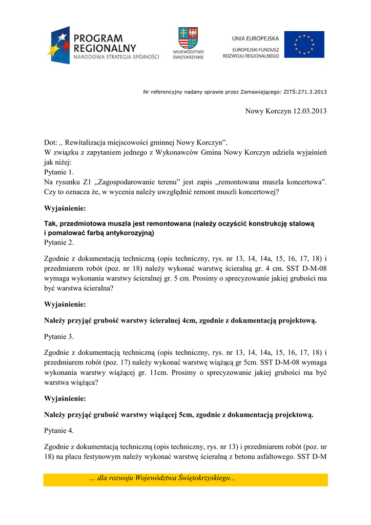 Nr referencyjny nadany sprawie przez Zamawiającego: ZITŚ:271.3.2013 Nowy Korczyn 12.03.2013 Dot: ,, Rewitalizacja miejscowości gminnej Nowy Korczyn”. W związku z zapytaniem jednego z Wykonawców Gmina Nowy Korczyn udziela wyjaśnień jak niżej: Pytanie 1. Na rysunku Z1 „Zagospodarowanie terenu” jest zapis „remontowana muszla koncertowa”. Czy to oznacza że, w wycenia należy uwzględnić remont muszli koncertowej? Wyjaśnienie: Tak, przedmiotowa muszla jest remontowana (należy oczyścić konstrukcję stalową i pomalować farbą antykorozyjną) Pytanie 2. Zgodnie z dokumentacją techniczną (opis techniczny, rys. nr 13, 14, 14a, 15, 16, 17, 18) i przedmiarem robót (poz. nr 18) należy wykonać warstwę ścieralną gr. 4 cm. SST D-M-08 wymaga wykonania warstwy ścieralnej gr. 5 cm. Prosimy o sprecyzowanie jakiej grubości ma być warstwa ścieralna? Wyjaśnienie: Należy przyjąć grubość warstwy ścieralnej 4cm, zgodnie z dokumentacją projektową. Pytanie 3. Zgodnie z dokumentacją techniczną (opis techniczny, rys. nr 13, 14, 14a, 15, 16, 17, 18) i przedmiarem robót (poz. 17) należy wykonać warstwę wiążącą gr 5cm. SST D-M-08 wymaga wykonania warstwy wiążącej gr. 11cm. Prosimy o sprecyzowanie jakiej grubości ma być warstwa wiążąca? Wyjaśnienie: Należy przyjąć grubość warstwy wiążącej 5cm, zgodnie z dokumentacją projektową. Pytanie 4. Zgodnie z dokumentacją techniczną (opis techniczny, rys. nr 13) i przedmiarem robót (poz. nr 18) na placu festynowym należy wykonać warstwę ścieralną z betonu asfaltowego. SST D-M … dla rozwoju Województwa Świętokrzyskiego... 08 wymaga wykonania warstwy ścieralnej z asfaltu lanego. Prosimy o sprecyzowanie z jakiej mieszanki ma być wykonana warstwa ścieralna na placu festynowym? Wyjaśnienie: Należy wykonać zgodnie z opisem technicznym i rysunkami – beton asfaltowy. Pytanie 5 SST D-M-08 zawiera wymagania oparte na nieobowiązującej już normie PN-S-96025. Czy mieszanki bitumiczne można projektować i wykonywać zgodnie z obowiązującymi wytycznymi WT-2 2010? Wyjaśnienie: Tak, należy wykonać zgodnie z obowiązującymi wytycznymi WT-2 2010. Pytanie 6. W opisie technicznym Projektant informuje, że zaprojektował nawierzchnię przystosowaną do przenoszenia ruchu kategorii KR -3, jednak zaprojektowane grubości warstw (warstwa ścieralna 4cm, warstwa wiążąca 5cm, podbudowa z kruszywa 20cm) odpowiadają kategorii ruchu KR-1. Zgodnie z „Katalogiem typowych konstrukcji nawierzchni podatnych i półsztywnych” dla ruchu KR-3 minimalna grubość warstw bitumicznych na podbudowie z kruszywa wynosi 18cm. Prosimy o wyjaśnienie jaką konstrukcję nawierzchni przyjąć do wyceny? Wyjaśnienie: Należy przyjąć konstrukcje nawierzchni zgodnie z rysunkami – dla ruchu kategorii KR1 Pytanie 7. W opisie technicznym Projektant informuje, że zaprojektował nawierzchnię przystosowaną do przenoszenia ruchu kategorii KR-3. SST D-M-08 zawiera wymagania dla mieszanek bitumicznych dla ruchu KR 1-2. Prosimy o wyjaśnienie jakie mieszanki bitumiczne przyjąć do wyceny? Wyjaśnienie Należy przyjąć mieszanki jak dla ruchu kategorii KR 1-2 (beton asfaltowy). … dla rozwoju Województwa Świętokrzyskiego...