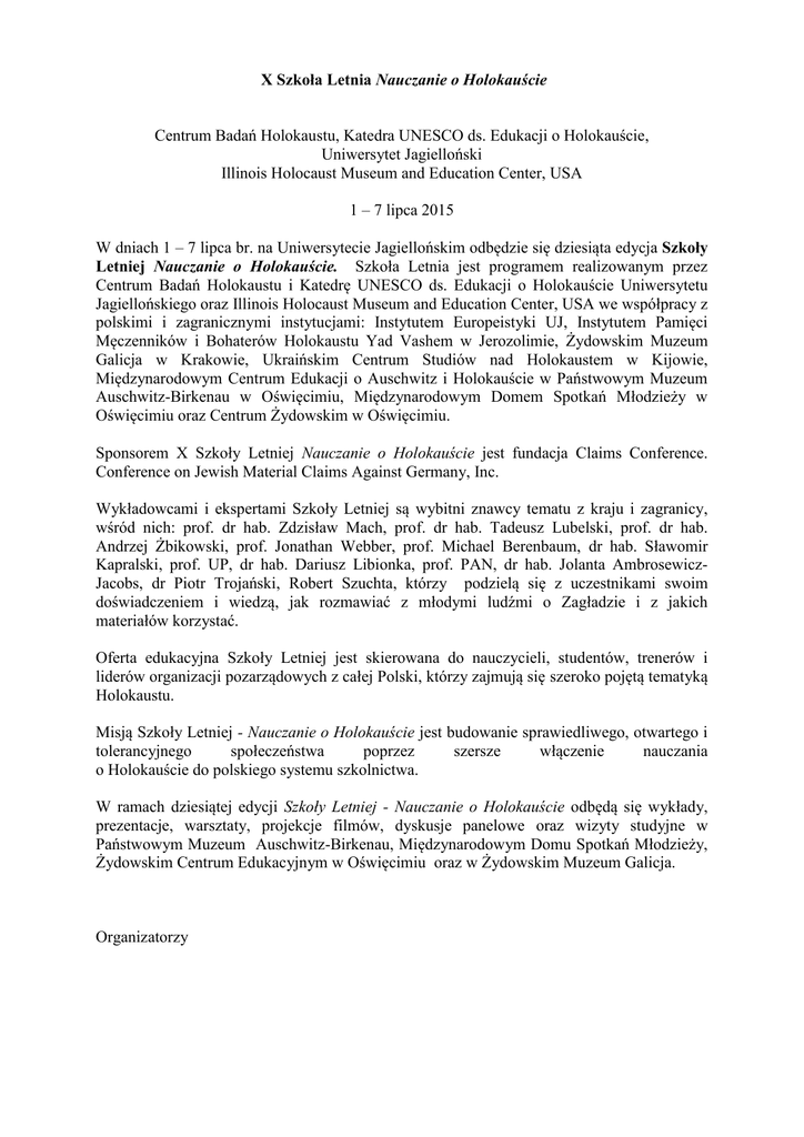 X Szkoła Letnia Nauczanie o Holokauście Centrum Badań Holokaustu, Katedra UNESCO ds. Edukacji o Holokauście, Uniwersytet Jagielloński Illinois Holocaust Museum and Education Center, USA 1 – 7 lipca 2015 W dniach 1 – 7 lipca br. na Uniwersytecie Jagiellońskim odbędzie się dziesiąta edycja Szkoły Letniej Nauczanie o Holokauście. Szkoła Letnia jest programem realizowanym przez Centrum Badań Holokaustu i Katedrę UNESCO ds. Edukacji o Holokauście Uniwersytetu Jagiellońskiego oraz Illinois Holocaust Museum and Education Center, USA we współpracy z polskimi i zagranicznymi instytucjami: Instytutem Europeistyki UJ, Instytutem Pamięci Męczenników i Bohaterów Holokaustu Yad Vashem w Jerozolimie, Żydowskim Muzeum Galicja w Krakowie, Ukraińskim Centrum Studiów nad Holokaustem w Kijowie, Międzynarodowym Centrum Edukacji o Auschwitz i Holokauście w Państwowym Muzeum Auschwitz-Birkenau w Oświęcimiu, Międzynarodowym Domem Spotkań Młodzieży w Oświęcimiu oraz Centrum Żydowskim w Oświęcimiu. Sponsorem X Szkoły Letniej Nauczanie o Holokauście jest fundacja Claims Conference. Conference on Jewish Material Claims Against Germany, Inc. Wykładowcami i ekspertami Szkoły Letniej są wybitni znawcy tematu z kraju i zagranicy, wśród nich: prof. dr hab. Zdzisław Mach, prof. dr hab. Tadeusz Lubelski, prof. dr hab. Andrzej Żbikowski, prof. Jonathan Webber, prof. Michael Berenbaum, dr hab. Sławomir Kapralski, prof. UP, dr hab. Dariusz Libionka, prof. PAN, dr hab. Jolanta AmbrosewiczJacobs, dr Piotr Trojański, Robert Szuchta, którzy podzielą się z uczestnikami swoim doświadczeniem i wiedzą, jak rozmawiać z młodymi ludźmi o Zagładzie i z jakich materiałów korzystać. Oferta edukacyjna Szkoły Letniej jest skierowana do nauczycieli, studentów, trenerów i liderów organizacji pozarządowych z całej Polski, którzy zajmują się szeroko pojętą tematyką Holokaustu. Misją Szkoły Letniej - Nauczanie o Holokauście jest budowanie sprawiedliwego, otwartego i tolerancyjnego społeczeństwa poprzez szersze włączenie nauczania o Holokauście do polskiego systemu szkolnictwa. W ramach dziesiątej edycji Szkoły Letniej - Nauczanie o Holokauście odbędą się wykłady, prezentacje, warsztaty, projekcje filmów, dyskusje panelowe oraz wizyty studyjne w Państwowym Muzeum Auschwitz-Birkenau, Międzynarodowym Domu Spotkań Młodzieży, Żydowskim Centrum Edukacyjnym w Oświęcimiu oraz w Żydowskim Muzeum Galicja. Organizatorzy