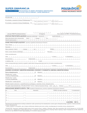 SUPER GWARANCJA D E K L A R AC JA Z G O DY P R Z YS TĄ P I E N I A D O U M O W Y G R U P O W E G O U B E Z P I E C Z E N I A N A Ż YC I E Z O P C JĄ F U N D U S Z Y „ S U P E R G WA R A N C JA” POLISA NR: - - * Nr wniosku o zawarcie Umowy Podstawowej: P/ - - / (data sporządzenia wniosku: dd-mm-rrrr) Nr wniosku o zawarcie Umowy Dodatkowej: D/ - - (data sporządzenia wniosku: dd-mm-rrrr) pieczęć RBH/Przedstawicielstwa / (kolejny nr wniosku w danym dniu) Data wpływu do RBH / Przedstawicielstwa ID Agenta STATUS PRZYSTĘPUJĄCEGO (zaznacz właściwe): Data zatrudnienia (dot. pracownika) (kolejny nr wniosku w danym dniu) dzień: pracownik: miesiąc: współmałżonek: rok: Zawód wykonywany: DANE PRZYSTĘPUJĄCEGO (prosimy wypełniać drukowanymi literami) Imię / imiona: Nazwisko: Data urodzenia / dzień: miesiąc: rok: PESEL: Seria i numer dowodu osobistego: Imię ojca: Adres zameldowania: ulica: nr domu: kod pocztowy: – nr mieszkania: miejscowość: nr telefonu, fax: e-mail: Adres korespondencyjny (prosimy wypełnić, jeżeli adres korespondencyjny jest inny niż adres zameldowania): ulica: nr domu: – kod pocztowy: nr mieszkania: miejscowość: ZAKRES OCHRONY UBEZPIECZENIOWEJ ZGODNY Z ZAWARTĄ UMOWĄ UBEZPIECZENIA Suma ubezpieczenia: zł słownie: Składka dla 1 osoby z Umowy Podstawowej zł: słownie: Składka dla 1 osoby z Umowy Dodatkowej zł: słownie: Składka dla 1 osoby łącznie zł: słownie: Składka będzie opłacana z częstotliwością wynikającą z zawartej umowy ubezpieczenia. Początek odpowiedzialności „POLISA-ŻYCIE” TU S.A. Vienna Insurance Group dzień: 0 1 miesiąc: rok: WSKAZANIE BENEFICJENTA / ÓW (wypełnia Ubezpieczony, prosimy wypełniać drukowanymi literami) Lp. Imię Nazwisko PESEL lub data urodzenia % świadczenia 1. 2. 3. 4. ŁĄCZNIE 100 % Niewskazanie beneficjenta/ów skutkuje ustalaniem osób uprawnionych do świadczenia z tytułu zgonu Ubezpieczonego, zgodnie z treścią zawartej umowy ubezpieczenia. * należy wypełnić w przypadku, gdy niniejsza deklaracja składana jest przez osobę, przystępującą do zawartej umowy ubezpieczenia. „POLISA-ŻYCIE” Towarzystwo Ubezpieczeń Spółka Akcyjna Vienna Insurance Group z siedzibą w Warszawie, adres: Aleje Jerozolimskie 162A, 02-342 Warszawa, tel.: 22 501 68 88, fax: 22 501 68 77. Zarejestrowane w Sądzie Rejonowym dla m. st. Warszawy XII Wydział Gospodarczy Krajowego Rejestru Sądowego, Rejestr Przedsiębiorców Nr KRS: 0000057533, NIP 525-10-01-382, REGON 011133445. Kapitał zakładowy 57.313.250,00 zł, opłacony w całości. 1 OŚWIADCZENIA Wyrażam zgodę, aby ta deklaracja i zawarte w niej informacje były podstawą do objęcia mnie ochroną ubezpieczeniową. Przyjmuję do wiadomości, że niniejsza deklaracja podlega weryfikacji przed objęciem mnie ochroną ubezpieczeniową Przed podpisaniem niniejszej deklaracji, zapoznałam/łem się i akceptuję treść przedstawionych mi Ogólnych Warunków Grupowego Ubezpieczenia na Życie z Opcją Funduszy „SUPER GWARANCJA”, wskazanych w umowie ubezpieczenia potwierdzonej polisą o numerze przywołanym w niniejszej deklaracji / we wniosku o zawarcie Umowy Podstawowej przywołanym w niniejszej deklaracji / wniosku o zawarcie Umowy Dodatkowej1) przywołanym w niniejszej deklaracji, a także treść obowiązującego w dniu przystąpienia do umowy ubezpieczenia, Regulaminu Uczestnictwa w Programie „Pakiet Usług Assistance” 2). Wyrażam zgodę na udział w Programie „Pakiet Usług Assistance”, na podstawie ww. Regulaminu Uczestnictwa w Programie „Pakiet Usług Assistance”. Wyrażam równocześnie zgodę na przekazywanie moich danych osobowych AGA International S.A. Główny Oddział w Polsce z siedzibą w Warszawie przy ul. Domaniewskiej 50B, w celach związanych z realizacją Programu2). Przyjmuję do wiadomości, że Administratorami danych osobowych są: „POLISA-ŻYCIE” TU S.A. Vienna Insurance Group z siedzibą w Warszawie przy Alejach Jerozolimskich 162A oraz AGA International S.A. Główny Oddział w Polsce z siedzibą w Warszawie przy ul. Domaniewskiej 50B2). Celem zbierania danych jest wykonywanie umowy ubezpieczenia. Oświadczam, że w dniu podpisania niniejszej deklaracji nie jestem niezdolny do pracy z powodu choroby. Wyrażam zgodę na uzyskiwanie przez „POLISA-ŻYCIE” TU S.A. Vienna Insurance Group od podmiotów wykonujących działalność leczniczą, w tym zakładów opieki zdrowotnej, osób fizycznych wykonujących zawód medyczny, grupowych praktyk lekarskich, grupowych praktyk pielęgniarek oraz Zakładu Ubezpieczeń Społecznych, informacji o okolicznościach związanych z oceną ryzyka ubezpieczeniowego i weryfikacją podanych danych o stanie zdrowia Ubezpieczonego, ustaleniem prawa do świadczenia z umowy ubezpieczenia i wysokością tego świadczenia, a także informacji o przyczynie śmierci, z wyłączeniem wyników badań genetycznych. Przyjmuję do wiadomości, iż stopień trwałego uszczerbku na zdrowiu orzekany jest na podstawie Tabeli Norm Oceny Procentowej Trwałego Uszczerbku na zdrowiu w wyniku nieszczęśliwego wypadku, zatwierdzonej przez Zarząd „POLISA-ŻYCIE” TU S.A. Vienna Insurance Group Pełnomocnictwo: Udzielam Ubezpieczającemu pełnomocnictwa do reprezentowania mnie, w tym składania wszelkich oświadczeń woli, koniecznych do zmian umowy ubezpieczenia, na które uprzednio wyraziłem/łam zgodę, w tym także sumy ubezpieczenia, zawartej na moją rzecz umowy Grupowego Ubezpieczenia na Życie z Opcją Funduszy „SUPER GWARANCJA”, do której niniejszym przystępuję. Wyrażam zgodę na przetwarzanie przez „POLISA-ŻYCIE” TU S.A. Vienna Insurance Group, obecnie oraz w przyszłości, moich danych osobowych w rozumieniu ustawy o ochronie danych osobowych z dnia 29 sierpnia 1997 r. (tekst jednolity Dz. U. z 2002 roku Nr 101 poz. 926 z późn. zm.) w celach związanych z realizacją niniejszej umowy. Wyrażam zgodę na przetwarzanie przez „POLISA-ŻYCIE” TU S.A. Vien