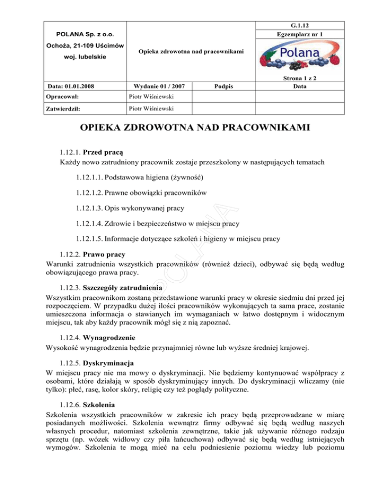 G.1.12 Egzemplarz nr 1 POLANA Sp. z o.o. OchoŜa, 21-109 Uścimów Opieka zdrowotna nad pracownikami woj. lubelskie Data: 01.01.2008 Wydanie 01 / 2007 Opracował: Piotr Wiśniewski Zatwierdził: Piotr Wiśniewski Podpis Strona 1 z 2 Data OPIEKA ZDROWOTNA NAD PRACOWNIKAMI 1.12.1. Przed pracą KaŜdy nowo zatrudniony pracownik zostaje przeszkolony w następujących tematach 1.12.1.1. Podstawowa higiena (Ŝywność) 1.12.1.2. Prawne obowiązki pracowników 1.12.1.3. Opis wykonywanej pracy 1.12.1.4. Zdrowie i bezpieczeństwo w miejscu pracy 1.12.1.5. Informacje dotyczące szkoleń i higieny w miejscu pracy 1.12.2. Prawo pracy Warunki zatrudnienia wszystkich pracowników (równieŜ dzieci), odbywać się będą według obowiązującego prawa pracy. 1.12.3. Sszczegóły zatrudnienia Wszystkim pracownikom zostaną przedstawione warunki pracy w okresie siedmiu dni przed jej rozpoczęciem. W przypadku duŜej ilości pracowników wykonujących ta sama prace, zostanie umieszczona informacja o stawianych im wymaganiach w łatwo dostępnym i widocznym miejscu, tak aby kaŜdy pracownik mógł się z nią zapoznać. 1.12.4. Wynagrodzenie Wysokość wynagrodzenia będzie przynajmniej równe lub wyŜsze średniej krajowej. 1.12.5. Dyskryminacja W miejscu pracy nie ma mowy o dyskryminacji. Nie będziemy kontynuować współpracy z osobami, które działają w sposób dyskryminujący innych. Do dyskryminacji wliczamy (nie tylko): płeć, rasę, kolor skóry, religię czy teŜ poglądy polityczne. 1.12.6. Szkolenia Szkolenia wszystkich pracowników w zakresie ich pracy będą przeprowadzane w miarę posiadanych moŜliwości. Szkolenia wewnątrz firmy odbywać się będą według naszych własnych procedur, natomiast szkolenia zewnętrzne, takie jak uŜywanie róŜnego rodzaju sprzętu (np. wózek widłowy czy piła łańcuchowa) odbywać się będą według istniejących wymogów. Szkolenia te mogą mieć na celu podniesienie poziomu wiedzy lub poziomu G.1.12 Egzemplarz nr 1 POLANA Sp. z o.o. OchoŜa, 21-109 Uścimów Opieka zdrowotna nad pracownikami woj. lubelskie Data: 01.01.2008 Wydanie 01 / 2007 Opracował: Piotr Wiśniewski Zatwierdził: Piotr Wiśniewski Podpis Strona 2 z 2 Data bezpieczeństwa w zaleŜności od okoliczności. Wewnętrzne szkolenia będą udokumentowane, a kopie wszystkich szkoleń i uprawnień powinny być przechowywane w biurze. 1.12.7. Picie wody Woda pitna powinna być dostępna nieodpłatnie dla wszystkich zatrudnionych w firmie pracowników. 1.12.8. Toalety Toalety powinny być dostosowane do obowiązujących wymagań. W pobliŜu toalet musza być zamontowane urządzenia sanitarne umoŜliwiające mycie rak. Obowiązek mycia rąk musi być przestrzegany przez wszystkich pracowników. Toalety powinny znajdować się w odległości 200m od miejsca gdzie odbywa się zbiór owoców. 1.12.9. Ogień Wszystkie miejsca powinny być oznaczone pisemna procedura postępowania na wypadek poŜaru, a wszyscy pracownicy powinni być z nią zaznajomieni. 1.12.10. Pracodawcy JeŜeli jakikolwiek produkt zostanie zakupiony u poddostawcy, kaŜdorazowo oczekujemy od niego stosowania się do wszystkich aspektów zamieszczonych w tej sekcji, a efektem tego powinno być podpisanie oświadczenia. Takie oświadczenie powinno być przechowywane w biurze 1.12.11 ETHIBASE CODE Firma zaznajomiona jest z Ethibase code i stosuje się do jego wymagań. 1.12.12. Pracownicy młodociani Za pracowników młodocianych uwaŜa się wszystkich poniŜej 16 roku Ŝycia. Mogą być oni zatrudniani tylko do wykonywania prac sezonowych lekkich (np. zbiór owoców). Pracownik taki moŜe być zatrudniony tylko i wyłącznie po okazaniu pisemnej zgody od rodziców. Pracownicy młodociani mogą jednorazowo przenosić cięŜar nie przekraczający 10 kg.