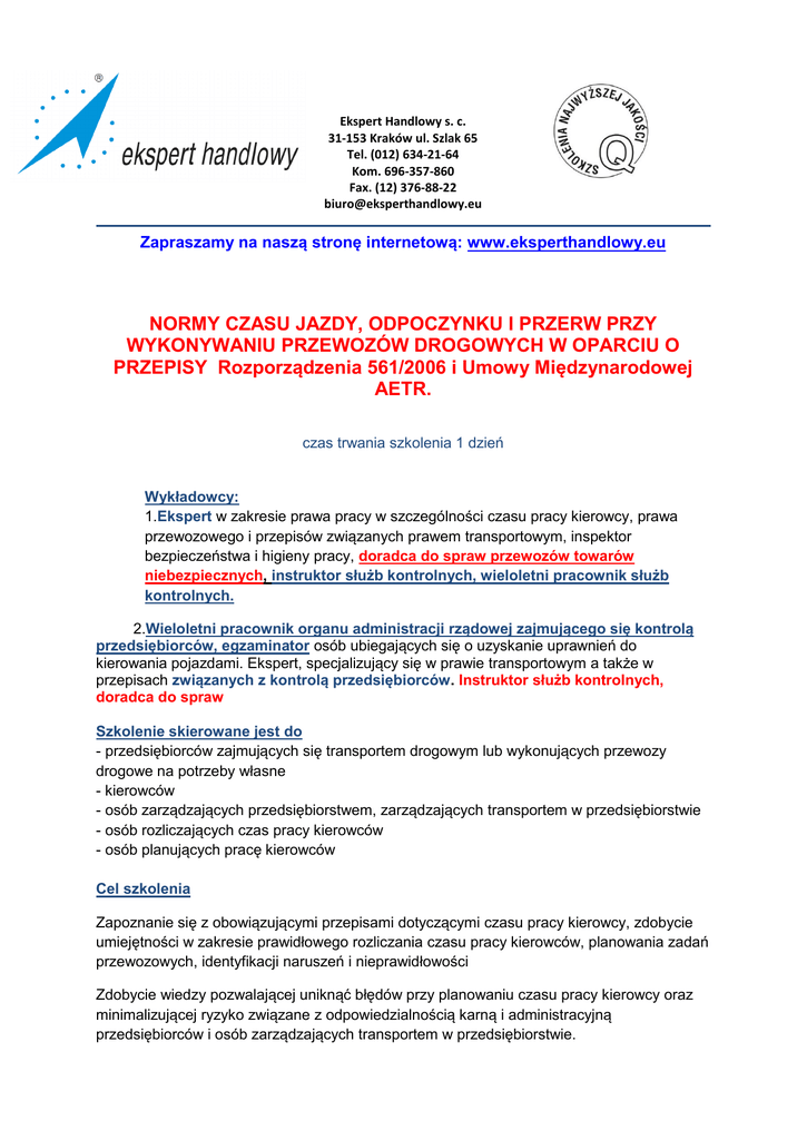 Ekspert Handlowy s. c. 31-153 Kraków ul. Szlak 65 Tel. (012) 634-21-64 Kom. 696-357-860 Fax. (12) 376-88-22 [email protected] Zapraszamy na naszą stronę internetową: www.eksperthandlowy.eu NORMY CZASU JAZDY, ODPOCZYNKU I PRZERW PRZY WYKONYWANIU PRZEWOZÓW DROGOWYCH W OPARCIU O PRZEPISY Rozporządzenia 561/2006 i Umowy Międzynarodowej AETR. czas trwania szkolenia 1 dzień Wykładowcy: 1.Ekspert w zakresie prawa pracy w szczególności czasu pracy kierowcy, prawa przewozowego i przepisów związanych prawem transportowym, inspektor bezpieczeństwa i higieny pracy, doradca do spraw przewozów towarów niebezpiecznych, instruktor służb kontrolnych, wieloletni pracownik służb kontrolnych. 2.Wieloletni pracownik organu administracji rządowej zajmującego się kontrolą przedsiębiorców, egzaminator osób ubiegających się o uzyskanie uprawnień do kierowania pojazdami. Ekspert, specjalizujący się w prawie transportowym a także w przepisach związanych z kontrolą przedsiębiorców. Instruktor służb kontrolnych, doradca do spraw Szkolenie skierowane jest do - przedsiębiorców zajmujących się transportem drogowym lub wykonujących przewozy drogowe na potrzeby własne - kierowców - osób zarządzających przedsiębiorstwem, zarządzających transportem w przedsiębiorstwie - osób rozliczających czas pracy kierowców - osób planujących pracę kierowców Cel szkolenia Zapoznanie się z obowiązującymi przepisami dotyczącymi czasu pracy kierowcy, zdobycie umiejętności w zakresie prawidłowego rozliczania czasu pracy kierowców, planowania zadań przewozowych, identyfikacji naruszeń i nieprawidłowości Zdobycie wiedzy pozwalającej uniknąć błędów przy planowaniu czasu pracy kierowcy oraz minimalizującej ryzyko związane z odpowiedzialnością karną i administracyjną przedsiębiorców i osób zarządzających transportem w przedsiębiorstwie. Program szkolenia 1. Akty prawne regulujące normy czasu prowadzenia pojazdu, wymaganych przerw i odpoczynków 2. Wyłączenia ze stosowania przepisów 3. Stosowanie urządzeń rejestrujących czas pracy kierowcy a) Zasady używania urządzeń rejestrujących - tachograf analogowy - tachograf cyfrowy b) najczęściej popełniane błędy związane z używaniem tachografu 4. Normy czasu pracy kierowcy a) b) c) d) e) 5. 6. 7. 8. Czas odpoczynku dziennego Czas jazdy dziennej Wymagana przerwa Czas jazdy tygodniowy i dwu tygodniowy Czas odpoczynku tygodniowego Zasady wykonywania przewozów w załodze dwuosobowej Odstępstwa od stosowania przepisów Interpretacje i zalecenia Komisji Europejskiej dla służb kontrolnych Odpowiedzialność za powstałe nieprawidłowości a) Odpowiedzialność kierowcy b) Odpowiedzialność przedsiębiorcy c) Odpowiedzialność innych osób 9. Dyskusja i pytania