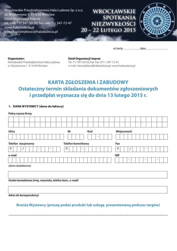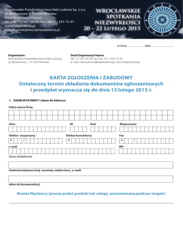 Wrocławskie Przedsiębiorstwo Hala Ludowa z o.o. Wrocławskie Przedsiębiorstwo Hala Ludowa Sp.Sp. z o.o. WROCŁAWSKIE WROCŁAWSKIE ul. Wystawowa 1, 51-618 Wrocław ul. Wystawowa 1, 51-618 Wrocław SPOTKANIA SPOTKANIA Dział Organizacji Imprez Dział Organizacji Imprez +48/71/ 347-50-50, +48/71/ 347-72-47 tel.tel. +48/71/ 347-50-50, faxfax +48/71/ 347-72-47 NIEZWYKŁOŚCI NIEZWYKŁOŚCI www.halastulecia.pl www.halastulecia.pl 20 –– 22 22 Lutego Lutego 2015 2015 20 e-mail: [email protected] e-mail: [email protected] nr karty ……………. data …………………. Organizator: Wrocławskie Przedsiębiorstwo Hala Ludowa, ul. Wystawowa 1, 51-618 Wrocław Dział Organizacji Imprez Tel. 71/ 347-50-50, Fax. Fax. 071 / 347 72 47, e-mail: [email protected], www.halastulecia.pl KARTA ZGŁOSZENIA I ZABUDOWY Ostateczny termin składania dokumentów zgłoszeniowych i przedpłat wyznacza się do dnia 13 lutego 2015 r. 1. DANE WYSTAWCY (dane do faktury) Pełna nazwa firmy Ulica Nr Telefon stacjonarny 0 e-mail / Kod Telefon komórkowy - - 0 (dane dodatkowe) - Miejscowość - Fax - 0 NIP / - - - - - Osoba kontaktowa (imię, nazwisko, telefon kom., e-mail) Adres do korespondencji Branża Wystawcy (proszę podać produkt lub usługę prezentowaną podczas targów) ....................................................................................................................................................................................................... Wrocławskie Przedsiębiorstwo Hala Ludowa Sp. z o.o. ul. Wystawowa 1, 51-618 Wrocław Dział Organizacji Imprez tel. +48/71/ 347-50-50, fax +48/71/ 347-72-47 www.halastulecia.pl 20 e-mail: [email protected] WROCŁAWSKIE SPOTKANIA NIEZWYKŁOŚCI – 22 Lutego 2015 2. ZAMAWIAM STOISKO WYSTAWIENNICZE A. ZABUDOWANE /minimum 2 m ²/ POWIERZCHNIA 2m2 3m2 4m2 5m2 6m2 7m2 8m2 9m2 10m2 CENA NETTO Zaznacz wybór √ Podaj wymiar 500 750 1000 1250 1500 1750 2000 2250 2500 powyżej 10m2 ……………………………………… 2x1 Proszę o podanie szkicu zamawianego stoiska z podaniem wymiarów długości i szerokości Standard stoiska zabudowanego obejmuje: ściany zewnętrzne i wewnętrzne stoiska, wykładzinę dywanową, stolik i dwa krzesła, szyld*, instalację elektryczną 220 V z osprzętem, 1 punkt świetlny na 4m2. *Treść dotyczące wykonania szyldu (bez opłaty) – dotyczy tylko stoisk zabudowanych ! Skrócona nazwa firmy Siedziba firmy (miasto) B. NIEZABUDOWANE W HALI /minimum 2 m ²/ POWIERZCHNIA CENA NETTO 2m2 340 Zaznacz wybór √ Podaj wymiar 2x1 3m2 510 4m2 680 5m2 850 Proszę o podanie szkicu zamawianego stoiska z podaniem wymiarów długości i szerokości 6m2 1020 7m2 1190 8m2 1360 9m2 1530 10m2 1700 powyżej 10m2 …………………………… Wrocławskie Przedsiębiorstwo Hala Ludowa Sp. z o.o. ul. Wystawowa 1, 51-618 Wrocław Dział Organizacji Imprez tel. +48/71/ 347-50-50, fax +48/71/ 347-72-47 www.halastulecia.pl 20 e-mail: [email protected] WROCŁAWSKIE SPOTKANIA NIEZWYKŁOŚCI – 22 Lutego 2015 C. NIEZABUDOWANE PRZED HALĄ /minimum 2 m ²/ POWIERZCHNIA CENA NETTO Zaznacz wybór √ Podaj wymiar 2m2 100 3m2 150 4m2 200 5m2 250 6m2 300 7m2 350 8m2 400 9m2 450 10m2 500 powyżej 10m2 ………………………… 2x1 3. BONIFIKATA NALICZANA OD POWIERZCHNI WYSTAWIENNICZEJ NIEZABUDOWANEJ. 10 % za udział we Wrocławskich Spotkaniach Niezwykłości Wiosna 2014 UWAGA ! • Lokalizacja stoisk odbywa się wyłącznie według kolejności otrzymanych: - ORGINAŁU KARTY ZGŁOSZENIA - WPŁACONEJ PRZEDPŁATY W WYSOKOŚCI 50% WARTOŚCI ZAMAWIANEGO STOISKA. • Wniesienie wpłat jest bezwzględnym warunkiem przydziału stoiska. • Minimalna powierzchnia wystawiennicza wynosi 2m². Zmiany w zabudowie stoiska, odbiegające od uzgodnionego projektu, będziemy realizować za dodatkową opłatą. 4. ZAMAWIAM DODATKOWO: 1. Stół (70cm x 70cm) 2. Krzesło 3. Podłączenie energii do stoiska niezabudowanego 4. Wieszak 5. Kosz na śmieci 6. Krzesło tapicerowane 7. Lada z półką – 0,5m² ( 1m szer. x 0,5m głęb.) 8. Lada z półką – 0,25m² 9. Regał – 0,5m² 10. Podest 1m x 0,5m² 11. Półka 12. Ściana 1m 13. Halogen 14. Lampka 15. Dodatkowy identyfikator osobowy 16. Przepustka samochodowa Razem : cena netto 25,15,40,10,10,35,80,70,90,60.40,50,30,25,15,35,- ilość Do wszystkich cen za usługi wystawiennicze zostanie doliczone 23% podatek VAT. wartość netto Wrocławskie Przedsiębiorstwo Hala Ludowa Sp. z o.o. ul. Wystawowa 1, 51-618 Wrocław Dział Organizacji Imprez tel. +48/71/ 347-50-50, fax +48/71/ 347-72-47 www.halastulecia.pl 20 e-mail: [email protected] WROCŁAWSKIE SPOTKANIA NIEZWYKŁOŚCI – 22 Lutego 2015 5. SALE WYKŁADOWE Do dyspozycji wystawców zostaną przekazane sale wykładowe. Wynajęcie sali wykładowej jest odpłatne w cenie 100 zł + VAT za 1 godzinę zegarową. Organizator zastrzega sobie prawo wyboru wykładów oraz zmiany godzin. Ostateczny termin wykładu należy telefonicznie potwierdzić z Działem Organizacji Imprez do dnia 31 stycznia 2015r. Zamawiam Salę Wykładową: Na dzień............................................................................................... godz............................................................................ Ilość godzin........................ x 100 zł netto+ 23% VAT=......................zł brutto (słownie: .................................................................................................... ..........................................................................................brutto) Imię i nazwisko prelegenta: ................................................................................................................................................................................................................................................................... Temat wykładu: .........................................................................................................................................