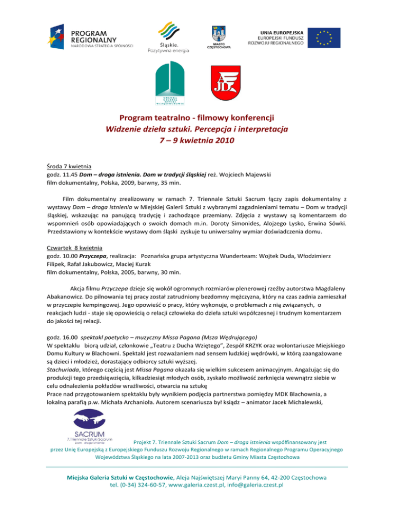 Program teatralno - filmowy konferencji Widzenie dzieła sztuki. Percepcja i interpretacja 7 – 9 kwietnia 2010 Środa 7 kwietnia godz. 11.45 Dom – droga istnienia. Dom w tradycji śląskiej reż. Wojciech Majewski film dokumentalny, Polska, 2009, barwny, 35 min. Film dokumentalny zrealizowany w ramach 7. Triennale Sztuki Sacrum łączy zapis dokumentalny z wystawy Dom – droga istnienia w Miejskiej Galerii Sztuki z wybranymi zagadnieniami tematu – Dom w tradycji śląskiej, wskazując na panującą tradycję i zachodzące przemiany. Zdjęcia z wystawy są komentarzem do wspomnieo osób opowiadających o swoich domach m.in. Doroty Simonides, Alojzego Lysko, Erwina Sówki. Przedstawiony w kontekście wystawy dom śląski zyskuje tu uniwersalny wymiar doświadczenia domu. Czwartek 8 kwietnia godz. 10.00 Przyczepa, realizacja: Poznaoska grupa artystyczna Wunderteam: Wojtek Duda, Włodzimierz Filipek, Rafał Jakubowicz, Maciej Kurak film dokumentalny, Polska, 2005, barwny, 30 min. Akcja filmu Przyczepa dzieje się wokół ogromnych rozmiarów plenerowej rzeźby autorstwa Magdaleny Abakanowicz. Do pilnowania tej pracy został zatrudniony bezdomny mężczyzna, który na czas zadnia zamieszkał w przyczepie kempingowej. Jego opowieśd o pracy, który wykonuje, o problemach z nią związanych, o reakcjach ludzi - staje się opowieścią o relacji człowieka do dzieła sztuki współczesnej i trudnym komentarzem do jakości tej relacji. godz. 16.00 spektakl poetycko – muzyczny Missa Pagana (Msza Wędrującego) W spektaklu biorą udział, członkowie „Teatru z Ducha Wziętego”, Zespół KRZYK oraz wolontariusze Miejskiego Domu Kultury w Blachowni. Spektakl jest rozważaniem nad sensem ludzkiej wędrówki, w którą zaangażowane są dzieci i młodzież, dorastający odbiorcy sztuki wyższej. Stachuriada, którego częścią jest Missa Pagana okazała się wielkim sukcesem animacyjnym. Angażując się do produkcji tego przedsięwzięcia, kilkadziesiąt młodych osób, zyskało możliwośd zerknięcia wewnątrz siebie w celu odnalezienia pokładów wrażliwości, otwarcia na sztukę Prace nad przygotowaniem spektaklu były wynikiem podjęcia partnerstwa pomiędzy MDK Blachownia, a lokalną parafią p.w. Michała Archanioła. Autorem scenariusza był ksiądz – animator Jacek Michalewski, Projekt 7. Triennale Sztuki Sacrum Dom – droga istnienia współfinansowany jest przez Unię Europejską z Europejskiego Funduszu Rozwoju Regionalnego w ramach Regionalnego Programu Operacyjnego Województwa Śląskiego na lata 2007-2013 oraz budżetu Gminy Miasta Częstochowa Miejska Galeria Sztuki w Częstochowie, Aleja Najświętszej Maryi Panny 64, 42-200 Częstochowa tel. (0-34) 324-60-57, www.galeria.czest.pl, [email protected] wikariusz, duszpasterz młodzieży. To dzięki jego pasji teatralnej powstał działający do dziś “Teatr z Ducha Wzięty…”. Przy wsparciu instruktorów MDK, jak również działającego tam zespołu KRZYK, powstało widowisko dotykające problemu przemijania, wartości moralnych, jak również poszukiwania Boga i miejsca miłości w życiu człowieka. Piątek 9 kwietnia godz. 15.00 Wrzątek frasobliwy realizacja Sławomir Krajs Jesienią 2009 r., na otwarcie 7. Triennale Sztuki Sacrum odbył się happening artystyczny wg scenariusza Andrzeja Szarka pt. Wrzątek frasobliwy. Był to przykład sztuki ulicy wychodzącej z wnętrz galerii bezpośrednio ku odbiorcy. Film dokumentuje przebieg akcji plastycznej, jej wymiar artystyczny i związki z prezentowanymi w ramach 7. Triennale Sztuki Sacrum wystawami. Projekt 7. Triennale Sztuki Sacrum Dom – droga istnienia współfinansowany jest przez Unię Europejską z Europejskiego Funduszu Rozwoju Regionalnego w ramach Regionalnego Programu Operacyjnego Województwa Śląskiego na lata 2007-2013 oraz budżetu Gminy Miasta Częstochowa Miejska Galeria Sztuki w Częstochowie, Aleja Najświętszej Maryi Panny 64, 42-200 Częstochowa tel. (0-34) 324-60-57, www.galeria.czest.pl, [email protected]