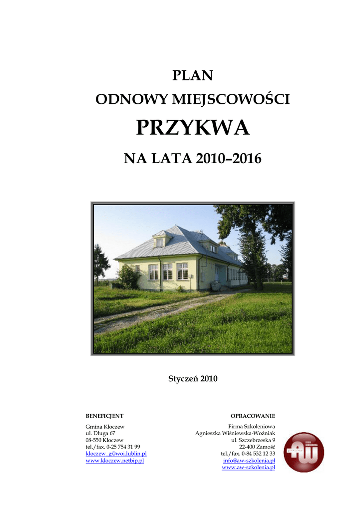 PLAN ODNOWY MIEJSCOWOŚCI PRZYKWA NA LATA 2010–2016 Styczeń 2010 BENEFICJENT Gmina Kłoczew ul. Długa 67 08-550 Kłoczew tel./fax. 0-25 754 31 99 [email protected] www.kloczew.netbip.pl OPRACOWANIE Firma Szkoleniowa Agnieszka Wiśniewska-Woźniak ul. Szczebrzeska 9 22-400 Zamość tel./fax. 0-84 532 12 33 [email protected] www.aw-szkolenia.pl Plan Odnowy Miejscowości Przykwa na lata 2010-2016 Spis treści Wstęp ..................................................................................................................................... ................................................................................................................................... 3 1. Charakterystyka miejscowości Przykwa.............................................................. 5 1.1. Położenie miejscowości Przykwa, przynależność administracyjna, powierzchnia, liczba ludności ...................................................................................................................... 5 1.2. Historia miejscowości Przykwa ................................................................................... 7 1.3. Przestrzenna struktura miejscowości Przykwa............................................................ 8 2. Inwentaryzacja zasobów służących odnowie miejscowości Przykwa............. 8 2.1. Zasoby przyrodnicze ................................................................................................... 8 2.2. Dziedzictwo kulturowe ............................................................................................... 8 2.3. Obiekty i tereny .......................................................................................................... 9 2.4. Infrastruktura społeczna ............................................................................................. 9 2.5. Infrastruktura techniczna ........................................................................................... 9 2.6. Gospodarka i rolnictwo ............................................................................................. 11 2.7. Kapitał społeczny i ludzki ......................................................................................... 12 2.8. Analiza zasobów miejscowości Przykwa.................................................................... 12 3. Ocena mocnych i słabych stron miejscowości Przykwa .................................. 14 4. Określenie, opis i uzasadnienie potrzeby realizacji zadań na lata 2010-2016 ................................................................................................................................. 17 5. Wdrożenie i monitorowanie Planu..................................................................... 20 Podsumowanie ................................................................................................................. 22 Spis tabel ........................................................................................................................... 23 Spis map ............................................................................................................................ 23 -2Plan Odnowy Miejscowości Przykwa na lata 2010-2016 został opracowany przez Firmę Szkoleniową Agnieszka Wiśniewska – Woźniak Plan Odnowy Miejscowości Przykwa na lata 2010-2016 Wstęp Plan Odnowy Miejscowości Przykwa na lata 2010-2016 stanowi podstawę rozwoju miejscowości Przykwa. Jest jednym z najważniejszych składników poprawy jakości życia i warunków pracy mieszkańców. Plan Odnowy Miejscowości Przykwa określa cele i kierunki działania oraz zadania inwestycyjne na lata 2010-2016. Głównym celem Planu jest zmniejszenie dysproporcji i różnic występujących w poziomie rozwoju obszarów wiejskich w stosunku do terenów miejskich. Przygotowanie i uchwalenie Planu jest koniecznym warunkiem przy ubieganiu się o środki finansowe w ramach „Programu Rozwoju Obszarów Wiejskich na lata 2007-2013” działanie „Odnowa i rozwój wsi”. Plan stanowić będzie także wytyczne dla władz Gminy Kłoczew przy opracowaniu kierunków rozwoju miejscowości Przykwa Celem działania „Odnowa i rozwój wsi” jest „poprawa jakości życia na obszarach wiejskich przez zaspokojenie potrzeb społecznych i kulturalnych mieszkańców wsi oraz promowanie obszarów wiejskich. Umożliwi rozwój tożsamości społeczności wiejskiej, zachowanie dziedzictwa kulturowego i specyfiki obszarów wiejskich. Działanie „Odnowa i rozwój wsi” wpłynie na wzrost atrakcyjności turystycznej i inwestycyjnej obszarów wiejskich. Realizacja działania stworzy warunki dla rozwoju społeczno-ekonomicznego obszarów wiejskich i aktywizacji ludności wiejskiej przez wsparcie inwestycyjne przyznawane na realizację projektów związanych z zagospodarowaniem przestrzeni publicznej, w tym utrzymaniem, odbudową i poprawą stanu dziedzictwa kulturowego i przyrodniczego wsi.”1 W ramach działania „Odnowa i rozwój wsi” pomoc finansową udziela się podmiotom z tytułu inwestycji obejmujących: 1. budowę, przebudowę, remont lub wyposażenie obiektów: a) pełniących funkcję publiczne, społeczno – kulturalne, rekreacyjne i sportowe, b) służących promocji obszarów wiejskich, w tym propagowaniu i zachowaniu dziedzictwa historycznego, tradycji, sztuki oraz kultury, 2. kształtowanie obszaru przestrzeni publicznej; 3. budowę, remont lub przebudowę infrastruktury związanej z rozwojem funkcji turystycznych, sportowych lub społeczno – kulturalnych; 1 www.doradcaprow.pl -3Plan Odnowy Miejscowości Przykwa na lata 2010-2016 został opracowany przez Firmę Szkoleniową Agnieszka Wiśniewska – Woźniak Plan Odnowy Miejscowości Przykwa na lata 2010-2016 4. zakup obiektów charakterystycznych dla tradycji budownictwa w danym regionie, w tym budynków będących zabytkami, z przeznaczeniem na cele publiczne; 5. odnawianie, eksponowanie lub konserwację lokalnych pomników historycznych, bud