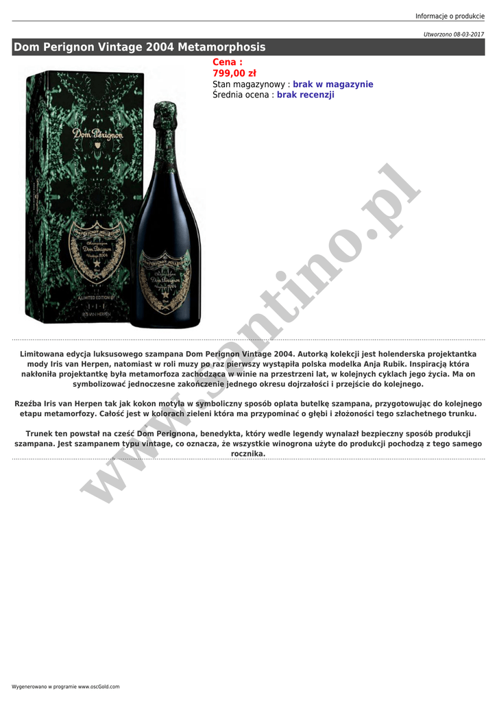 Informacje o produkcie Utworzono 08-03-2017 Dom Perignon Vintage 2004 Metamorphosis Cena : 799,00 zł an t in o. pl Stan magazynowy : brak w magazynie Średnia ocena : brak recenzji .s Limitowana edycja luksusowego szampana Dom Perignon Vintage 2004. Autorką kolekcji jest holenderska projektantka mody Iris van Herpen, natomiast w roli muzy po raz pierwszy wystąpiła polska modelka Anja Rubik. Inspiracją która nakłoniła projektantkę była metamorfoza zachodząca w winie na przestrzeni lat, w kolejnych cyklach jego życia. Ma on symbolizować jednoczesne zakończenie jednego okresu dojrzałości i przejście do kolejnego. w Rzeźba Iris van Herpen tak jak kokon motyla w symboliczny sposób oplata butelkę szampana, przygotowując do kolejnego etapu metamorfozy. Całość jest w kolorach zieleni która ma przypominać o głębi i złożoności tego szlachetnego trunku. w w Trunek ten powstał na cześć Dom Perignona, benedykta, który wedle legendy wynalazł bezpieczny sposób produkcji szampana. Jest szampanem typu vintage, co oznacza, że wszystkie winogrona użyte do produkcji pochodzą z tego samego rocznika. Wygenerowano w programie www.oscGold.com