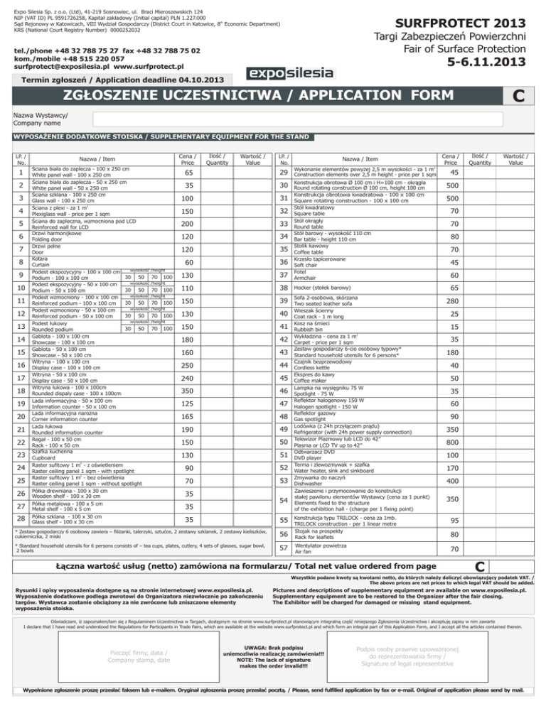 Expo Silesia Sp. z o.o. (Ltd), 41-219 Sosnowiec, ul. Braci Mieroszewskich 124 NIP (VAT ID) PL 9591726258, Kapita³ zak³adowy (Initial capital) PLN 1.227.000 S¹d Rejonowy w Katowicach, VIII Wydzia³ Gospodarczy (District Court in Katowice, 8th Economic Department) KRS (National Court Registry Number) 0000252032 SURFPROTECT 2013 Targi Zabezpieczeñ Powierzchni Fair of Surface Protection tel./phone +48 32 788 75 27 fax +48 32 788 75 02 kom./mobile +48 515 220 057 [email protected] www.surfprotect.pl 5-6.11.2013 Termin zg³oszeñ / Application deadline 04.10.2013 C ZG£OSZENIE UCZESTNICTWA / APPLICATION FORM Nazwa Wystawcy/ Company name WYPOSA¯ENIE DODATKOWE STOISKA / SUPPLEMENTARY EQUIPMENT FOR THE STAND LP. / No. 1 2 3 4 5 6 7 8 9 10 11 12 Nazwa / Item Œciana bia³a do zaplecza - 100 x 250 cm White panel wall - 100 x 250 cm Œciana bia³a do zaplecza - 50 x 250 cm White panel wall - 50 x 250 cm Œciana szklana - 100 x 250 cm Glass wall - 100 x 250 cm 2 Œciana z plexi - za 1 m Plexiglass wall - price per 1 sqm Œciana do zapleczna, wzmocniona pod LCD Reinforced wall for LCD Drzwi harmonijkowe Folding door Drzwi pe³ne Door Kotara Curtain wysokoœæ /height Podest ekspozycyjny - 100 x 100 cm 30 50 70 100 Podium - 100 x 100 cm wysokoœæ /height Podest ekspozycyjny - 50 x 100 cm 30 50 70 100 Podium - 50 x 100 cm wysokoœæ /height Podest wzmocniony - 100 x 100 cm 30 50 70 100 Reinforced podium - 100 x 100 cm wysokoœæ /height Podest wzmocniony - 50 x 100 cm 30 50 70 100 Reinforced podium - 50 x 100 cm Cena / Price Wykonanie elementów powy¿ej 2,5 m wysokoœci - za 1 m Construction elements over 2,5 m height - price per 1 sqm 60 36 130 37 Konstrukcja obrotowa Ø 100 cm i H=100 cm - okr¹g³a Round rotating construction Ø 100 cm, height 100 cm Konstrukcja obrotowa kwadratowa - 100 x 100 cm Square rotating construction - 100 x 100 cm Stó³ kwadratowy Square table Stó³ okr¹g³y Round table Stó³ barowy - wysokoœæ 110 cm Bar table - height 110 cm Stolik kawowy Coffee table Krzes³o tapicerowane Soft chair Fotel Armchair 110 38 Hocker (sto³ek barowy) 150 39 130 40 Sofa 2-osobowa, skórzana Two seated leather sofa Wieszak œcienny Coat rack - 1 m long Kosz na œmieci Rubbish bin 2 Wyk³adzina - cena za 1 m Carpet - price per 1 sqm Zestaw gospodarczy 6-cio osobowy typowy* Standard household utensils for 6 persons* Czajnik bezprzewodowy Cordless kettle Ekspres do kawy Coffee maker Lampka na wysiêgniku 75 W Spotlight - 75 W Reflektor halogenowy 150 W Halogen spotlight - 150 W Reflektor gazowy Gas spotlight Lodówka (z 24h przy³¹czem pr¹du) Refrigerator (with 24h power supply connection) Telewizor Plazmowy lub LCD do 42’’ Plasma or LCD TV up to 42’’ Odtwarzacz DVD DVD player Terma i zlewozmywak + szafka Water heater, sink and sinkboard Zmywarka do naczyñ Dishwasher Zawieszenie i przymocowanie do konstrukcji sta³ej pawilonu elementów Wystawcy (cena za 1 punkt) Elements fixed to the structure of the exhibition hall - (charge per 1 fixing point) 35 30 100 31 150 32 200 33 120 34 120 35 Pó³ka metalowa - 100 x 5 cm Metal shelf - 100 x 5 cm 35 28 Pó³ka szklana - 100 x 30 cm Glass shelf - 100 x 30 cm 35 16 17 18 19 20 21 22 23 24 25 Cena / Price Nazwa / Item 29 27 15 LP. / No. 65 26 13 Wartoœæ / Value Iloœæ / Quantity Wartoœæ / Value 2 wysokoœæ /height Podest ³ukowy 30 50 70 100 Rounded podium Gablota - 100 x 100 cm Showcase - 100 x 100 cm Gablota - 50 x 100 cm Showcase - 50 x 100 cm Witryna - 100 x 100 cm Display case - 100 x 100 cm Witryna - 50 x 100 cm Display case - 50 x 100 cm Witryna ³ukowa - 100 x 100cm Rounded dispaly case - 100 x 100cm Lada informacyjna - 50 x 100 cm Information counter - 50 x 100 cm Lada informacyjna naro¿na Corner information counter Lada ³ukowa Rounded information counter Rega³ - 100 x 50 cm Rack - 100 x 50 cm Szafka kuchenna Cupboard 2 Raster sufitowy 1 m - z oœwietleniem Raster ceiling panel 1 sqm - with spotlight 2 Raster sufitowy 1 m - bez oœwietlenia Raster ceiling panel 1 sqm - without spotlight Pó³ka drewniana - 100 x 30 cm Wooden shelf - 100 x 30 cm 14 Iloœæ / Quantity 150 41 180 42 160 43 250 44 240 45 350 46 125 47 165 48 190 49 150 50 130 51 90 52 70 53 35 54 55 * Zestaw gospodarczy 6 osobowy zawiera – filiýanki, talerzyki, sztuãce, 2 zestawy szklanek, 2 zestawy kieliszków, cukierniczka, 2 miski * Standard household utensils for 6 persons consists of – tea cups, plates, cutlery, 4 sets of glasses, sugar bowl, 2 bowls 56 57 45 500 500 70 70 80 70 45 60 65 280 25 15 35 180 40 50 35 60 90 350 800 100 170 400 350 Konstrukcja typu TRILOCK - cena za 1mb. TRILOCK construction - per 1 linear metre Stojak na prospekty Rack for leaflets 80 Wentylator powietrza Air fan 70 95 £¹czna wartoœæ us³ug (netto) zamówiona na formularzu/ Total net value ordered from page C Wszystkie podane kwoty s¹ kwotami netto, do których nale¿y doliczyæ obowi¹zuj¹cy podatek VAT. / The above prices are net prices to which legal VAT should be added. Rysunki i opisy wyposa¿enia dostêpne s¹ na stronie internetowej www.exposilesia.pl. Wyposa¿enie dodatkowe podlega zwrotowi do Organizatora niezw³ocznie po zakoñczeniu targów. Wystawca zostanie obci¹¿ony za nie zwrócone lub zniszczone elementy wyposa¿enia stoiska. Pictures and descriptions of supplementary equipment are available on www.exposilesia.pl. Supplementary equipment are to be restored to the Organizer after the fair closing. The Exhibitor will be charged for damaged or missing stand equipment. Oœwiadczam, i¿ zapozna³em/³am siê z Regulaminem Uczestnictwa w Targach, dostêpnym na stronie www.surfprotect.pl stanowi¹cym integraln¹ czêœæ niniejszego Zg³oszenia Uczestnictwa i akceptujê zapisy w nim zawarte I declare that I have read and understood the Regulations for Participants in Trade Fairs, which are available at the website www.surfprotect.pl and which form an integral part of this Application Form, and I accept all the articles contained therein. Pieczêæ f