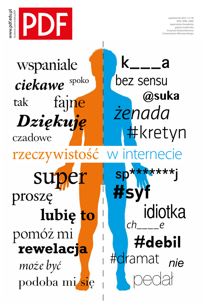 facebook.com/redakcjaPDF www.pdf.edu.pl październik 2012 / nr 38 ISSN 1898–3480 egzemplarz bezpłatny gazeta studencka Instytutu Dziennikarstwa Uniwersytetu Warszawskiego wspaniale spoko ciekawe fajne Dziękuję tak czadowe k___a bez sensu @suka żenada #kretyn rzeczywistość w internecie super sp*******j #syf proszę idiotka lubię to ch____e pomóż mi #debil rewelacja może być podoba mi się #dramat nie pedał PDF magazyn studencki – październik 2012 www.pdf.edu.pl PDF magazyn studencki – pażdziernik 2012 www.facebook.com/redakcjaPDF Temat z okładki Spokojny, wyważony, wykształcony człowiek w internecie zmienia się w nieokrzesanego chama. Nie rozmawia, a pluje jadem. Nie komentuje, tylko obraża. Skąd ta agresja? Temat z okładki Chamstwo.pl Choć powstało zaledwie kilka wideoblogów z Grażyną Żarko, to wszystkie obejrzało po kilkaset tysięcy osób. Film "Gr@żyna" pokazujący kulisy prowokacji zobaczyło dotychczas ok. 1,4 mln osób. „Pani Grażyno Żarko. Apeluję do pani, aby pani przestała istnieć na YouTube. Jeżeli się pani nie da nic przetłumaczyć, to ja mam tu dla pani osobistego tłumacza” – słyszymy głos z offu. W kadrze pojawia się kilof, którym autor nagrania metodycznie uderza w klepisko. „Tak wygląda tłumacz dla ludzi przyjebanych. A teraz ci pokażę, jak taki tłumacz działa…”. Kobieta wpatruje się w ekran. W oczach pojawiają się łzy. Kolejny film. Kadr obejmuje kartkę z narysowaną twarzą i wielkim podpisem: „Grażyna Żarko”. Po chwili na rysunek spada strumień moczu. Płakała Grażyna Żarko, autorka wideoblogu „Katolicki głos w internecie”. To do niej skierowane były te wszystkie groźby i nienawistne komentarze. Nie dziesięć, nie sto – 75 tysięcy. Odbiorcy nie akceptowali skrajnie konserwatywnych poglądów nauczycielki, która opowiadała, jak karze dzieci siedzeniem w oślej ławce, klęczeniem z doniczką i odmawianiem różańca. Żarko okazała się postacią fikcyjną, perfekcyjnie zagraną przez Annę Lisak, ciepłą i serdeczną emerytowaną nauczycielkę. Akcję wymyślili Grzegorz Cholewa i Bartłomiej Szkop, twórcy fenomenu Barbary Kwarc, równie kontrowersyjnej vlogerki. Chcieli obnażyć skalę internetowego chamstwa i pokazać, jak łatwo manipulować użytkownikami sieci. - Nie spodziewaliśmy się, aż takiej fali nienawiści – przyznali później. Nie oni jedni. 2 Jazda bez trzymanki Dyskusja w internecie rządzi się swoimi prawami. Jest bardziej zaangażowana, emocjonalna, intensywna. Mike Godwin, amerykański pisarz i prawnik już 22 lata temu podsumował to tak: „wraz z trwaniem dyskusji w Internecie, prawdopodobieństwo przyrównania czegoś lub kogoś do nazizmu lub Hitlera dąży do 1”. Argumenty zastępuje więc agresja. Dlaczego? – John Suler [amerykański psycholog, badający zachowania w sieci – przyp. red] stwierdził, że w internecie po prostu puszczają hamulce – tłumaczy Maria Cywińska, socjolog Internetu. To tzw. teoria odhamowania. – Normy społeczne z reala w sytuacji internetowej przestają nas ograniczać – dodaje. Efekt potęguje fakt, że Internet to stosunkowo nowe medium. Do lat 80. dostępne było garstce odbiorców, dziś znacznie się zdemokratyzowało: dostęp do sieci ma już ponad 60 proc. Polaków. Rzecz w tym, że nie zawsze wiemy, jak się w nim zachować. Próbujemy ustalić kodeks zachowań, sondujemy granice i nierzadko je przekraczamy. Nie zawsze umyślnie. – Sprawcom aktów agresji w internecie brakuje wyobraźni dotyczącej skutków ich działań. Często myślą, że tylko żartują – tłumaczy dr Jacek Pyżalski, pedagog z łódzkiego Instytutu Medycyny Pracy zajmujący się badaniami nad wirtualną agresją. Jak zauważa, posługując się komunikacją tekstową nie widzimy reakcji emocjonalnej drugiej osoby. Przez to ła- two można przekroczyć cienką granicę między żartem czy sarkazmem a bolesnym szyderstwem. Każdemu może się to przytrafić. Chamscy z ukrycia Bezrefleksyjności sprzyja anonimowość. – To tylko poczucie anonimowości – prostuje dr Dominik Batorski, socjolog z UW. – Większość tych osób nie potrafi się ukrywać w taki sposób, żeby były trudne do wyśledzenia – podkreśla. Jednak ta ułuda dodaje odwagi. Jeden z użytkowników zielonogórskiego forum przekonywał, że zwolenników teorii o zamachu pod Smoleńskiem należałoby zagazować. Autorem wpisu okazał się być pracownik Urzędu Kontroli Skarbowej, który pisał z adresu o charakterystycznym rozszerzeniu mofnet.gov.pl. Czy urzędnik podzieliłby się swoimi spostrzeżeniami w bezpośredniej rozmowie z petentami? Wątpliwe. Dr Pyżalski przywołuje badania, w których badani z papierowymi workami na głowie bez większych oporów zgadzali się torturować innych ludz i. Nie zamaskowani uczestnicy badań nie wykazywali już takiego entuzjazmu. Podobny mechanizm działa w sieci. – Poza internetem wiele osób w żaden sposób nie reagowałoby na pewne treści – podkreśla dr Batorski. – Sieć daje nie tylko poczucie anonimowości, ale i bezpieczeństwa. Także fizycznego, ponieważ można kogoś obrazić, nie narażając się na bezpośredni odwet. Jednak internetowa agresja ujawnia się także w sposób mniej oczywisty. Twarz Jerzego Ławrynowicza, dzielnicowego z niewielkiego Pasłęka, kilka miesięcy temu obiegła internet. Powód do dumy? Niekoniecznie, bo wizerunek wąsatego policjanta posłużył jako mem „Poproszę czisburgera. Z serem”, „Kebaby wpier.... A w domu kartofle stygną” – głoszą podpisy. – Mój autorytet dzielnicowego został zniszczony – żali się Ławrynowicz w T VN24 . Prokuratura sprawcy nie znalazła i sprawę umorzyła. Igrzyska nienawiści Okazuje się bowiem, że sianie nienawiści w internecie może być powodem do dumy. – Niektórzy szukają w sieci taniego poklasku – tłumaczy dr Pyżalski wskazując, że także akty tradycyjnej agresji szkolnej mają zazwyczaj 