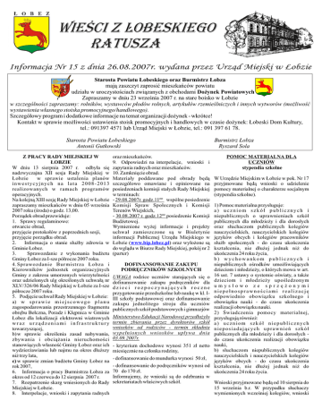 ´ WIEsCI Z lobeskiego RATUSZA Informacja Nr 15 z dnia 26.08.2007r. wydana przez Urz¹d Miejski w £obzie Starosta Powiatu £obeskiego oraz Burmistrz £obza maj¹ zaszczyt zaprosiæ mieszkañców powiatu do udzia³u w uroczystoœciach zwi¹zanych z obchodami Do¿ynek Powiatowych. Zapraszamy w dniu 23 wrzeœnia 2007 r. na stare boisko w £obzie w szczególnoœci zapraszamy: rolników, wystawców p³odów rolnych, artyku³ów rzemieœlniczych i innych wytworów (mo¿liwoœæ wystawienia w³asnego stoiska promocyjnego/handlowego). Szczegó³owy program i dodatkowe informacje na temat organizacji do¿ynek - wkrótce! Kontakt w sprawie mo¿liwoœci ustawienia stoisk promocyjnych i handlowych w czasie do¿ynek: £obeski Dom Kultury, tel.: 091397 4571 lub Urz¹d Miejski w £obzie, tel.: 091 397 61 78. Starosta Powiatu £obeskiego Antonii Gutkowski Z PRACY RADY MIEJSKIEJ W £OBZIE W dniu 13 sierpnia 2007 r. odby³a siê nadzwyczajna XII sesja Rady Miejskiej w £obzie w sprawie ustalenia planów inwestycyjnych na lata 2008-2013 realizowanych w ramach programów operacyjnych. Na kolejn¹ XIII sesjê Rady Miejskiej w £obzie zapraszamy mieszkañców w dniu 05 wrzeœnia 2007 roku (œroda) o godz. 13,00. Porz¹dek obrad przewiduje: 1. Sprawy regulaminowe: otwarcie obrad, przyjêcie protoko³ów z poprzednich sesji, przyjêcie porz¹dku obrad. 2. Informacja o stanie s³u¿by zdrowia w Gminie £obez. 3. Sprawozdanie z wykonania bud¿etu Gminy £obez za I-sze pó³rocze 2007 roku. 4. Sprawozdanie Burmistrza £obza i Kierowników jednostek organizacyjnych Gminy z zakresu umorzonych wierzytelnoœci oraz udzielonych ulg okreœlonych uchwa³¹ nr XLV/326/06 Rady Miejskiej w £obzie za I-sze pó³rocze 2007 roku. 5. Podjêcie uchwa³ Rady Miejskiej w £obzie: a) w s p r a w i e m i e j s c o w e g o p l a n u zagospodarowania przestrzennego fragmentu obrêbu Be³czna, Poradz i Klêpnica w Gminie £obez dla lokalizacji elektrowni wiatrowych wraz urz¹dzeniami infrastruktury towarzysz¹cej, b)w sprawie okreœlenia zasad nabywania, zbywania i obci¹¿ania nieruchomoœci stanowi¹cych w³asnoœæ Gminy £obez oraz ich wydzier¿awiania lub najmu na okres d³u¿szy ni¿ trzy lata, c) w sprawie zmian bud¿etu Gminy £obez na rok 2007, 6. Informacja o pracy Burmistrza £obza za okres od 12 czerwca do 12 sierpnia 2007 r. 7. Rozpatrzenie skarg wniesionych do Rady Miejskiej w £obzie. 8. Interpelacje, wnioski i zapytania radnych oraz mieszkañców. 9. Odpowiedzi na interpelacje, wnioski i zapytania radnych oraz mieszkañców. 10. Zamkniêcie obrad. Materia³y poddawane pod obrady bêd¹ szczegó³owo omawiane i opiniowane na posiedzeniach komisji sta³ych Rady Miejskiej w terminach: - 29.08.2007r. godz.11ºº wspólne posiedzenie Komisji Spraw Spo³ecznych i Komisji Terenów Wiejskich, - 30.08.2007 r. godz.12ºº posiedzenie Komisji Bud¿etowej. Wymienione wy¿ej informacje i projekty uchwa³ zamieszczone s¹ w Biuletynie informacji Publicznej Urzêdu Miejskiego w £obzie (www.bip.lobez.pl) oraz wy³o¿one s¹ do wgl¹du w Biurze Rady Miejskiej, pokój nr 2 (parter) DOFINANSOWANIE ZAKUPU PODRÊCZNIKÓW SZKOLNYCH UWAGA rodzice uczniów staraj¹cych siê o dofinansowanie zakupu podrêczników dla dzieci rozpoczynaj¹cych roczne przygotowanie przedszkolne lub naukê w kl. IIII szko³y podstawowej oraz dofinansowanie zakupu jednolitego stroju dla uczniów publicznych szkó³ podstawowych i gimnazjów Ministerstwo Edukacji Narodowej przed³u¿y³o termin zbierania przez dyrektorów szkó³ wniosków od rodziców - termin sk³adnia wype³nionych wniosków up³ywa dnia 03.09.2007r. - kryterium dochodowe wynosi 351 z³ netto miesiêcznie na cz³onka rodziny, - dofinansowanie do mundurka wynosi 50 z³, Burmistrz £obza Ryszard Sola POMOC MATERIALNA DLA UCZNIÓW stypendia szkolne W Urzêdzie Miejskim w £obzie w pok. Nr 17 przyjmowane bêd¹ wnioski o udzielenie pomocy materialnej o charakterze socjalnym (stypendia szkolne). 1) Pomoc materialna przys³uguje: a) uczniom szkó³ publicznych i niepublicznych o uprawnieniach szkó³ publicznych dla m³odzie¿y i dla doros³ych oraz s³uchaczom publicznych kolegiów nauczycielskich, nauczycielskich kolegiów jêzyków obcych i kolegiów pracowników s³u¿b spo³ecznych - do czasu ukoñczenia kszta³cenia, nie d³u¿ej jednak ni¿ do ukoñczenia 24 roku ¿ycia, b) wychowankom publicznych i niepublicznych oœrodków umo¿liwiaj¹cych dzieciom i m³odzie¿y, o których mowa w art. 16 ust. 7 ustawy o systemie oœwiaty, a tak¿e dzieciom i m³odzie¿y upoœledzonym umys³owo ze sprzê¿onymi niepe³nosprawnoœciami realizacjê odpowiednio obowi¹zku szkolnego i obowi¹zku nauki - do czasu ukoñczenia realizacji obowi¹zku nauki. 2) Œwiadczenia pomocy materialnej, przys³uguj¹ równie¿: a) uczniom szkó³ niepublicznych nieposiadaj¹cych uprawnieñ szkó³ publicznych dla m³odzie¿y i dla doros³ych do czasu ukoñczenia realizacji obowi¹zku nauki, b) s³uchaczom niepublicznych kolegiów nauczycielskich i nauczycielskich kolegiów jêzyków obcych - do czasu ukoñczenia kszta³cenia, nie d³u¿ej jednak ni¿ do ukoñczenia 24 roku ¿ycia. - dofinansowanie do podrêczników wynosi od 70 do 170 z³. Informujemy, ¿e wnioski s¹ do odebrania w sekretariatach w³aœciwych szkó³. Wnioski przyjmowane bêd¹ od 10 sierpnia do 15 wrzeœnia b.r. W przypadku s³uchaczy wymienionych wczeœniej kolegiów, wnioski przyjmowane bêd¹ od 10 sierpnia do 15 paŸdziernika b.r. Rozpatrzenie wniosku nast¹pi w ci¹gu 30 dni od ostatecznego terminu jego z³o¿enia. Podstaw¹ otrzymania stypendium jest: · miesiêczny dochód - do 351 z³otych netto na jedn¹ osobê w rodzinie · prawid³owo wype³niony wniosek z odpowiednimi za³¹cznikami Stypendia wyp³acane bêd¹ na podstawie przed³o¿onych rachunków i faktur. Faktury / rachunki powinny byæ wystawione na wnioskodawcê. WYKAZ NIERUCHOMOŒCI DO ZBYCIA W GMINIE £OBZEZ Burmistrz £obza zawiadamia, ¿e na tablicy og³oszeñ w Urzêdzie Miejskim w £o