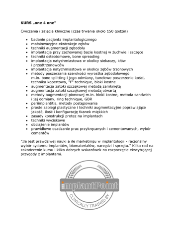 KURS „one 4 one” Ćwiczenia i zajęcia kliniczne (czas trwania około 150 godzin) badanie pacjenta implantologicznego małoinwazyjne ekstrakcje zębów techniki augmentacji zębodołu implantacja przy zachowanej bazie kostnej w żuchwie i szczęce techniki osteotomowe, bone spreading implantacja natychmiastowa w okolicy siekaczy, kłów i przedtrzonowców implantacja natychmiastowa w okolicy zębów trzonowych metody poszerzania szerokości wyrostka zębodołowego m.in. bone splitting i jego odmiany, tunelowe poszerzenie kości, technika kopertowa, "F" technique, bloki kostne augmentacja zatoki szczękowej metodą zamkniętą augmentacja zatoki szczękowej metodą otwartą metody augmentacji pionowej m.in. bloki kostne, metoda sandwich i jej odmiany, ring technique, GBR periimplantitis, metody postępowania proste zabiegi plastyczne i techniki augmentacyjne poprawiające jakość, ilość i konfigurację tkanek miękkich zasady konstrukcji protez na implantach techniki wyciskowe obciążenie implantów prawidłowe osadzanie prac przykręcanych i cementowanych, wybór cementów "Ile jest prawdziwej nauki a ile marketingu w implantologii - racjonalny wybór systemu implantów, biomateriałów, narzędzi i sprzętu." Kilka rad na zakończenie kursu i kilka dobrych wskazówek na rozpoczęcie ekscytującej przygody z implantami.