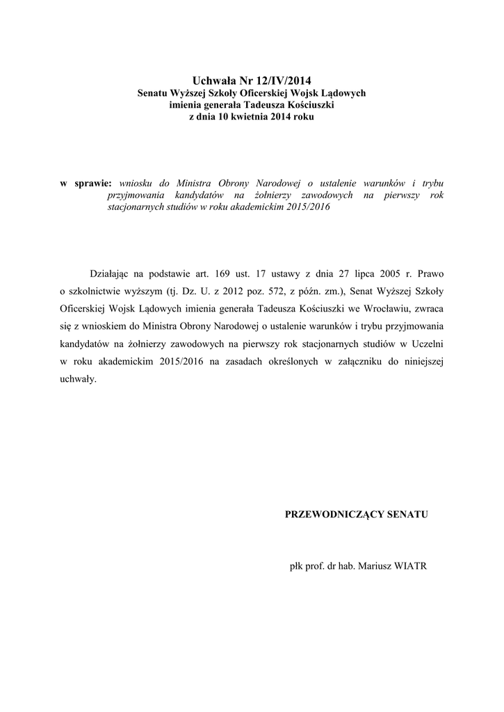 Uchwała Nr 12/IV/2014 Senatu Wyższej Szkoły Oficerskiej Wojsk Lądowych imienia generała Tadeusza Kościuszki z dnia 10 kwietnia 2014 roku w sprawie: wniosku do Ministra Obrony Narodowej o ustalenie warunków i trybu przyjmowania kandydatów na żołnierzy zawodowych na pierwszy rok stacjonarnych studiów w roku akademickim 2015/2016 Działając na podstawie art. 169 ust. 17 ustawy z dnia 27 lipca 2005 r. Prawo o szkolnictwie wyższym (tj. Dz. U. z 2012 poz. 572, z późn. zm.), Senat Wyższej Szkoły Oficerskiej Wojsk Lądowych imienia generała Tadeusza Kościuszki we Wrocławiu, zwraca się z wnioskiem do Ministra Obrony Narodowej o ustalenie warunków i trybu przyjmowania kandydatów na żołnierzy zawodowych na pierwszy rok stacjonarnych studiów w Uczelni w roku akademickim 2015/2016 na zasadach określonych w załączniku do niniejszej uchwały. PRZEWODNICZĄCY SENATU płk prof. dr hab. Mariusz WIATR Załącznik do Uchwały Senatu Nr 12/IV /2014 z dnia 10 kwietnia 2014 roku Warunki i tryb przyjmowania kandydatów na żołnierzy zawodowych na pierwszy rok studiów stacjonarnych w Wyższej Szkole Oficerskiej Wojsk Lądowych imienia generała Tadeusza Kościuszki w roku akademickim 2015 / 2016 I. WARUNKI FORMALNE 1. O przyjęcie na studia w Wyższej Szkole Oficerskiej Wojsk Lądowych (WSOWL) w charakterze kandydata na żołnierza zawodowego może ubiegać się osoba spełniająca określone warunki w Dz. U. z 2010r., N r 90, poz. 593 art. 124 pkt. 2 ustawy z dnia 11 września 2003 r. o służbie wojskowej żołnierzy zawodowych: - niekarana sądownie; - posiadająca obywatelstwo polskie; - posiadająca zdolność fizyczną i psychiczną do zawodowej służby wojskowej; - mająca co najmniej osiemnaście lat; - posiadająca świadectwo dojrzałości. 2. Limity miejsc na poszczególne kierunki studiów ustala Minister Obrony Narodowej. Podziału limitów przyjęć na korpusy i grupy osobowe dokonuje Dyrektor Departamentu Kadr MON. 3. Do przeprowadzenia postępowania rekrutacyjnego Rektor powołuje Wydziałową Komisję Rekrutacyjną (WKR) oraz Uczelnianą Komisję Rekrutacyjną (UKR). 4. Do 31 marca 2015 r. osoba ubiegająca się o przyjęcie do Uczelni ma obowiązek: a) dokonać rejestracji na stronie internetowej Uczelni – w dziale „Wirtualna Uczelnia”; b) dostarczyć do Wyższej Szkoły Oficerskiej Wojsk Lądowych (osobiście lub za pośrednictwem poczty): – wniosek do Rektora-Komendanta o przyjęcie na studia wraz z kwestionariuszem o powołanie do służby kandydackiej (do pobrania ze strony internetowej Uczelni), a także: – życiorys; – odpis skrócony aktu urodzenia. Uwaga: Niespełnienie powyższych warunków skutkuje nierozpatrywaniem kandydatury w dalszym postępowaniu rekrutacyjnym. 5. Po dokonaniu rejestracji elektronicznej i złożeniu wniosku wraz z wymaganymi dokumentami, o których mowa w punkcie 4, Uczelnia powiadamia Wojskowego Komendanta Uzupełnień o złożeniu przez osobę wniosku. Wojskowy Komendant Uzupełnień kieruje osobę ubiegającą się o przyjęcie do WSOWL - do wojskowej komisji lekarskiej w celu ustalenia zdolności fizycznej i psychicznej do pełnienia zawodowej służby wojskowej oraz do wojskowej pracowni psychologicznej w celu wydania orzeczenia psychologicznego o braku przeciwwskazań do pełnienia zawodowej służby wojskowej. 6. Wojskowy Komendant Uzupełnień po otrzymaniu orzeczeń lekarskich, o których mowa w pkt. 5, przesyła je do Rektora uczelni w terminie do 31 maja 2015 roku. II. POSTĘPOWANIE REKRUTACYJNE 1. O terminie przeprowadzenia postępowania rekrutacyjnego (etap II i III) kandydaci zostaną poinformowani co najmniej 14 dni przed terminem postępowania rekrutacyjnego. Etapy II i III postępowania rekrutacyjnego zostaną przeprowadzone w ciągu jednego (dwóch) dni. 2. Przed rozpoczęciem postępowania rekrutacyjnego, najpóźniej w dniu stawiennictwa na postępowanie rekrutacyjne w WSOWL (egzamin), kandydat ma obowiązek przedstawić następujące dokumenty: a) świadectwo dojrzałości (oryginał lub odpis); b) aktualną na dzień stawiennictwa w WSOWL informację o osobie z Krajowego Rejestru Karnego (tzw. zaświadczenie o niekaralności - oryginał). Dokument uważa się za ważny 6 miesięcy od dnia wystawienia; c) potwierdzenie dokonania opłaty rekrutacyjnej (opłata musi być wniesiona nie później niż na 7 dni przed rozpoczęciem postępowania rekrutacyjnego). Opłata nie podlega zwrotowi; d) kandydat legitymujący się świadectwem dojrzałości uzyskanym poza granicami Polski składa dodatkowo zaświadczenie wydane przez kuratora oświaty właściwego ze względu na miejsce zamieszkania kandydata nostryfikujące równoważność świadectwa uzyskanego za granicą z polskim świadectwem dojrzałości oraz tłumaczenie świadectwa dojrzałości potwierdzone przez tłumacza przysięgłego; e) inne dokumenty (poświadczenia), które mogą być rozpatrywane w trakcie rozmowy kwalifikacyjnej np.: certyfikaty znajomości języków obcych, świadectwa instruktorskie, dyplomy. 3. Harmonogram postępowania rekrutacyjnego ustala przewodniczący Wydziałowej Komisji Rekrutacyjnej. Postępowanie rekrutacyjne obejmuje trzy etapy: ETAP I - postępowanie wstępne Postępowanie wstępne obejmuje analizę przedstawionych dokumentów związanych z postępowaniem rekrutacyjnym. Uwaga: Kandydat(ka) nie zostanie zakwalifikowany(-a) do egzaminów w przypadku: a) braku lub negatywnego orzeczenia wojskowej komisji lekarskiej bądź wojskowej pracowni psychologicznej, w dniu stawiennictwa na postępowanie rekrutacyjne (egzamin) w WSOWL; b) zamieszczenia nieprawdziwych informacji w rejestracji elektronicznej; c) niedostarczenia dokumentów określonych w pkt. II ppkt 2 lit.a-d. ETAP II – postępowanie zasadnicze Postępowanie zasadnicze obejmuje analizę wyników ze świadectwa dojrzałości. Polega na określeniu punktów wniesionych z przedmiotów objętych postępowaniem rekrutacyjnym. Podstawę przyjęcia, z uwzględnieni