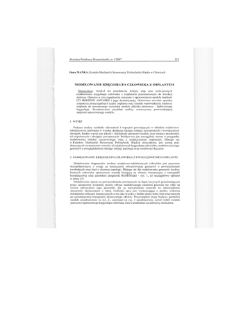 Aktualne Problemy Biomechaniki, nr 1/2007 135 Ilona M A Ń K A , Katedra Mechaniki Stosowanej, Politechnika Śląska w Gliwicach MODELOWANIE KRĘGOSŁUPA CZŁOWIEKA Z IMPLANTEM Streszczenie: Artykuł ten przedstawia kolejny etap prac poświęconych modelowaniu kręgosłupa człowieka z implantem przeznaczonym do korekcji skoliozy. Opisano w nim zagadnienia związane z opracowaniem modelu implantu CD H O R I Z O N A N T A R E S i j e g o dyskretyzacją. Omówiono również sposoby zespolenia poszczególnych części implantu oraz metody wprowadzenia struktuiy implantu do utworzonego wcześniej modelu odcinka piersiowo - lędźwiowego kręgosłupa. Przedstawiono przykład analizy numerycznej potwierdzającej spójność opracowanego modelu. 1. W S T Ę P Podczas analizy rozkładu odkształceń i naprężeń powstających w układzie mięśniowoszkieletowym człowieka w wyniku działania różnego rodzaju zewnętrznych i wewnętrznych obciążeń, bardzo ważna jest jakość i dokładność geometrii modelu oraz miejsce przyłożenia sił mięśniowych i obciążeń zewnętrznych. Problem ten jest szczególnie istotny w przypadku modelowania obiektu rzeczywistego wraz z umieszczonym implantem. Dlatego też w Katedrze Mechaniki Stosowanej Politechniki Śląskiej prowadzony jest szereg prac dotyczących wyznaczania wartości sił mięśniowych kręgosłupa człowieka, modelowania j e g o geometrii z uwzględnieniem różnego rodzaju patologii oraz możliwości leczenia. 2. M O D E L O W A N I E K R Ę G O S Ł U P A C Z Ł O W I E K A Z U W Z G L Ę D N I E N I E M I M P L A N T U Modelowanie fragmentów struktur mięśniowo-szkieletowych człowieka jest procesem skomplikowanym z uwagi na konieczność odwzorowania geometrii o powierzchniach swobodnych oraz brył o złożonej topologii. Dlatego też dla modelowania geometrii struktur kostnych człowieka opracowano metodę bazującą na obrazie otrzymanym z tomografii komputerowej oraz autorskim programie Bio3DModel - rys. 1, co szczegółowo opisano w pracy [ 1 ]. Modelowanie oparte na powierzchniach utworzonych na bazie krzywych przechodzących przez zaznaczone wcześniej punkty obrysu modelowanego elementu pozwala nie tylko na wierne odtworzenie jego geometrii, ale co najważniejsze pozwala na wprowadzanie elementów skończonych o takiej wielkości jaka jest wystarczająca z punktu widzenia dokładności obliczeń numerycznych a nie jaka wynika z bardzo dużej ilości linii otrzymanych po automatycznej triangulacji skanowanego obiektu. Poszczególne etapy budowy geometrii modelu przedstawiono na rys. 2., natomiast na rys. 3 przedstawiony został widok modelu piersiowo-lędźwiowego kręgosłupa człowieka wraz z podziałem na elementy skończone. Modelowanie kręgosłupa człowieka z implantem 136 - % - 'j IHIMiiiilWMilłi« : IF» BKY ODE :Y:ANV TW^WC Rys. 1. Widok autorskiego programu Bio3DModel Rys. 2. Kolejne etapy budowy geometrii przestrzennej kręgów lędźwiowych oraz weryfikacja spójności modelu poddanego obciążeniom strukturalnym Do budowy struktur kostnych modelu numerycznego kręgosłupa człowieka wykorzystano dziesięciowęzłowe elementy tetragonalne typu Solid 95 o nieliniowej funkcji kształtu. Bryły modelujące implant podzielono siatką heksagonalną również z wykorzystaniem elementu typu Solid 95 lecz o 20 węzłach - rys. 5. Również konieczność uwzględnienia mięśni i więzadeł, ich własności oraz zadanie odpowiednich punktów (powierzchni) przyczepu stanowi trudność na etapie modelowania. Trudność ta wynika nie tylko z konieczności uwzględnienia sił mięśniowych poszczególnych partii mięśni, ale również z potrzeby ich wcześniejszego określenia. Metodę wyznaczania sił wybranych grup układu mięśniowego kręgosłupa człowieka przedstawiono w pracy [3]. Mięśnie zamodelowano z wykorzystaniem elementu typu link 10 z opcją "tylko rozciąganie" z jednoczesnym wprowadzeniem naprężeń wstępnych. 137 I. Mańka Rys. 3. Widok modelu przestrzennego kręgosłupa picrsiowo-lędźwiowego człowieka z podziałem na elementy skończone Kolejnym etapem modelowania struktur kostnych człowieka wraz z implantem jest uwzględnienie wzajemnych więzów pomiędzy elementami implantu tj.: połączenia prętów ze śrubami, staplerami i podkładkami. Szczególnie istotne jest połączenie, w programie wykorzystującym metodę elementów skończonych, modelu kręgosłupa z implantem tj. brył opartych na powierzchniach swobodnych z brylami odzwierciedlającymi implant. Rys. 4. Przykład wprowadzania śruby implantu w struktury kostne modelu kręgu - Połączenia te można wykonać na kilka sposobów: zadanie warunków kontaktowych - co powoduje wzajemne sztywne lub podatne zespolenie elementów lecz znacznie wydłuża czas obliczeń poprzez wprowadzenie nieliniowości; Modelowanie kręgosłupa człowieka z implantem 138 - uwspólnienie powierzchni elementów będących w styku - co w przypadku brył o powierzchniach utworzonych na bazie splajnów nie jest możliwe do wykonania poprzez operacje boolowskie i należy tą operacje wykonać ręcznie poprzez podział kolejnych powierzchni modelowanych brył - rys. 4; - zadanie warunków identycznych odkształceń dla wybranej grupy węzłów; założenie elementów typu link - w a d ą tego rozwiązania jest działanie jedynie na wybranej powierzchni wynikającej z uwspólnionych węzłów elementów typu link i solid. Rys. 5. Widok modelu implantu C D H O R I Z O N A N T A R E S W dalszych etapach pracy planuje się przeprowadzenie analiz rozkładu naprężeń i odkształceń kręgosłupa człowieka z i bez implantu poddanego obciążeniom zewnętrznym w celu określenia wpływu zmian własności mięśni oraz sposobu implantacji na zmiany sztywności modelowanego układu przy różnych stopniach skrzywienia bocznego kręgosłupa. LITERATURA [1] Tejszerska D., Mańka I.:Modelowanie układu mięśniowo-szkieletowego człowieka w oparciu o zdjęcia pozyskane 