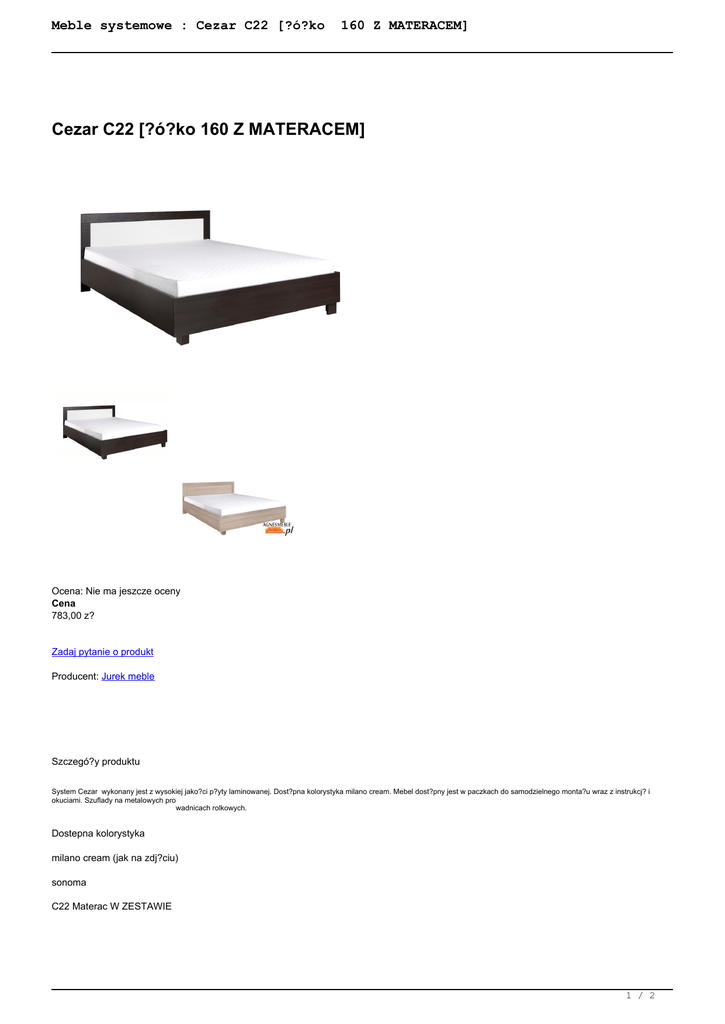 Meble systemowe : Cezar C22 [?ó?ko 160 Z MATERACEM] Cezar C22 [?ó?ko 160 Z MATERACEM] Ocena: Nie ma jeszcze oceny Cena 783,00 z? Zadaj pytanie o produkt Producent: Jurek meble Szczegó?y produktu System Cezar wykonany jest z wysokiej jako?ci p?yty laminowanej. Dost?pna kolorystyka milano cream. Mebel dost?pny jest w paczkach do samodzielnego monta?u wraz z instrukcj? i okuciami. Szuflady na metalowych pro wadnicach rolkowych. Dostepna kolorystyka milano cream (jak na zdj?ciu) sonoma C22 Materac W ZESTAWIE 1 / 2 Meble systemowe : Cezar C22 [?ó?ko Szeroko?? (cm) 166 WYMIARY Wysoko?? (cm) 83 160 Z MATERACEM] G??boko?? (cm) 206 Opinie Nikt jeszcze nie ocenia? tego produktu. 2 / 2 Powered by TCPDF (www.tcpdf.org)