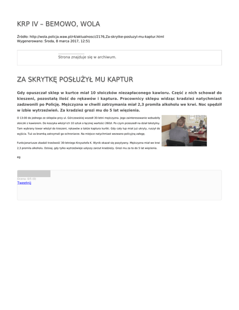 KRP IV – BEMOWO, WOLA Źródło: http://wola.policja.waw.pl/r4/aktualnosci/2176,Za-skrytke-posluzyl-mu-kaptur.html Wygenerowano: Środa, 8 marca 2017, 12:51 Strona znajduje się w archiwum. ZA SKRYTKĘ POSŁUŻYŁ MU KAPTUR Gdy opuszczał sklep w kurtce miał 10 słoiczków niezapłaconego kawioru. Część z nich schował do kieszeni, pozostałą ilość do rękawów i kaptura. Pracownicy sklepu widząc kradzież natychmiast zadzwonili po Policję. Mężczyzna w chwili zatrzymania miał 2,3 promila alkoholu we krwi. Noc spędził w izbie wytrzeźwień. Za kradzież grozi mu do 5 lat więzienia. O 13:00 do jednego ze sklepów przy ul. Górczewskiej wszedł 30-letni mężczyzna. Jego zainteresowanie wzbudziły słoiczki z kawiorem. Do koszyka włożył ich 10 sztuk o łącznej wartości 260zł. Po czym przeszedł na dział tekstylny. Tam wybrany towar włożył do kieszeni, rękawów a także kaptura kurtki. Gdy cały łup miał już ukryty, ruszył do wyjścia. Tuż za bramką zatrzymali go ochroniarze. Na miejsce natychmiast wezwano policyjną załogę. Funkcjonariusze zbadali trzeźwość 30-letniego Krzysztofa K. Wynik okazał się pozytywny. Mężczyzna miał we krwi 2,3 promila alkoholu. Dzisiaj, gdy tylko wytrzeźwieje usłyszy zarzut kradzieży. Grozi mu za to do 5 lat więzienia. eg Ocena: 0/5 (0) Tweetnij