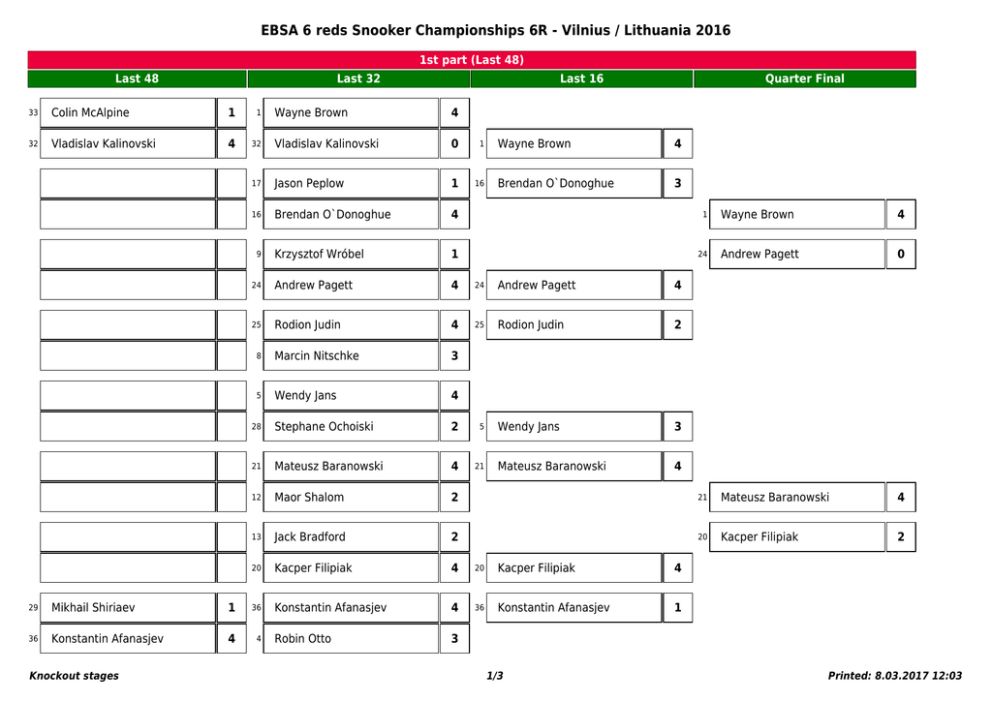 EBSA 6 reds Snooker Championships 6R - Vilnius / Lithuania 2016 1st part (Last 48) Last 48 Last 32 33 Colin McAlpine 1 1 32 Vladislav Kalinovski 4 Quarter Final Wayne Brown 4 32 Vladislav Kalinovski 0 1 17 Jason Peplow 1 16 16 Brendan O`Donoghue 4 1 Wayne Brown 4 Krzysztof Wróbel 1 24 Andrew Pagett 0 24 Andrew Pagett 4 24 Andrew Pagett 4 25 Rodion Judin 4 25 Rodion Judin 2 8 Marcin Nitschke 3 5 Wendy Jans 4 28 Stephane Ochoiski 2 5 Wendy Jans 3 21 Mateusz Baranowski 4 21 Mateusz Baranowski 4 12 Maor Shalom 2 21 Mateusz Baranowski 4 13 Jack Bradford 2 20 Kacper Filipiak 2 20 Kacper Filipiak 4 20 Kacper Filipiak 4 Konstantin Afanasjev 4 36 Konstantin Afanasjev 1 Robin Otto 3 9 29 Mikhail Shiriaev 1 36 36 Konstantin Afanasjev 4 4 Knockout stages Last 16 Wayne Brown 4 Brendan O`Donoghue 3 1/3 Printed: 8.03.2017 12:03 EBSA 6 reds Snooker Championships 6R - Vilnius / Lithuania 2016 2nd part (Last 48) Last 48 Last 32 35 Ivan Attard 4 3 30 Rune Kampe 3 Quarter Final Jake Nicholson 1 35 Ivan Attard 4 35 Ivan Attard 2 19 Ivan Kakovsky 4 19 Ivan Kakovsky 4 14 Rhys Thomas 1 19 Ivan Kakovsky 4 11 Darren Morgan 2 22 Craig MacGillivray 3 22 Craig MacGillivray 4 22 27 Vilius Schulte 2 6 6 Ryan Cronin 4 7 Shachar Ruberg 2 26 Brian Cini 4 23 Lance Little 3 10 Felix Frede 4 26 Brian Cini 1 15 Lukas Kleckers 4 15 Lukas Kleckers 4 18 Alex Taubman 2 15 Darren Ellis 1 2 Rodney Goggins 4 31 John Hartley 0 34 34 Darren Ellis 4 2 Knockout stages Last 16 Craig MacGillivray 4 Ryan Cronin 1 26 Brian Cini 4 10 Felix Frede 1 Lukas Kleckers 4 Rodney Goggins 2 2/3 Printed: 8.03.2017 12:03 EBSA 6 reds Snooker Championships 6R - Vilnius / Lithuania 2016 Final part (Last 32) Last 16 Quarter Final Semi Final Final Wayne Brown 4 16 Brendan O`Donoghue 3 1 Wayne Brown 4 24 Andrew Pagett 4 24 Andrew Pagett 0 25 Rodion Judin 2 1 5 Wendy Jans 3 21 21 Mateusz Baranowski 4 21 Mateusz Baranowski 4 20 Kacper Filipiak 4 20 Kacper Filipiak 2 36 Konstantin Afanasjev 1 21 Mateusz Baranowski 4 35 Ivan Attard 2 15 Lukas Kleckers 3 19 Ivan Kakovsky 4 19 Ivan Kakovsky 4 22 Craig MacGillivray 4 22 Craig MacGillivray 3 Ryan Cronin 1 19 Ivan Kakovsky 0 26 Brian Cini 4 15 Lukas Kleckers 4 10 Felix Frede 1 26 Brian Cini 1 15 Lukas Kleckers 4 15 Lukas Kleckers 4 Rodney Goggins 2 1 6 2 Knockout stages Wayne Brown 1 Mateusz Baranowski 4 3/3 Printed: 8.03.2017 12:03