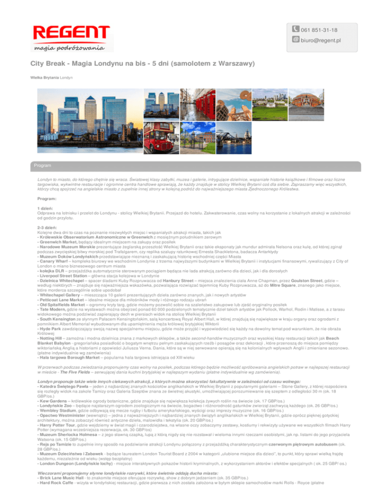 061 851-31-18 [email protected] City Break - Magia Londynu na bis - 5 dni (samolotem z Warszawy) Wielka Brytania Londyn Program Londyn to miasto, do którego chętnie się wraca. Światowej klasy zabytki, muzea i galerie, intrygujące dzielnice, wspaniałe historie książkowe i filmowe oraz liczne targowiska, wykwintne restauracje i ogromne centra handlowe sprawiają, że każdy znajduje w stolicy Wielkiej Brytanii coś dla siebie. Zapraszamy więc wszystkich, którzy chcą spojrzeć na angielskie miasto z zupełnie innej strony w kolejną podróż do najważniejszego miasta Zjednoczonego Królestwa. Program: 1 dzień: Odprawa na lotnisku i przelot do Londynu - stolicy Wielkiej Brytanii. Przejazd do hotelu. Zakwaterowanie, czas wolny na korzystanie z lokalnych atrakcji w zależności od godzin przylotu. 2-3 dzień: Kolejne dwa dni to czas na poznanie niezwykłych miejsc i wspaniałych atrakcji miasta, takich jak - Królewskie Obserwatorium Astronomiczne w Greenwich z mosiężnym południkiem zerowym - Greenwich Market, będący idealnym miejscem na zakupy oraz posiłek - Narodowe Muzeum Morskie prezentujące żeglarską przeszłość Wielkiej Brytanii oraz takie eksponaty jak mundur admirała Nelsona oraz kulę, od której zginął podczas zwycięskiej bitwy morskiej pod Trafalgarem, czy replika szalupy ratunkowej Ernesta Shackletona, badacza Antarktydy - Muzeum Doków Londyńskich przedstawiające nieznaną i zaskakującą historię wschodniej części Miasta - Canary Wharf – kompleks biurowy we wschodnim Londynie z trzema najwyższymi budynkami w Wielkiej Brytanii i instytucjami finansowymi, rywalizujący z City of London o miano biznesowego centrum miasta - kolejka DLR – przejażdżka automatycznie sterowanym pociągiem będąca nie lada atrakcją zarówno dla dzieci, jak i dla dorosłych - Liverpool Street Station – główna stacja kolejowa w Londynie - Dzielnica Whitechapel – spacer śladami Kuby Rozpruwacza od Hanbury Street – miejsca znalezienia ciała Anne Chapman, przez Goulston Street, gdzie – według niektórych – znajduje się najważniejsza wskazówka, pozwalająca rozwiązać tajemnicę Kuby Rozpruwacza, aż do Mitre Square, znanego jako miejsce, które morderca szczególnie sobie upodobał - Whitechapel Gallery – mieszcząca 10 galerii prezentujących dzieła zarówno znanych, jak i nowych artystów - Petticoat Lane Market – idealne miejsce dla miłośników mody i różnego rodzaju ubrań - Old Spitalfields Market – ogromny kryty targ, gdzie możemy pozwolić sobie na szaleństwo zakupowe lub zjeść oryginalny posiłek - Tate Modern, gdzie na wystawach można obejrzeć ponad 60 000 podzielonych tematycznie dzieł takich artystów jak Pollock, Warhol, Rodin i Matisse, a z tarasu widokowego można podziwiać zapierający dech w piersiach widok na stolicę Wielkiej Brytanii - South Kensington ze słynnym Pałacem Kensingtońskim, salą koncertową Royal Albert Hall, w której znajdują się największe w kraju organy oraz ogrodami z pomnikiem Albert Memorial wybudowanym dla upamiętnienia męża królowej brytyjskiej Wiktorii - Hyde Park zawdzięczający swoją nazwę specjalnemu miejscu, gdzie może przyjść i wypowiedzieć się każdy na dowolny temat pod warunkiem, że nie obraża Królowej - Notting Hill – zamożna i modna dzielnica znana z markowych sklepów, a także second-handów muzycznych oraz wysokiej klasy restauracji takich jak Beach Blanket Babylon - gregoriańska posiadłość o bogatym wnętrzu pełnym zaskakujących rzeźb i posągów oraz dekoracji , które przenoszą do miejsca pomiędzy wiktoriańską Anglią a historiami z opowieści Juliusza Verna. Dania, które są w niej serwowane opierają się na kolonialnych wpływach Anglii i zmieniane sezonowo. (płatne indywidualnie wg zamówienia) - Hala targowa Borough Market – popularna hala targowa istniejąca od XIII wieku W przerwach podczas zwiedzania proponujemy czas wolny na posiłek, podczas którego będzie możliwość spróbowania angielskich potraw w najlepszej restauracji w mieście - The Five Fields – serwującej dania kuchni brytyjskiej w najlepszym wydaniu (płatne indywidualnie wg zamówienia). Londyn proponuje także wiele innych ciekawych atrakcji, z których można skorzystać fakultatywnie w zależności od czasu wolnego: - Katedra Świętego Pawła – jeden z najbardziej znanych kościołów anglikańskich w Wielkiej Brytanii z popularnymi galeriami – Stone Gallery, z której rozpościera się rozległy widok na zakole Tamizy oraz Galeria Szeptów znana ze świetnej akustyki, umożliwiającej porozumiewanie się szeptem z odległości 30 m (ok. 18 GBP/os.) - Kew Gardens – królewskie ogrody botaniczne, gdzie znajduje się największa kolekcja żywych roślin na świecie (ok. 17 GBP/os.) - Londyńskie Zoo – będące najstarszym ogrodem zoologicznym na świecie, bogactwo i różnorodność gatunków zwierząt zachwycą każdego (ok. 26 GBP/os.) - Wembley Stadium, gdzie odbywają się mecze rugby i futbolu amerykańskiego, wyścigi oraz imprezy muzyczne (ok. 16 GBP/os.) - Opactwo Westminister (wewnątrz) – jedna z najważniejszych i najbardziej znanych świątyń anglikańskich w Wielkiej Brytanii, gdzie oprócz pięknej gotyckiej architektury, można zobaczyć również antyczne dzieła, malowidła i tekstylia (ok. 20 GBP/os.) - Harry Potter Tour, gdzie wejdziemy w świat magii i czarodziejstwa, na własne oczy zobaczymy zestawy, kostiumy i rekwizyty używane we wszystkich filmach Harry Potter (wymagana wcześniejsza rezerwacja, ok. 30 GBP/os) - Muzeum Sherlocka Holmesa – z jego sławną czapką, lupą z którą nigdy się nie rozstawał i wieloma innymi rzeczami osobistymi, jak np. listami do jego przyjaciela Watsona (ok. 15 GBP/os.) - Rejs po Tamizie to zupełnie inny sposób na podziwianie atrakcji Londynu połączony z przejażdżką charakterystycznym czerwonym piętrowym autobusem (ok. 28 GBP/os.) - Muzeum Dzieciństwa i Zabawek - będące laure