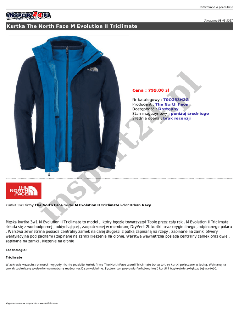 Informacje o produkcie Utworzono 08-03-2017 l Kurtka The North Face M Evolution II Triclimate 4. p Cena : 799,00 zł in sp or t2 Nr katalogowy : T0CG53H2G Producent : The North Face Dostępność : Dostępny Stan magazynowy : poniżej średniego Średnia ocena : brak recenzji Kurtka 3w1 firmy The North Face model M Evolution II Triclimate kolor Urban Navy . Męska kurtka 3w1 M Evolution II Triclimate to model , który będzie towarzyszył Tobie przez cały rok . M Evolution II Triclimate składa się z wodoodpornej , oddychającej , zaopatrzonej w membranę DryVent 2L kurtki, oraz oryginalnego , odpinanego polaru . Warstwa zewnetrzna posiada centralny zamek na całej długości z patką zapinaną na rzepy , zapinane na zamki otwory wentylacyjne pod pachami i zapinane na zamki kieszenie na dłonie. Warstwa wewnetrzna posiada centralny zamek oraz dwie , zapinane na zamki , kiezenie na dłonie Technologie : Triclimate W zakresie wszechstronności i wygody nic nie przebije kurtek firmy The North Face z serii Triclimate bo są to trzy kurtki połączone w jedną. Wpinaną na suwak techniczną podpinkę wewnętrzną można nosić samodzielnie. System ten poprawia funkcjonalność kurtki i trzykrotnie zwiększa jej wartość. Wygenerowano w programie www.oscGold.com l 4. p System kompatybilnych zamków Zip-in DryVent 2L sp or t2 Umożliwia spięcie ze sobą zewnętrznej i wewnętrznej kurtki i uzyskanie w ten sposób pojedynczego okrycia wierzchniego przeznaczonego na chłody. Produkty oznaczone tym symbolem posiadają zamki pozwalające na podpięcie do nich ocieplin lub w przypadku swetrów puchowych, fleeców, polarów oznacza możliwość podpięcia ich do kurtek. Funkcjonlana , wodoodporna i oddychająca membrana o dwuwarstwowej konstukcji . Zatrzymuje wodę nawet w najgorszych warunkach pogodowych . Zapewnia komfort i ciepło . in Polartec 100 jest bardzo lekkim oddychającym materiałem izolacyjnym, jest to oryginalny fleece o bardzo dobrych właściwościach termicznych, bluzy z tego materiału można używać jako materiał zewnętrzny, ale również jako wpinkę oferującą bardzo dobrą jakość i trwałość, jego struktura oparta jest o splot przypominający bawełniane lub wełniane włókna, ale posiada o wiele mniejszą wagę oraz lepszą oddychalnośc. Istnieją różne grubości materiału Polartec dla tego, każdy może dopasowac wartośc termiczną pod swoje potrzeby, czyli pod różne rodzaje oraz intensywnośc aktywności fizycznej. sp or t2 Kolekcja: Jesień / Zima 2016 4. p l Informacje o produkcie Dostępne opcje Kurtka The North Face M Evolution II Triclimate in rozmiar: L, XL. Wygenerowano w programie www.oscGold.com