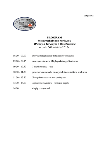Załącznik 2 PROGRAM Międzyszkolnego Konkursu Wiedzy o Turystyce i Hotelarstwie w dniu 06 kwietnia 2016r. 08.30 – 09.00 przyjazd i rejestracja uczestników konkursu 09.00 – 09.15 uroczyste otwarcie Międzyszkolnego Konkursu 09.30 – 10.30 I etap konkursu – test 10.30 – 11.30 przerwa kawowa dla nauczycieli i uczestników konkursu 11.30 – 13.30 II etap konkursu – część praktyczna 13.30 – 14.00 ogłoszenie wyników i rozdanie nagród 14.00 ciepły poczęstunek