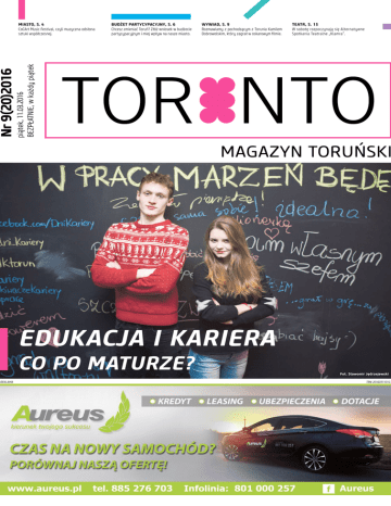 Budżet partycypacyjny, s. 6 Chcesz zmieniać Toruń? Złóż wniosek w budżecie partycypacyjnym i miej wpływ na nasze miasto. WYWIAD, s. 9 Rozmawiamy z pochodzącym z Torunia Kamilem Dobrowolskim, który zagrał w oskarowym filmie. TEATR, s. 15 W sobotę rozpoczynają się Alternatywne Spotkania Teatralne „Klamra”. Nr 9(20)2016 piątek, 11.03.2016 BEZPŁATNIE, w każdy piątek MIASTO, s. 4 CoCArt Music Festival, czyli muzyczna odsłona sztuki współczesnej. Edukacja i kariera Co po maturze? REKLAMA Fot. Sławomir Jędrzejewski TRN 2016031101G LUDZIE TORONTO TORONTO magazyn toruński www.toronto-magazyn.pl [email protected] Adres: ul. Grudziądzka 79/6 tel. 789 191 070 red.nacz. Żaneta Lipińska-Patalon wydanie bezpłatne wydawca: Interactive-Press Żaneta Lipińska-Patalon MARCIN TREICHEL Reklama: [email protected] Tel.789 223 013, Tel.789 216 119, Tel.789 223 339 Rysowaniem i projektowaniem graficznym zajmuje się od wielu lat. Doświadczenie zdobył, pracując dla dzienników regionalnych oraz współpracując z agencjami reklamowymi przy wielu różnorodnych projektach. Opracowanie graficzne: Anna Paula Szmeichel Druk: Agora SA Dobra passa dla kina związanego z Toruniem. Pierwszy nasz lokalny akcent to oczywiście Oscar dla „Syna Szawła”. Film zdobył statuetkę w kategorii: najlepszy film nieanglojęzyczny. Zagrał w nim pochodzący z Torunia Kamil Dobrowolski. Co prawda Kamil aktualnie związany jest z Rzeszowem, gdzie mieszka i pracuje w teatrze, ale to w Toruniu się wychował, chodził do liceum i rozbudził pasję do aktorstwa. Rozmowę z aktorem przeczytacie Państwo na stronie 9 tego wydania. Kolejny lokalny sukces to wyróżnienia dla filmu kręconego w Toruniu i naszym regionie. „Excentrycy, czyli po słonecznej stronie ulicy” od początku chwalony był za muzykę, która stworzyła wyjątkowy klimat tego obrazu. I muzyce się dostało i za najlepszy dźwięk też się dostało. Tak dwa Orły poleciały do Excentryków. Do tego „polskim Oskarem” nagrodzono jeszcze dwóję drugoplanowych aktorów – Wojciecha Pszoniaka i Annę Dymną. Jarek Jaworski zaprasza dziś do Dworu Artusa, gdzie będzie można zobaczyć filmy z naszego województwa. To ostatnie z prawie dwudziestu miast, gdzie będzie można zobaczyć regionalną twórczość naszych. Mamy więc kolejny dowód na to, że film i Toruń bardzo się lubią. I niech tak zostanie. Jedyne co w tym wszystkim niepokoi to pogłoski o zamknięciu kina Centrum w CSW. Mam nadzieję, że to plotki. Wiem, co to jest rentowność, mam pojęcie o kosztach utrzymania, ale uważam też, że jeżeli coś nie działa jak powinno (tego nie wiem w tym konkretnym przypadku), trzeba zrobić coś, co problem rozwiąże. Zamykania kina byłoby największą klapą i dezerterką. Może trzeba znaleźć inny kierunek, może czas na punkt zwrotny? Ale jeżeli są ludzie, którzy z tego miejsca korzystają, wracają i chcą oglądać filmy właśnie w kameralnym kinie, a nie w wielkim multipleksie to powinno się im to umożliwić. Tym bardziej że CSW jest miejscem, które mieszkańcom ma służyć i sztukę w różnych odsłonach przybliżać. Trzymam kciuki i za toruńskie kina i za toruńskie sukcesy w filmach. Serwis internetowy YouTube spowodował swoistą rewolucję w wielu dziedzinach. Jedną z nich są płyty koncertowe. Nagrywanie krążków realizowanych na żywo, po roku 2005, czyli dacie powstania YouTube, przestało być standardową procedurą. Tego typu albumy nie są już tylko stałym elementem dyskografii poszczególnych artystów czy zespołów. Oczywiście nie straciły one na znaczeniu, lecz do ich realizacji muzycy musieli poszukać nowego klucza. Artystycznie wiele więc zyskały, stając się nowym wyzwaniem zarówno dla słuchaczy, jak i ich twórców. Taką jest też koncertowa płyta Asi Czajkowskiej-Zoń nosząca tytuł „Some of my Favs. Live”. Artystka, decydując się na wydanie tego albumu, w nieszablonowy sposób otworzyła swoją dyskografię, jednocześnie pokazując słuchaczom, jak bardzo ceni szczerość w kontakcie z publicznością. Z jednej strony przedstawiła swoje inspiracje, decydując się na nieuniknioną konfrontację z wykonaniami swoich Mistrzów, z drugiej pokazała, jak wielkie emocje towarzyszą jej koncertom. Zaprosiła fanów do „swego świata”, namawiając ich zarazem do pozostania w nim do czasu pojawienia się jej autorskiej płyty, której zwiastunem jest zamieszczony jako bonus na tym albumie utwór „There’s A Place”. Dla mnie ogromnym atutem tego krążka jest jego brzmienie, oddające w pełni specyfikę klubowych koncertów w Hard Rock Pubie Pamela. Dobra passa 29 i 30 marca z Centrum Kultury Dwór Artusa zakończy się długa podróż projektu filmowego „Movies from the Heart of Poland”. Podróż po Polsce, zorganizowana naprawdę niemalże „za jeden uśmiech”. A jednocześnie jedna z największych, niezależnych akcji promocyjnych województwa w ostatnich latach. Projekt „Movies from...” jest dziełem ekipy festiwalu filmowego Tofifest z Torunia. Dwa bloki, zawierające 22 fabuły, dokumenty i teledyski z Kujaw i Pomorza, objechały blisko 20 miast polskich. Pewnie nikt nie uwierzy, ale budżet tego przedsięwzięcia nie przekroczył 4 tysięcy złotych. Promocja w całym kraju za 4 tysie? Można? Ano można. Ale tylko wtedy, jak się chce. Nam się chciało. Jeździłem z tymi filmami do wielu miejscowości na trasie i serce rosło, gdy ludzie z zapałem dyskutowali o filmach Toruniaków i Bydgoszczaków, odnajdując w nich swoje emocje i przeżycia. To tylko jeszcze jeden powód, by sensownie myśleć o wspólnej metropolii Torunia i Bydgoszczy. Na niwie kina ona już istnieje. Mocny, dobry przekaz niosą zarówno filmy toruńskie, jak i bydgoskie, a my nigdy nie dobieramy ich, patrząc skąd są. Liczy się tylko jakość. Jedna smutna nutka wkradła się w tę sprawę. Wśród filmów są dzieła ludzi z Grudziądza, z maleńkiego 