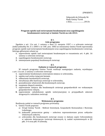 (PROJEKT) Załącznik do Uchwały Nr Rady Gminy Turek z dnia.............................2013r. Program opieki nad zwierzętami bezdomnymi oraz zapobiegania bezdomności zwierząt w Gminie Turek na rok 2013. § 1. Cele programu Zgodnie z art. 11a ust. 1 ustawy z dnia 21 sierpnia 1997 r. o ochronie zwierząt (tekst jednolity Dz. U. z 2003 r. nr 106 poz. 1002 ze zmianami) Gmina Turek wprowadza program opieki nad zwierzętami bezdomnymi oraz zapobiegania bezdomności zwierząt, którego głównymi celami są: 1. zapewnienie opieki nad zwierzętami bezdomnymi w rozumieniu art. 4 pkt. 16 ustawy o ochronie zwierząt, 2. zapobieganie bezdomności zwierząt, 3. zmniejszanie populacji bezdomnych zwierząt. § 2. Zadania w ramach programu W ramach programu Gmina Turek realizuje następujące zadania, wynikające z art. 11a ust. 2 ustawy o ochronie zwierząt: 1. zapewnienie bezdomnym zwierzętom miejsca w schronisku, 2. opieka nad wolno żyjącymi kotami, 3. odławianie bezdomnych zwierząt, 4. sterylizacja albo kastracja zwierząt w schronisku, 5. poszukiwanie właścicieli dla bezdomnych zwierząt, 6. usypianie ślepych miotów, 7. zapewnienie miejsca dla bezdomnych zwierząt gospodarskich we wskazanym gospodarstwie rolnym, 8. zapewnienie całodobowej opieki weterynaryjnej w przypadkach zdarzeń drogowych z udziałem zwierząt. § 3. Wykonawcy programu Realizację zadań w ramach programu prowadzą: 1. Gmina Turek poprzez: a) Urząd Gminy Turek - Referat Inwestycji, Gospodarki Komunalnej i Rozwoju Lokalnego, b) jednostki pomocnicze gminy – sołectwa reprezentowane przez sołtysów właściwych sołectw, c) schronisko dla bezdomnych zwierząt zwane w dalszej części Schroniskiem w zakresie dotyczącym zwierząt domowych, tj. zadań wymienionych w §2 pkt. 3-6 oraz pkt. 8 uchwały, 2. organizacje społeczne, stowarzyszenia, fundacje, których statutowym celem działania jest ochrona zwierząt przez współpracę z organami wymienionymi w ust. 1, w zakresie zadań wymienionych w §2 pkt 2, 5 uchwały. 3. Jednostki wymienione w ust. 1 i 2 współpracują w swym zakresie z Powiatową Inspekcją Weterynaryjną. § 4. Zapewnienie bezdomnym zwierzętom miejsca w schronisku dla zwierząt: 1. Schronisko przyjmuje i zapewnia opiekę bezdomnym zwierzętom domowym z terenu gminy Turek, na podstawie zawartej umowy, 2. szczegółowy sposób postępowania ze zwierzętami w Schronisku określa Regulamin Schroniska. § 5. Opieka nad wolno żyjącymi kotami: 1. Na terenie gminy Turek opiekę nad wolno żyjącymi kotami realizuje się poprzez współpracę Gminy Turek z sołtysami oraz organizacjami społecznymi, których statutowym celem działania jest ochrona zwierząt, na podstawie zawartych umów. 2. Opieka nad wolno żyjącymi kotami, o której mowa w ust. 1 obejmuje: a) ustalenie miejsc bytowania kotów wolno żyjących, b) tworzenie i prowadzenie rejestru społecznych opiekunów kotów wolno żyjących, c) zapewnienie dokarmiania kotów wolno żyjących przy udziale społecznych opiekunów. 1. 2. 3. 4. 5. § 6. Odławianie bezdomnych zwierząt: Odławianiu podlegają zwierzęta domowe i gospodarskie, które uciekły, zabłąkały się bądź zostały porzucone przez człowieka, a nie jest możliwe ustalenie właściciela lub innej osoby, pod której opieką zwierzę dotąd pozostawało. Bezdomne zwierzęta z terenu gminy Turek podlegają stałemu odławianiu – zgłoszenia od mieszkańców dotyczące bezdomnych zwierzętach przyjmuje pracownik Urzędu Gminy Turek. Odławianie zwierząt bezdomnych może być prowadzone wyłącznie za pomocą specjalistycznego sprzętu, który nie będzie stwarzał zagrożenia dla życia i zdrowia wyłapanych zwierząt, a także nie będzie zadawał im cierpienia. Odłowione zwierzęta domowe podlegają przewiezieniu do Schroniska. Odłowione zwierzęta gospodarskie podlegają przewiezieniu do gospodarstwa rolnego wskazanego przez Gminę. § 7. Sterylizacja / kastracja zwierząt w schronisku: 1. Gmina realizuje obligatoryjną sterylizację/kastrację zwierząt bezdomnych umieszczonych w Schronisku zgodnie z Regulaminem Schroniska lub odrębną umową. 2. Zabiegom, o których mowa w ust. 1, nie podlegają: a) zwierzęta w okresie 14 dni od umieszczenia ich w Schronisku z uwagi na możliwość zgłoszenia się właściciela lub opiekuna; b) zwierzęta, u których z uwagi na stan zdrowia lub wiek istnieją przeciwwskazania do wykonania tych zabiegów. 1. 2. 3. 4. § 8. Poszukiwanie właścicieli dla bezdomnych zwierząt: Po odbyciu 14 dniowej kwarantanny zwierzęta przebywające w Schronisku zostają poddane zabiegom lekarsko – weterynaryjnym zgodnie z Regulaminem Schroniska, a następnie mogą być przeznaczone do adopcji. Schronisko aktywnie uczestniczy w działaniach, mających zapewnić bezdomnym zwierzętom stałą opiekę, w szczególności poprzez podawanie w środkach masowego przekazu (internet, prasa, tablica ogłoszeń) informacji o zwierzętach oczekujących na adopcję. Zwierzę przebywające w Schronisku może być adoptowane wyłącznie przez osobę pełnoletnią posiadającą dowód tożsamości z adresem zameldowania, po podpisaniu umowy adopcyjnej. Na stronie internetowej Urzędu Gminy Turek publikowane będą informacje o zwierzętach czekających na adopcję. § 9. Usypianie ślepych miotów: Usypianie ślepych miotów może być wykonane wyłącznie przez lekarza weterynarii w Schronisku lub w lecznicy dla zwierząt. §10. Zapewnienie miejsca dla zwierząt gospodarskich we wskazanym gospodarstwie rolnym: 1. Gmina wskazuje gospodarstwo rolne, spełniające wymagania określone w odrębnych przepisach, które będzie przyjmować i zapewniać opiekę bezdomnym zwierzętom gospodarskim oraz zwierzętom gospodarskim z terenu gminy Turek traktowanym w sposób określony w art. 6 ust. 2 ustawy o ochronie zwierząt. 2. Szczegółowy sposób postępowania w gospodarstwie ze zwierzętami gospodarskimi określa porozumienie. § 11. Zapewnienie całodobowej opieki 