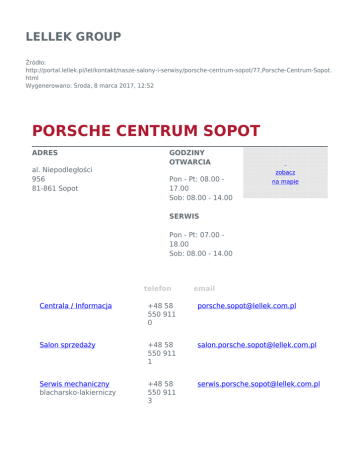 LELLEK GROUP Źródło: http://portal.lellek.pl/lel/kontakt/nasze-salony-i-serwisy/porsche-centrum-sopot/77,Porsche-Centrum-Sopot. html Wygenerowano: Środa, 8 marca 2017, 12:52 PORSCHE CENTRUM SOPOT ADRES al. Niepodległości 956 81-861 Sopot GODZINY OTWARCIA Pon - Pt: 08.00 17.00 Sob: 08.00 - 14.00 zobacz na mapie SERWIS Pon - Pt: 07.00 18.00 Sob: 08.00 - 14.00 telefon email Centrala / Informacja +48 58 550 911 0 [email protected] Salon sprzedaży +48 58 550 911 1 [email protected] Serwis mechaniczny blacharsko-lakierniczy +48 58 550 911 3 [email protected] Dział Części Zamiennych i Akcesoriów +48 58 550 911 5 Fax +48 58 550 911 6 [email protected] Dedykowana strona www zobacz wnętrze Tweetnij