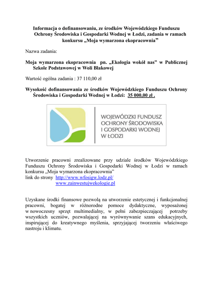Informacja o dofinansowaniu, ze środków Wojewódzkiego Funduszu Ochrony Środowiska i Gospodarki Wodnej w Łodzi, zadania w ramach konkursu „Moja wymarzona ekopracownia” Nazwa zadania: Moja wymarzona ekopracownia pn. „Ekologia wokół nas” w Publicznej Szkole Podstawowej w Woli Blakowej Wartość ogólna zadania : 37 110,00 zł Wysokość dofinansowania ze środków Wojewódzkiego Funduszu Ochrony Środowiska i Gospodarki Wodnej w Łodzi: 35 000,00 zł . Utworzenie pracowni zrealizowane przy udziale środków Wojewódzkiego Funduszu Ochrony Środowiska i Gospodarki Wodnej w Łodzi w ramach konkursu „Moja wymarzona ekopracownia” link do strony http://www.wfosigw.lodz.pl/ www.zainwestujwekologie.pl Uzyskane środki finansowe pozwolą na utworzenie estetycznej i funkcjonalnej pracowni, bogatej w różnorodne pomoce dydaktyczne, wyposażonej w nowoczesny sprzęt multimedialny, w pełni zabezpieczającej potrzeby wszystkich uczniów, pozwalającej na wyrównywanie szans edukacyjnych, inspirującej do kreatywnego myślenia, sprzyjającej tworzeniu właściwego nastroju i klimatu.
