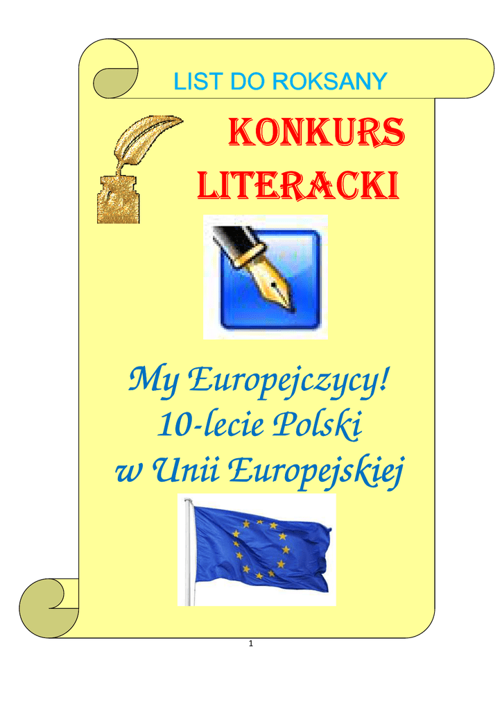 LIST DO ROKSANY KONKURS LITERACKI My Europejczycy! 1010-lecie Polski w Unii Europejskiej 1 Jarantowice, 15.06. 2014 r. Witaj Droga Roksano! Roksano! Jestem Polką i tak jak Ty Europejką. Uczę się w V klasie w Szkole Podstawowej w Jarantowicach. Jest to wieś położona w centrum historycznej Ziemi Chełmińskiej niedaleko Torunia, gdzie się urodził Mikołaj Kopernik. W tym roku Polacy świętują 10 – lecie w Unii Europejskiej. Postanowiłam do Ciebie napisać, by opowiedzieć Ci o ogromnych zmianach jakie zaszły w moim regionie. Z funduszy unijnych w 2006 roku w Wąbrzeźnie w ramach Zintegrowanego Programu Operacyjnego Rozwoju Regionalnego wybudowano w błyskawicznym tempie obwodnicę z trzema rondami o długości 7,768 km. Moi rodzice podkreślają, że jest to jedna z najważniejszych inwestycji, bowiem przez miasto i rynek prowadzony był ruch tranzytowy. Teraz mieszkańcy uzyskali łatwiejszy dostęp do zatrudnienia, szkół, ośrodków kulturalnych, sportowych i turystycznych. Nowa droga poprawiła też bezpieczeństwo, obniżyła poziom hałasu i emisji spalin. A co najważniejsze, nasze miasto wypiękniało. Dzięki środkom z Europejskiego Funduszu Rozwoju Regionalnego zrewitalizowano też serce miasta Rynek. Jest to Plac Jana Pawła II naszego ukochanego Papieża. Centrum miasta jest teraz odnowione, 2 zadbano również o piękną zieleń. Kolejnym przykładem dobrych praktyk jest budowa ścieżek rowerowych. Wdrożenie projektu przyczyni się do poprawy atrakcyjności turystycznej miasta, rozwinie sektor usługowy i poprawi jakość życia mieszkańców. Wiem Droga Roksano, że w Twoim kraju postępowi politycy chcieliby, by Ukraina została członkiem Unii Europejskiej. Myślę, że przyszłość Twojego kraju leży w Europie. Być "bliżej" Europy dawałoby Wam lepsze szanse szybszych zmian i rozwoju tak jak w Polsce. W naszej Gminie w Ramach Programu Rozwoju Obszarów Wiejskich pobudowano lub zmodernizowano i bogato wyposażono remizy i budynki świetlic wiejskich wraz z parkingami i placem zabaw. Zagospodarowano tereny zielone. Miła Koleżanko! Zapraszam Cię do mojej Gminy. Jest się czym pochwalić! Dzięki unijnym dotacjom już wszędzie są nowe kanalizacje sanitarne. Jak przyjedziesz zabiorę Cię do nowo urządzonego Centrum Sportowego w Zieleniu i Ryńsku. W miejscowości Wronie, która słynie z pięknych lasów urządzono Izbę Łowiecką. Obecnie trwają prace nad modernizacją Ośrodka Wypoczynkowego w Przydworzu oraz utworzeniem Centrum Tradycji Rybackich w Orzechówku. Jednakże Droga Roksano! najbardziej cieszę sie ze zmian w mojej wsi. Przy nowo dobudowanej szkole także urządzono Plac Zabaw i Przedszkole „Promyczek“ 3 .Placówka jest bogato wyposażona dzięki dotacjom unijnym, jest pracownia komputerowa, w klasach są tablice interaktywne. Napisz Roksano! jak idzie Ci nauka języka angielskiego. Ja uczę się języków obcych już od 6 lat. W klasie III brałam udział w dodatkowych zajęciach z języka angielskiego "Learning English is Fun" . Jest to Program stworzony przez Europosła Janusza Zemke, realizowany na terenie całego województwa kujawsko pomorskiego. Kurs ukończyłam z wyróżnieniem. W tym roku w mojej szkole zorganizowano Powiatowy Konkurs Wiedzy o Krajach Anglojęzycznych „I Want to Visit EnglishEnglish-Speaking Countries” . Muszę Ci się pochwalić , że byłam jedną z osób w naszej trzyosobowej grupie , która zdobyła I miejsce. Mówię też już nieźle po angielsku. Polish membership in European Union is the chance for young people to meet new friends and see many interesting places. Uczniowie klasy II realizują też projekt edukacyjny EDUSCIENCE – "Podnoszenie kompetencji uczniowskich z wykorzystaniem innowacyjnych metod i technologii. W ramach tego projektu korzystają z nowoczesnej platformy e-learningowej. Uczestniczą w transmisjach video z Polskiej Stacji Polarnej, która znajduje się na Spitsbergenie. Jak widzisz Roksano przez 10 lat obecności Polski w Unii Europejskiej nasz kraj dokonał olbrzymiego skoku cywilizacyjnego w każdej dziedzinie życia. Polacy 4 mogą podróżować i zwiedzać Europę. Wiele szkół współpracuje i młodzież uczy sie za granicą, zdobywając nowe doświadczenie. Zmniejszyło się bezrobocie. Rozwinął sie przemysł, nastąpił wzrost obrotów handlowych. Jest napływ nowych technologii oraz unowocześnienie metod zarządzania. Rolnicy korzystają z dopłat unijnych. Produkuje sie zdrową, ekologiczną żywność. Życzę Ci równiez w Twoim kraju dużych zmian. Napisz, czy dostrzegacie zmiany, które zachodzą w innych krajach należących do Unii. Opisz jak wygląda Twoja szkoła i miejscowość i jak Wam sie na co dzień żyje. My Europejczycy będziemy zawsze razem! Na dowód naszej przyjaźni ślę Ci naszą maskotkę europejską – Syriusza. Pozdrawiam Ellis 5 Ps. Przesyłam Ci moje pamiątkowe zdjęcie z konkursu. Jeśli możesz to prześlij mi także Swoją fotkę. 6