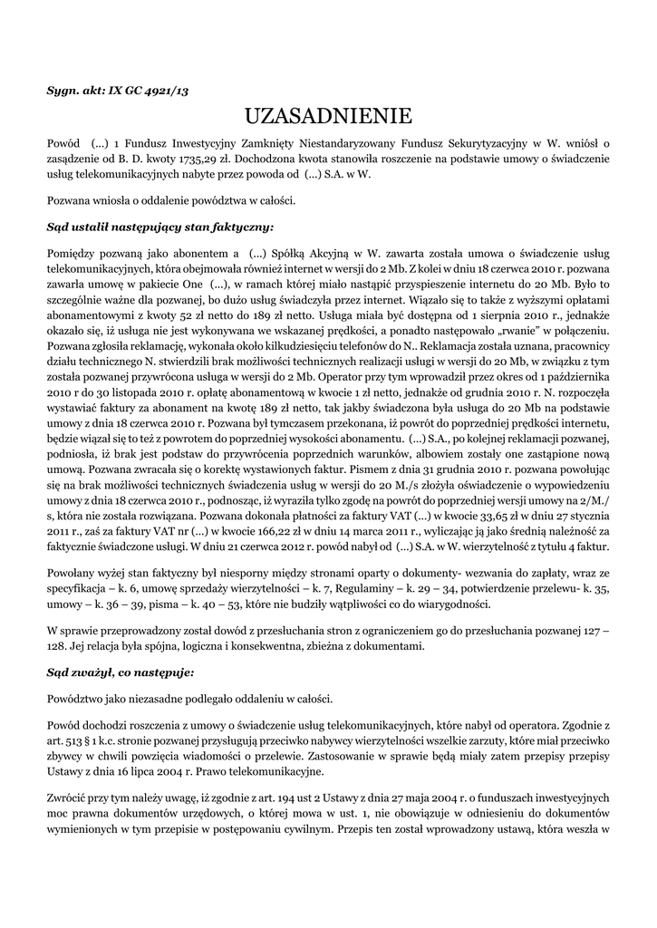Sygn. akt: IX GC 4921/13 UZASADNIENIE Powód (...) 1 Fundusz Inwestycyjny Zamknięty Niestandaryzowany Fundusz Sekurytyzacyjny w W. wniósł o zasądzenie od B. D. kwoty 1735,29 zł. Dochodzona kwota stanowiła roszczenie na podstawie umowy o świadczenie usług telekomunikacyjnych nabyte przez powoda od (...) S.A. w W. Pozwana wniosła o oddalenie powództwa w całości. Sąd ustalił następujący stan faktyczny: Pomiędzy pozwaną jako abonentem a (...) Spółką Akcyjną w W. zawarta została umowa o świadczenie usług telekomunikacyjnych, która obejmowała również internet w wersji do 2 Mb. Z kolei w dniu 18 czerwca 2010 r. pozwana zawarła umowę w pakiecie One (...), w ramach której miało nastąpić przyspieszenie internetu do 20 Mb. Było to szczególnie ważne dla pozwanej, bo dużo usług świadczyła przez internet. Wiązało się to także z wyższymi opłatami abonamentowymi z kwoty 52 zł netto do 189 zł netto. Usługa miała być dostępna od 1 sierpnia 2010 r., jednakże okazało się, iż usługa nie jest wykonywana we wskazanej prędkości, a ponadto następowało „rwanie” w połączeniu. Pozwana zgłosiła reklamację, wykonała około kilkudziesięciu telefonów do N.. Reklamacja została uznana, pracownicy działu technicznego N. stwierdzili brak możliwości technicznych realizacji usługi w wersji do 20 Mb, w związku z tym została pozwanej przywrócona usługa w wersji do 2 Mb. Operator przy tym wprowadził przez okres od 1 października 2010 r do 30 listopada 2010 r. opłatę abonamentową w kwocie 1 zł netto, jednakże od grudnia 2010 r. N. rozpoczęła wystawiać faktury za abonament na kwotę 189 zł netto, tak jakby świadczona była usługa do 20 Mb na podstawie umowy z dnia 18 czerwca 2010 r. Pozwana był tymczasem przekonana, iż powrót do poprzedniej prędkości internetu, będzie wiązał się to też z powrotem do poprzedniej wysokości abonamentu. (...) S.A., po kolejnej reklamacji pozwanej, podniosła, iż brak jest podstaw do przywrócenia poprzednich warunków, albowiem zostały one zastąpione nową umową. Pozwana zwracała się o korektę wystawionych faktur. Pismem z dnia 31 grudnia 2010 r. pozwana powołując się na brak możliwości technicznych świadczenia usług w wersji do 20 M./s złożyła oświadczenie o wypowiedzeniu umowy z dnia 18 czerwca 2010 r., podnosząc, iż wyraziła tylko zgodę na powrót do poprzedniej wersji umowy na 2/M./ s, która nie została rozwiązana. Pozwana dokonała płatności za faktury VAT (...) w kwocie 33,65 zł w dniu 27 stycznia 2011 r., zaś za faktury VAT nr (...) w kwocie 166,22 zł w dniu 14 marca 2011 r., wyliczając ją jako średnią należność za faktycznie świadczone usługi. W dniu 21 czerwca 2012 r. powód nabył od (...) S.A. w W. wierzytelność z tytułu 4 faktur. Powołany wyżej stan faktyczny był niesporny między stronami oparty o dokumenty- wezwania do zapłaty, wraz ze specyfikacja – k. 6, umowę sprzedaży wierzytelności – k. 7, Regulaminy – k. 29 – 34, potwierdzenie przelewu- k. 35, umowy – k. 36 – 39, pisma – k. 40 – 53, które nie budziły wątpliwości co do wiarygodności. W sprawie przeprowadzony został dowód z przesłuchania stron z ograniczeniem go do przesłuchania pozwanej 127 – 128. Jej relacja była spójna, logiczna i konsekwentna, zbieżna z dokumentami. Sąd zważył, co następuje: Powództwo jako niezasadne podlegało oddaleniu w całości. Powód dochodzi roszczenia z umowy o świadczenie usług telekomunikacyjnych, które nabył od operatora. Zgodnie z art. 513 § 1 k.c. stronie pozwanej przysługują przeciwko nabywcy wierzytelności wszelkie zarzuty, które miał przeciwko zbywcy w chwili powzięcia wiadomości o przelewie. Zastosowanie w sprawie będą miały zatem przepisy przepisy Ustawy z dnia 16 lipca 2004 r. Prawo telekomunikacyjne. Zwrócić przy tym należy uwagę, iż zgodnie z art. 194 ust 2 Ustawy z dnia 27 maja 2004 r. o funduszach inwestycyjnych moc prawna dokumentów urzędowych, o której mowa w ust. 1, nie obowiązuje w odniesieniu do dokumentów wymienionych w tym przepisie w postępowaniu cywilnym. Przepis ten został wprowadzony ustawą, która weszła w życie w dniu 20 lipca 2013 r. Nie przewidziano przepisów przejściowych, dlatego też jako przepis proceduralny, ma on zastosowanie do postępowań nawet w toku. Zatem nie można stosować domniemań zgodności z rzeczywistością wpisów w księgach powoda w postępowaniu cywilnym. W pierwszej kolejności wskazać należy, iż powód co do zasady nie udowodnił swego roszczenia. W wezwaniu do zapłaty – k. 6 V zawarta jest specyfikacja roszczenia. Wymienione są 4 faktury, ale nie zostały one złożone przez powoda, co nie pozwala na uznanie żądania w sposób należycie uzasadnione, zwłaszcza nie pozwala na ustalenie konkretnych tytułów ich wystawienia. Powód nie odniósł się też w żaden sposób do płatności dokonanych przez pozwaną, jeszcze zanim wierzytelność została nabyta, które przynajmniej częściowo zmniejszałaby dochodzoną kwotę. Biorąc jednak pod uwagę wykazane przez pozwaną okoliczności – braku możliwości świadczenia usług w umówionym zakresie, dokonanie płatności w wysokości określonej przez pozwaną, w stosunku do faktycznie świadczonej usługi, przerzucało na powoda obowiązek wykazania, sprecyzowania, jaka część nieświadczonej usługi odpowiadała określonemu składnikowi abonamentu. Umowa o świadczenie usług telekomunikacyjnych jest również umową wzajemną. Zgodnie z art. 488 § 1 świadczenia będące przedmiotem zobowiązań z umów wzajemnych (świadczenia wzajemne) powinny być spełnione jednocześnie, chyba że z umowy, z ustawy albo z orzeczenia sądu lub decyzji innego właściwego organu wynika, iż jedna ze stron obowiązana jest do wcześniejszego świadczenia. Zgodnie zaś z § 2 wskazanego przepisu jeżeli świadczenia wzajemne powinny być spełnione jednocześnie, każda ze s