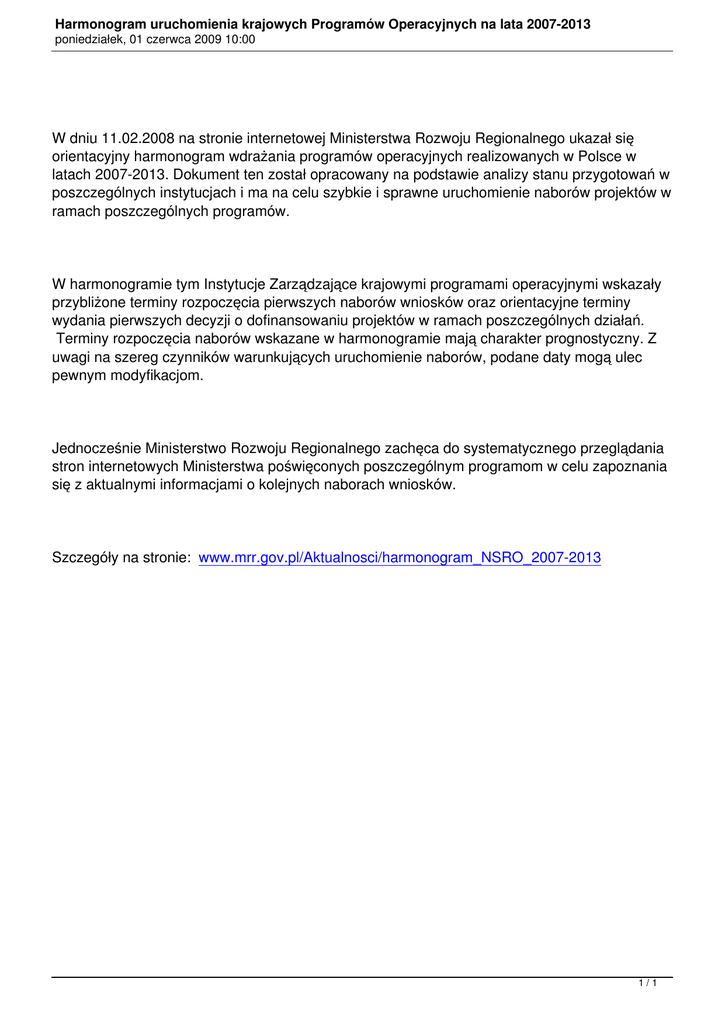 Harmonogram uruchomienia krajowych Programów Operacyjnych na lata 2007-2013 poniedziałek, 01 czerwca 2009 10:00 W dniu 11.02.2008 na stronie internetowej Ministerstwa Rozwoju Regionalnego ukazał się orientacyjny harmonogram wdrażania programów operacyjnych realizowanych w Polsce w latach 2007-2013. Dokument ten został opracowany na podstawie analizy stanu przygotowań w poszczególnych instytucjach i ma na celu szybkie i sprawne uruchomienie naborów projektów w ramach poszczególnych programów. W harmonogramie tym Instytucje Zarządzające krajowymi programami operacyjnymi wskazały przybliżone terminy rozpoczęcia pierwszych naborów wniosków oraz orientacyjne terminy wydania pierwszych decyzji o dofinansowaniu projektów w ramach poszczególnych działań. Terminy rozpoczęcia naborów wskazane w harmonogramie mają charakter prognostyczny. Z uwagi na szereg czynników warunkujących uruchomienie naborów, podane daty mogą ulec pewnym modyfikacjom. Jednocześnie Ministerstwo Rozwoju Regionalnego zachęca do systematycznego przeglądania stron internetowych Ministerstwa poświęconych poszczególnym programom w celu zapoznania się z aktualnymi informacjami o kolejnych naborach wniosków. Szczegóły na stronie: www.mrr.gov.pl/Aktualnosci/harmonogram_NSRO_2007-2013 1/1