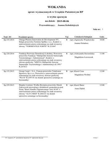 WOKANDA spraw wyznaczonych w Urzędzie Patentowym RP w trybie spornym na dzień: 2015-08-06 Przewodniczący: Joanna Kołodziejczyk Sala nr: 1 Sygn. akt Przedmiot sprawy Sp.335.2014 Omega Pharma Innowation & Development NV, Belgia przeciwko Farmina Spółka z o.o., Kraków o unieważnienie prawa ochronnego na znak towarowy słowny "TORMENTILE FORTE" R.221047 R Fundacja Rozwoju Demokracji Lokalnej, Warszawa przeciwko Fundacja "Małopolski Instytut Samorządu Terytorialnego i Administracji", Kraków o unieważnienie prawa ochronnego na znak towarowy słowno-graficzny "MISTiA Małopolski Instytut Samorządu Terytorialnego i Administracji od 1991" R.267613 R Group Canal + S.A., Francja przeciwko Totalizator Sportowy Sp.z o.o, Warszawa o unieważnienie prawa ochronnego na znak towarowy słowno-graficzny "PLUS" R.259718 /na skutek sprzeciwu uznanego za bezzasadny/ R Bioplax Limited, Wielka Brytania przeciwko Marek Zakrzewski prowadzący działalność gospodarczą pod firmą "Biuro Handlu Zagranicznego Atos M.M" o unieważnienie prawa ochronnego na znak towarowy słowny "ALFA MED" R.266333 /na skutek sprzeciwu uznanego za bezzasadny/ R Sp.320.2014 Sp.153.2015 Sp.229.2015 R - rozprawa, P - posiedzenie niejawne, O - ogłoszenie decyzji. Typ Członkowie Kolegium Godz. (spr.) Agnieszka Więckowska 10:00 Joanna Dziadosz (spr.) Aleksandra Heromińska 11:00 Magdalena Ławreszuk (spr.) Karol Cena 12:00 Magdalena Wróbel (spr.) Karol Bator 13:00 Anna Dębek wersja 1