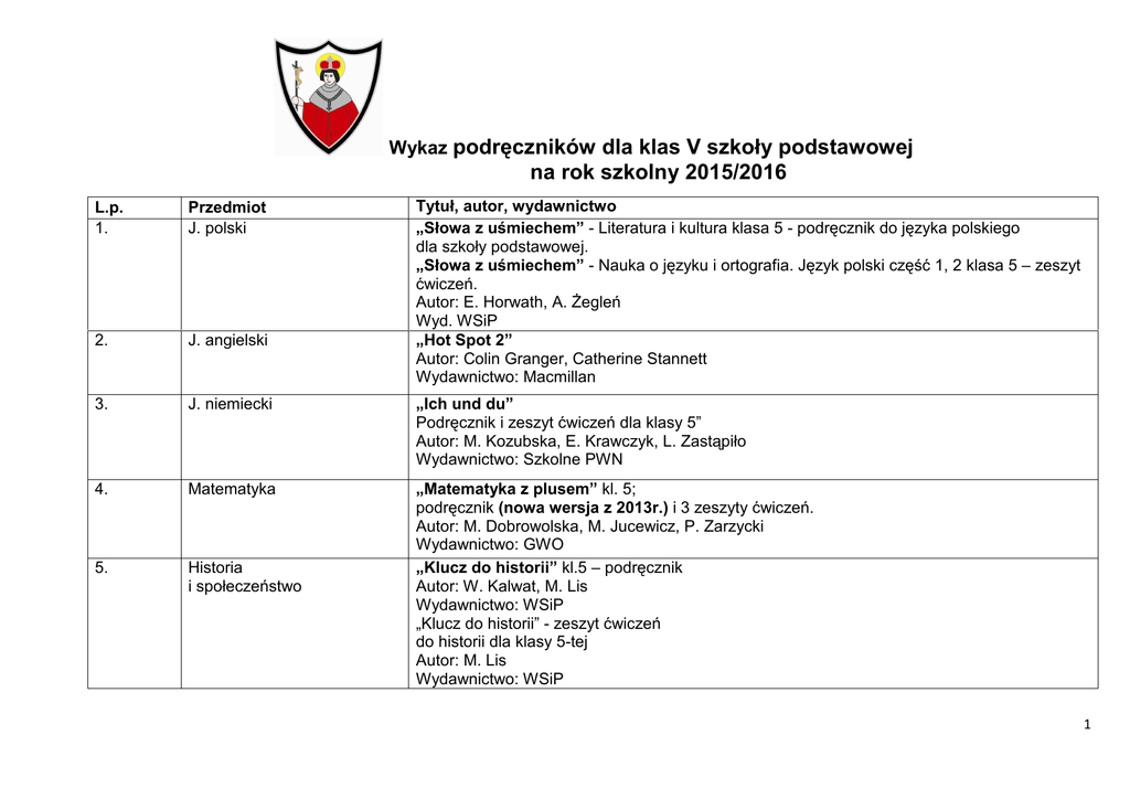 Wykaz podręczników dla klas V szkoły podstawowej na rok szkolny 2015/2016 Tytuł, autor, wydawnictwo „Słowa z uśmiechem” - Literatura i kultura klasa 5 - podręcznik do języka polskiego dla szkoły podstawowej. „Słowa z uśmiechem” - Nauka o języku i ortografia. Język polski część 1, 2 klasa 5 – zeszyt ćwiczeń. Autor: E. Horwath, A. śegleń Wyd. WSiP „Hot Spot 2” Autor: Colin Granger, Catherine Stannett Wydawnictwo: Macmillan L.p. 1. Przedmiot J. polski 2. J. angielski 3. J. niemiecki „Ich und du” Podręcznik i zeszyt ćwiczeń dla klasy 5” Autor: M. Kozubska, E. Krawczyk, L. Zastąpiło Wydawnictwo: Szkolne PWN 4. Matematyka 5. Historia i społeczeństwo „Matematyka z plusem” kl. 5; podręcznik (nowa wersja z 2013r.) i 3 zeszyty ćwiczeń. Autor: M. Dobrowolska, M. Jucewicz, P. Zarzycki Wydawnictwo: GWO „Klucz do historii” kl.5 – podręcznik Autor: W. Kalwat, M. Lis Wydawnictwo: WSiP „Klucz do historii” - zeszyt ćwiczeń do historii dla klasy 5-tej Autor: M. Lis Wydawnictwo: WSiP 1 6. Przyroda 7. Plastyka 8. Zajęcia techniczne 9. Muzyka 10. Religia 11. Zajęcia komputerowe „Tajemnice przyrody”– podręcznik i zeszyt ćwiczeń Autor: J. Slósarczyk, R. Kozik, F. Szlajfer Wydawnictwo: Nowa Era Seria „Odkrywamy na nowo” Plastyka. Podręcznik dla klas IV - VI szkoły podstawowej Autor: M. Polkowska, L. Wyszkowska Wydawnictwo: OPERON (kontynuacja podręcznika z kl. 4) „Zajęcia techniczne część techniczna” Autor: U. Białka Wydawnictwo: OPERON „Zajęcia techniczne część komunikacyjna” Autor: U. Białka, J. Chrabąszcz Wydawnictwo: OPERON „I gra muzyka” Podręcznik do muzyki dla kl.4-6 + zeszyt ćwiczeń Autor: A.Gromek, G.Klibach Wydawnictwo: Nowa Era (kontynuacja podręcznika i ćwiczeń) „Spotkania uBOGAcające” – podręcznik Autor: ks. dr K. Mielnicki Wydawnictwo: Jedność „Informatyka Europejczyka” klasa 5 podręcznik do zajęć komputerowych Edycja: Windows Autor: D. Kiałka, K. Kiałka, J. Klimczyk, J. Kutkowski, D. Kozaczko Wydawnictwo: Helion 2