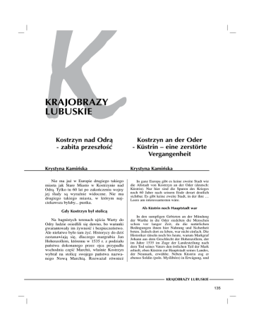 KRAJOBRAZY LUBUSKIE Kostrzyn nad Odr¹ - zabita przesz³oœæ Kostrzyn an der Oder - Küstrin – eine zerstörte Vergangenheit Krystyna Kamiñska Krystyna Kamiñska Nie ma ju¿ w Europie drugiego takiego miasta jak Stare Miasto w Kostrzynie nad Odr¹. Tylko tu 60 lat po zakoñczeniu wojny jej œlady s¹ wyraŸnie widoczne. Nie ma drugiego takiego miasta, w którym najciekawsza by³aby... pustka. In ganz Europa gibt es keine zweite Stadt wie die Altstadt von Kostrzyn an der Oder (deutsch: Küstrin). Nur hier sind die Spuren des Krieges noch 60 Jahre nach seinem Ende derart deutlich sichtbar. Es gibt keine zweite Stadt, in der ihre … Leere am interessantesten wäre. Gdy Kostrzyn by³ stolic¹ Na bagnistych terenach ujœcia Warty do Odry ludzie osiedlili siê dawno, bo warunki gwarantowa³y im ¿ywnoœæ i bezpieczeñstwo. Ale nie³atwo by³o tam ¿yæ. Historycy do dziœ zastanawiaj¹ siê, dlaczego margrabia Jan Hohenzollern, któremu w 1535 r. z podzia³u pañstwa dokonanego przez ojca przypad³a wschodnia czêœæ Marchii, w³aœnie Kostrzyn wybra³ na stolicê swojego pañstwa nazwanego Now¹ Marchi¹. Rozwa¿a³ równie¿ Als Küstrin noch Hauptstadt war In den sumpfigen Gebieten an der Mündung der Warthe in die Oder siedelten die Menschen schon vor langer Zeit, da die natürlichen Bedingungen ihnen hier Nahrung und Sicherheit boten. Jedoch dort zu leben, war nicht einfach. Die Historiker rätseln noch bis heute, warum Markgraf Johann aus dem Geschlecht der Hohenzollern, der im Jahre 1535 im Zuge der Landesteilung nach dem Tod seines Vaters den östlichen Teil der Mark erhielt, eben Küstrin zur Hauptstadt seines Landes, der Neumark, erwählte. Neben Küstrin zog er ebenso Soldin (poln. Myœlibórz) in Erwägung, und KRAJOBRAZY LUBUSKIE 135 lokalizacjê siedziby w Myœliborzu, a gdyby tak siê sta³o, historia Kostrzyna by³aby ca³kiem inna. Wybra³ jednak Kostrzyn, bo mia³ nadziejê na wysokie c³a, jakie bêd¹ mu p³aciæ kupcy sp³awiaj¹cy swoje towary Wart¹ i Odr¹. I tak siê sta³o. Wszed³ do historii jako Jan Kostrzyñski, doskona³y gospodarz, który swoj¹ potêgê zbudowa³ na c³ach i podatkach. Za³o¿y³ w mieœcie instytucje rz¹dowe najwy¿szego szczebla, obejmuj¹ce m.in. wymiar sprawiedliwoœci, stosunki lenne, wojskowoœæ, pobór podatków. Przez pierwsze dwa lata wzniesiono dla ksiêcia zamek dzie³o renesansowej sztuki. Po nim margrabia Jan zleci³ wybudowanie jednej z najnowoczeœniejszych i najpotê¿niejszych twierdz tamtych czasów. Budowa fortyfikacji trwa³a od 1537 do 1568 roku. Autorem projektu i twórc¹ twierdzy by³ w³oski in¿ynier Francesco Chiaramella z Gandino. Jego dzie³o ukoñczy³ inny in¿ynier z W³och - hrabia Roch Guerrini-Linari, budowniczy fortyfikacji Drezna. Powsta³a jedna z najwiêkszych twierdz w Europie, zdobyta dopiero w 1945 r. przez wojska radzieckie. Napoleon nie móg³ wyjœæ z podziwu dla twierdzy, a zobaczy³ j¹ od wewn¹trz tylko dlatego, ¿e komendant po prostu stchórzy³ i j¹ podda³. Nawet dziœ imponuje myœl techniczna dawnych budowniczych i ich sztuka murarska, choæ z twierdzy przetrwa³y tylko: fragmenty murów obronnych, Brama Berliñska, Brama Chy¿añska, dwa raweliny, trzy bastiony, fosy wewnêtrzne oraz ruiny budynków i zamku. Jan Kostrzyñski rz¹dzi³ Now¹ Marchi¹ do 1571 r. Pozostawi³ dobrze zorganizowane i zasobne pañstwo, tyle ¿e bez mêskiego potomka. Po jego œmierci Nowa Marchia zosta³a ponownie po³¹czona z Marchi¹ i stolica wróci³a do Berlina. W twierdzy kostrzyñskiej pozosta³o wojsko. Pruski rygor Za spraw¹ króla Fryderyka Wilhelma I kostrzyñska twierdza sta³a siê symbolem pruskiej mentalnoœci i dyscypliny. W 1730 roku jego 17. letni wówczas syn, póŸniejszy Fryderyk II Wielki, zbuntowa³ siê przeciwko 136 wenn die Wahl auf diese Ortschaft gefallen wäre, so dürfte die Geschichte Kostrzyns wohl ganz anders verlaufen sein. Er entschied sich allerdings für Küstrin und dachte dabei sicherlich an die hohen Zolleinnahmen, die er von den Kaufleuten, die ihre Ware auf der Warthe und auf der Oder verschifften, einzutreiben hoffte. Und so geschah es dann auch. Er ist in die Geschichte als Johann von Küstrin, ein exzellenter Landesherr, eingegangen, der seine Machtstellung auf den einkömmlichen Zöllen und Steuern begründete. Er richtete in der Stadt Verwaltungsinstitutionen höchster Instanz, die u.a. die Justiz, die Lehnsbeziehungen, das Heer und die Steuererhebung regelten, ein. In den ersten beiden Jahren der Regentschaft des Markgrafen von Brandenburg-Küstrin wurde für ihn ein Schloss im Renaissancestil erbaut. Danach ließ Johann eine der modernsten und mächtigsten Festungen der damaligen Zeit errichten. Die Arbeiten an den Befestigungsanlagen dauerten zwischen 1537 und 1568 an. Architekt und Erbauer der Festung war der italienische Baumeister Francesco Chiaramella de Gandino. Sein Werk wurde dann jedoch von einem anderen italienischen Festungsbaumeister abgeschlossen, Rochus Guerini Graf zu Lynar, der ebenfalls die Festungsbauten in Dresden errichtet hatte. So entstand eine der größten Festungsanlagen in Europa, die erst 1945 von der Roten Armee bezwungen werden sollte. Napoleon war voll der Bewunderung über dieses Meisterwerk der Festungsbaukunst, und von innen bekam er sie nur deshalb zu Gesicht, weil der Kommandant einfach ein Angsthase war und die Festung übergab. Sogar noch heute beeindruckt die technische Ideenvielfalt der alten Baumeister und deren Umsetzung, obgleich nur noch Teile der Wehrmauer, das Berliner Tor, das Kietzer Tor, zwei Raveline, drei Bastionen, der Innengraben sowie Gebäude- und Schlossruinen erhalten geblieben sind. Johann von Küstrin regierte die Neumark bis in das Jahr 1571. Er hinterließ ein gut organisiertes und einträgliches Land, nur leider ohne einen männlichen Nachkommen. So wurde die Neumark nach dem Tode des Landesherren wiederum der Mark Brandenburg angegliedert, und die Hauptstadt kehrte nach Berlin zurück. In de