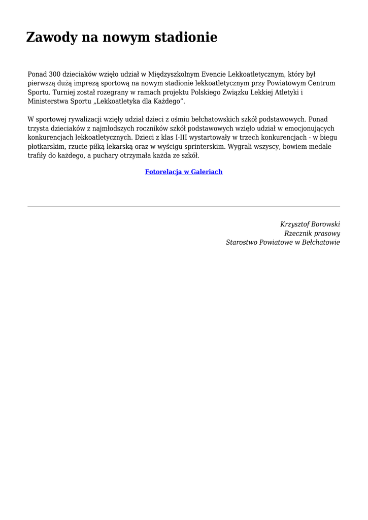 Zawody na nowym stadionie Ponad 300 dzieciaków wzięło udział w Międzyszkolnym Evencie Lekkoatletycznym, który był pierwszą dużą imprezą sportową na nowym stadionie lekkoatletycznym przy Powiatowym Centrum Sportu. Turniej został rozegrany w ramach projektu Polskiego Związku Lekkiej Atletyki i Ministerstwa Sportu „Lekkoatletyka dla Każdego”. W sportowej rywalizacji wzięły udział dzieci z ośmiu bełchatowskich szkół podstawowych. Ponad trzysta dzieciaków z najmłodszych roczników szkół podstawowych wzięło udział w emocjonujących konkurencjach lekkoatletycznych. Dzieci z klas I-III wystartowały w trzech konkurencjach - w biegu płotkarskim, rzucie piłką lekarską oraz w wyścigu sprinterskim. Wygrali wszyscy, bowiem medale trafiły do każdego, a puchary otrzymała każda ze szkół. Fotorelacja w Galeriach Krzysztof Borowski Rzecznik prasowy Starostwo Powiatowe w Bełchatowie