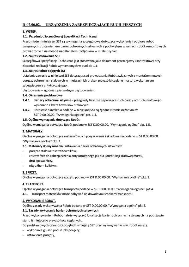 D-07.06.02. URZĄDZENIA ZABEZPIECZAJĄCE RUCH PIESZYCH 1. WSTĘP. 1.1. Przedmiot Szczegółowej Specyfikacji Technicznej Przedmiotem niniejszej SST są wymagania szczegółowe dotyczące wykonania i odbioru robót związanych z ustawieniem barier ochronnych sztywnych z pochwytem w ramach robót remontowych prowadzonych na moście nad Kanałem Bydgoskim w m. Kruszyniec. 1.2. Zakres stosowania SST Szczegółowa Specyfikacja Techniczna jest stosowana jako dokument przetargowy i kontraktowy przy zlecaniu i realizacji Robót wymienionych w punkcie 1.1. 1.3. Zakres Robót objętych SST Ustalenia zawarte w niniejszej SST dotyczą zasad prowadzenia Robót związanych z montażem nowych poręczy ochronnych stalowych w miejscach ich braku ( przyczółki ceglane mostu) z wykonaniem zabezpieczenia antykorozyjnego. Usytuowanie – zgodnie z pierwotnym usytuowaniem 1.4. Określenia podstawowe 1.4.1. Bariery ochronne sztywne - przegrody fizyczne separujące ruch pieszy od ruchu kołowego wykonane z kształtowników stalowych. 1.4.2. Pozostałe określenia podane w niniejszej SST są zgodne z zamieszczonymi w SST D.00.00.00. "Wymagania ogólne" pkt. 1.4. 1.5. Ogólne wymagania dotyczące Robót Ogólne wymagania dotyczące Robót podano w SST D.00.00.00. "Wymagania ogólne" pkt. 1.5. 2. MATERIAŁY. Ogólne wymagania dotyczące materiałów, ich pozyskiwania i składowania podano w ST D.00.00.00. "Wymagania ogólne" pkt. 2. 2.1. Materiały do wykonania i ustawienia barier ochronnych sztywnych poręcze stalowe z kształtowników , zestaw farb do zabezpieczenia antykorozyjnego jak dla konstrukcji kratowej mostu, drut spawalniczy. nity z łbem kulistym. 3. SPRZĘT. Ogólne wymagania dotyczące sprzętu podano w SST D.00.00.00. "Wymagania ogólne" pkt. 3. 4. TRANSPORT. Ogólne wymagania dotyczące transportu podano w SST D.00.00.00. "Wymagania ogólne" pkt.4. 4.1. Transport materiałów może odbywać się dowolnymi środkami transportu. 5. WYKONANIE ROBÓT. Ogólne zasady wykonywania Robót podano w SST D.00.00.00. "Wymagania ogólne" pkt.5. 5.1. Zasady wykonania barier ochronnych sztywnych Przed wykonywaniem Robót należy wytyczyć lokalizację barier ochronnych sztywnych na podstawie stanu istniejącego przyczółków ceglanych. Do podstawowych czynności objętych niniejszą SST przy wykonywaniu ww. robót należą: wykonanie gniazd pod słupki poręczy, ustawienie poręczy, 1 Gniazda pod poręcze powinny mieć wymiary w planie co najmniej o 20 cm większe od wymiarów słupka. Przed umieszczeniem poręczy w otworze, do jej dolnej części należy przyspawać płytkę z blachy o grubości 5 10 cm dla lepszej stateczności i uniemożliwienia wyciągnięcia. 6. KONTROLA JAKOŚCI ROBÓT. Ogólne zasady kontroli jakości Robót podano w SST D.00.00.00. "Wymagania ogólne" pkt. 6. 6.1. W trakcie wykonywania Robót kontroli podlega: - równomierność rozstawienia i ustawienie poręczy ochronnych sztywnych w linii wg , - estetyka malowania. Podczas wykonywania Robót Wykonawca zwróci szczególną uwagę na właściwą głębokość gniazd. 7. OBMIAR ROBÓT. Ogólne zasady obmiaru Robót podano w SST D.00.00.00. "Wymagania ogólne" pkt. 7. 7.1. Jednostka obmiarowa Jednostka obmiarową jest 1 m (metr) ustawienia poręczy ochronnej sztywnej. 8. ODBIÓR ROBÓT. Ogólne zasady odbioru Robót podano w SST D.00.00.00. "Wymagania ogólne" pkt. 8. 8.1. Roboty zostaną odebrane na podstawie oceny wizualnej ustawionej poręczy ochronnej sztywnej. 9. PODSTAWA PŁATNOŚCI. Ogólne ustalenia dotyczące podstawy płatności podano w SST D.00.00.00. "Wymagania ogólne" pkt. 9. 9.1. Cena wykonania Cena wykonania 1 m zamontowanej poręczy ochronnej sztywnej obejmuje: prace pomiarowe, zakup i dostarczenie materiałów, zainstalowanie poręczy ochronnej sztywnej . 10. PRZEPISY ZWIĄZANE. 1. PN-B-19701 Cement. Cement powszechnego użytku. Skład, wymagania i ocena zgodności. 2. PN-B-06712 Kruszywo mineralne do betonu. 3. "Instrukcja o znakach drogowych pionowych" 4. PN-B-06250 Beton zwykły. 5. PN-B-06251 Roboty betonowe i żelbetowe. Wymagania techniczne. 2