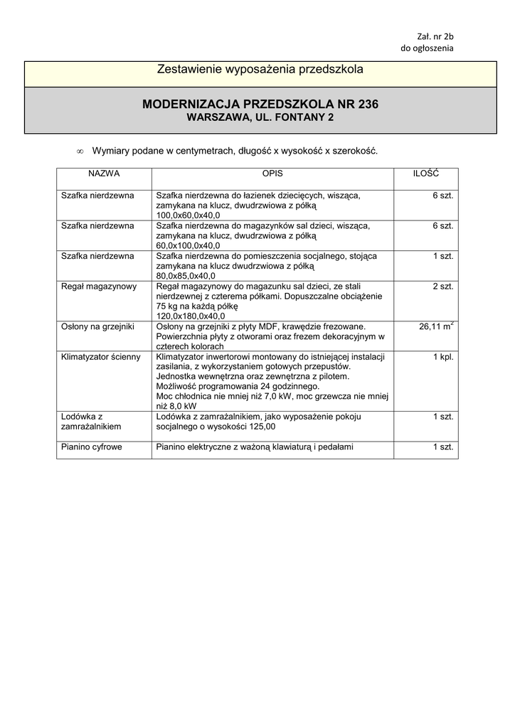 Zał. nr 2b - zestawienie wyposażenia przedszkola ul.Fontany 2