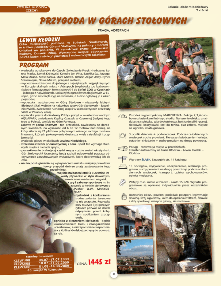 kolonie, obóz młodzieżowy KOTLINA KŁODZKA CZECHY 9 -16 lat PRZYGODA W GÓRACH STOŁOWYCH PRAGA, ADRSPACH ZKI LEWIN KŁODpoło żona w Sudetach Środkowych, Cicha miejscowość mi na północy a Górami owy Stoł mi Góra y iędz w kotlinie pom ie znane uzdrowiska: dztw sąsie Orlickimi na południu. W arzone miejsce odpoczynku Kudowa, Duszniki Zdrój. Wym a i malowniczych zakątków. ietrz pow pośród lasów, świeżego PROGRAM - wycieczka autokarowa do Czech. Zwiedzanie Pragi: Hradczany, Loreta Praska, Zamek Królewski, Katedra św. Wita, Bazylika św. Jerzego, Mała Strana, Most Karola, Stare Miasto, Ratusz, Zegar Orloy, Rynek Staromiejski, Nowe Miasto, przejazd metrem, - wycieczka autokarowa do jednego z największych i najpiękniejszych w Europie skalnych miast - Adrspach (wędrówka po bajkowym świecie fantastycznych form skalnych) i do Safari ZOO w Czechach - jednego z największych, unikalnych ogrodów zoologicznych w Europie, gdzie zwierzęta żyją na wolności, a ludzie oglądają je z okien pojazdów, - wycieczka autokarowa w Góry Stołowe - niezwykły labirynt Błędnych Skał, wejście na najwyższy szczyt Gór Stołowych - Szczeliniec Wielki, zwiedzanie ruchomej szopki w Wambierzycach oraz Huty Szkła w Polanicy Zdrój, - wycieczka piesza do Kudowy Zdrój - pobyt w miasteczku wodnym AQUAPARK, zwiedzanie Kaplicy Czaszek w Czermnej (jedynej tego typu w Polsce), wejście na Górę Parkową, - zabawa w parku linowym - tor przeszkód, zawieszony na dorodnych świerkach, na wysokości od 6 do 12 metrów nad ziemią, na który składa się 21 platform połączonych różnego rodzaju mostami linowymi, których pokonywanie dostarcza wiele satysfakcji i przyjemności, - wycieczki piesze w okolicach Lewina Kłodzkiego, - strzelanie z broni pneumatycznej i łuku - sport ten wymaga stalowych mięśni i nie lada sprytu, - poszukiwanie brakującej części mapy - gdzie został ukryty skarb Gór Stołowych? Uczestnicy będą szukali odpowiedzi poprzez odczytywanie zaszyfrowanych wskazówek, które doprowadzą ich do celu, - nauka posługiwania się wykrywaczem metalu- wszyscy prawdziwi łowcy przygód dobrze znają zastosowanie tego przedmiotu, - wejście na basen letni (4 x 30 min)- zawody pływackie w stylu dowolnym, zakończone rozdaniem nagród, - gry i zabawy sportowe m. in. zawody w tenisie stołowym o „Puchar O.W. MARYSIEŃKA”, - dyskoteki z konkursamitrudne zadania terenowe to nie wszystko. Rozrywka przy muzyce i jej gorących rytmach pozwoli na chwile odprężenia przed kolejnym spotkaniem z przygodą, - ognisko z pieczeniem kiełbasek - będzie ukoronowaniem trudu i zaangażowania uczestników, a niezapomniane wspomnienia z Kotliny Kłodzkiej zachęcą do powrotu za rok. Ośrodek wypoczynkowy MARYSIEŃKA. Pokoje 2,3,4-osobowe z łazienkami lub typu studio. Na terenie obiektu znajdują się: stołówka, sala dyskotekowa, boiska do piłki ręcznej, siatkówki, koszykówki, stół do tenisa, plac zabaw, miejsce na ognisko, wiata grillowa. 3 posiłki dziennie + podwieczorek. Podczas całodziennych wycieczek suchy prowiant. Pierwsze świadczenie - kolacja, ostatnie - śniadanie + suchy prowiant na drogę powrotną. Pociąg – rezerwacja miejsc w przedziałach. Transfer autokarowy na trasie Kłodzko – Lewin Kłodzki – Kłodzko. Wg trasy ŚLĄSK. Szczegóły str. 41 katalogu. 13 noclegów, wyżywienie, ubezpieczenie, realizacja programu, suchy prowiant na drogę powrotną i podczas całodziennych wycieczek, transport, opieka wychowawców, opieka medyczna. Wstępy m.in. metro w Pradze - około 15 CZK. Wydatki programowe są opłacane indywidualnie przez uczestników obozu. Uczestnicy obozu powinni posiadać: paszport, legitymację szkolną, strój kąpielowy, krem do opalania z filtrem, obuwie i strój sportowy, nakrycie głowy, kieszonkowe. terminy turnusów 04.07 -17.07.2009 KLEW1/08 18.07 -31.07.2009 /08 KLEW2 01.08 -14.08.2009 KLEW3/08 45 miejsc w turnusie CENA: 1445 zł 32