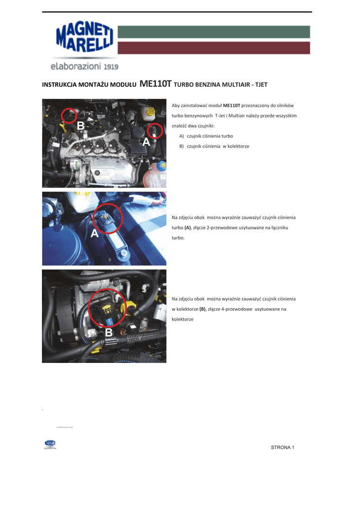 INSTRUKCJA MONTAŻU MODUŁU ME110T TURBO BENZINA MULTIAIR - TJET Aby zainstalowad moduł ME110T przeznaczony do silników turbo benzynowych T-Jet i Multiair należy przede wszystkim znaleźd dwa czujniki: A) czujnik ciśnienia turbo B) czujnik ciśnienia w kolektorze Na zdjęciu obok można wyraźnie zauważyd czujnik ciśnienia turbo (A), złącze 2-przewodowe usytuowane na łączniku turbo. Na zdjęciu obok można wyraźnie zauważyd czujnik ciśnienia w kolektorze (B), złącze 4-przewodowe usytuowane na kolektorze . eLaborazioni 1913 STRONA 1 Następnie odłączyd wtyczkę oryginalnej wiązki czujnika ciśnienia tubo i wykonad jej obejście jedną z dwóch par wtyczek wiązki ME199FG Patrz punkt (A) Następnie odłączyd wtyczkę oryginalnej wiązki czujnika ciśnienia w kolektorze wykonad jej obejście jedną z dwóch par wtyczek wiązki ME199FG Patrz punkt (B) Podłączyd moduł ME110Tki czarno-fioletowego złącza wiązki ME199FG Uwaga: Wszystkie zdjęcia mają cel czysto poglądowy. !!! UWAGA !!! Magneti Marelli Aftermaket Parts & Services S.p.A. przypomina, że dodatkowa centralka jest przeznaczona wyłącznie do zastosowao WYCZYNOWYCH, a więc można ją stosowad TYLKO do jazdy torowej, na torach prywatnych lub wyznaczonych, na drogach zamkniętych dla ruchu. Magneti Marelli Aftermaket Parts & Services S.p.A. nie ponosi żadnej odpowiedzialności za niewłaściwe użycie tego urządzenia. Użytkownik jest zawsze zobowiązany do przestrzegania kodeksu drogowego oraz obowiązujących przepisów. . Magneti Marelli Aftermaket Parts & Services S.p.A. nie ponosi żadnej odpowiedzialności za ewentualne szkody spowodowane przez samochód w wyniku wad wyrobu lub błędnego zainstalowania wyżej wymienionych wyrobów. eLaborazioni 1913 STRONA 2